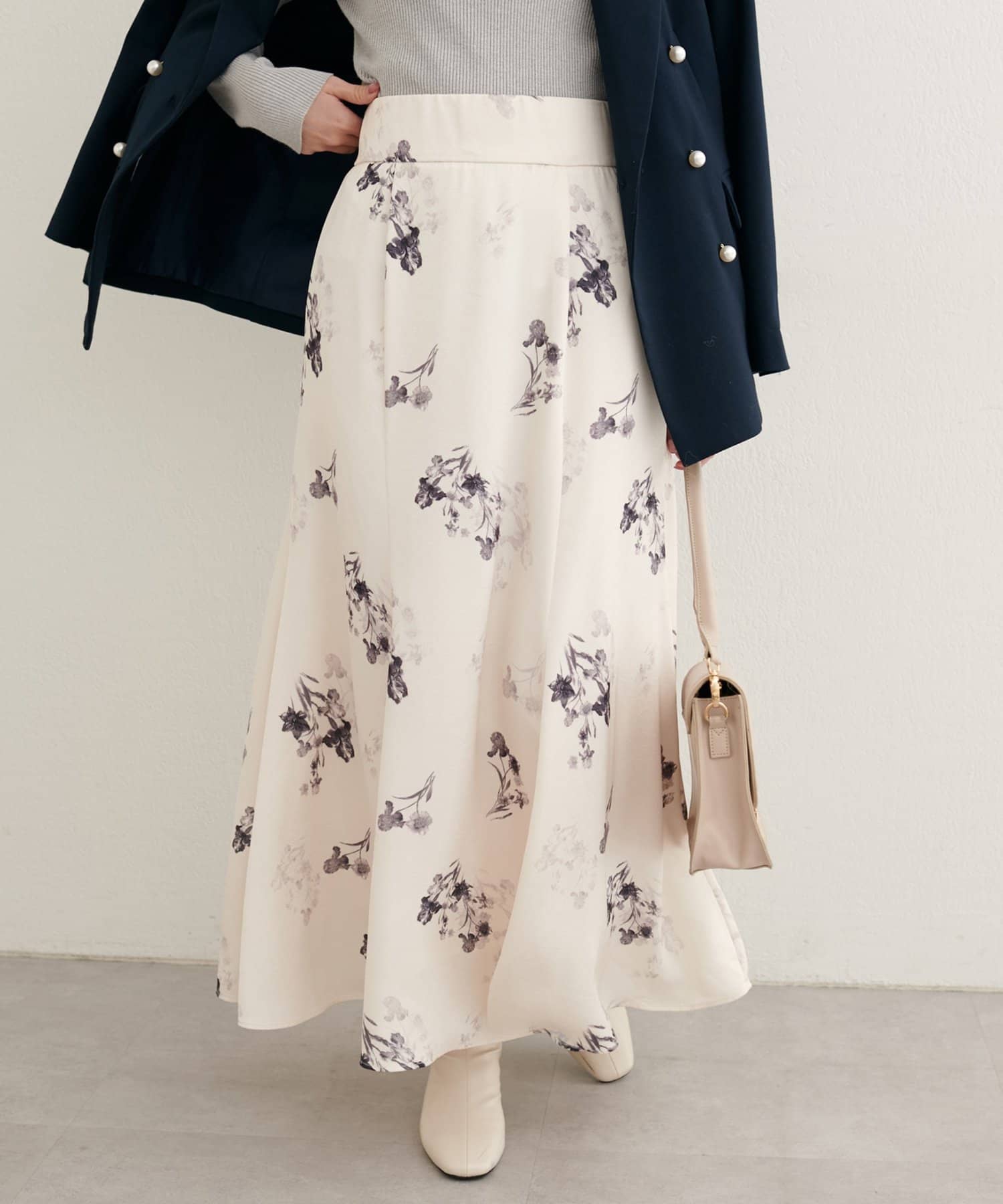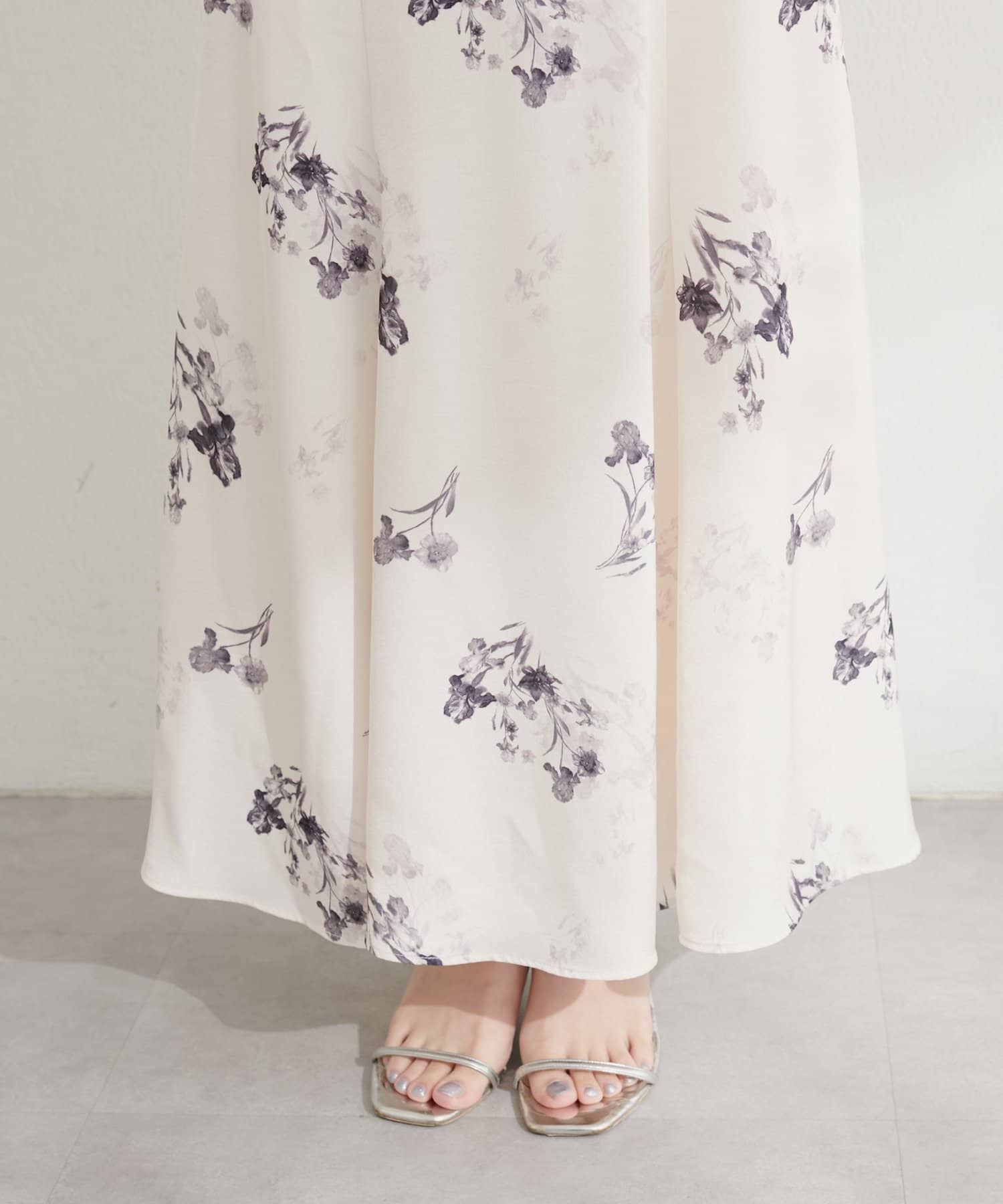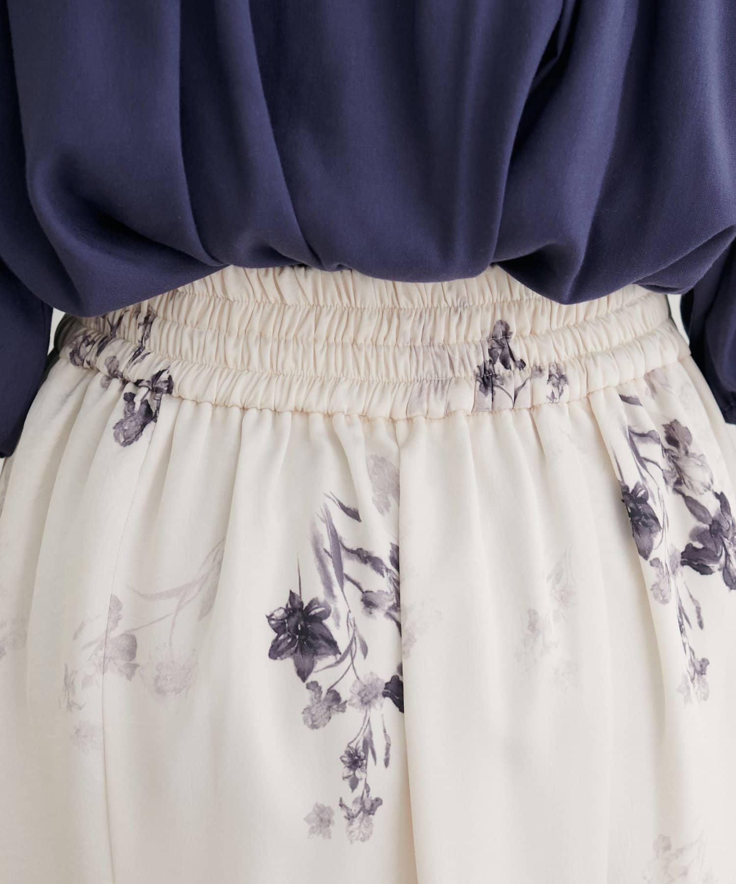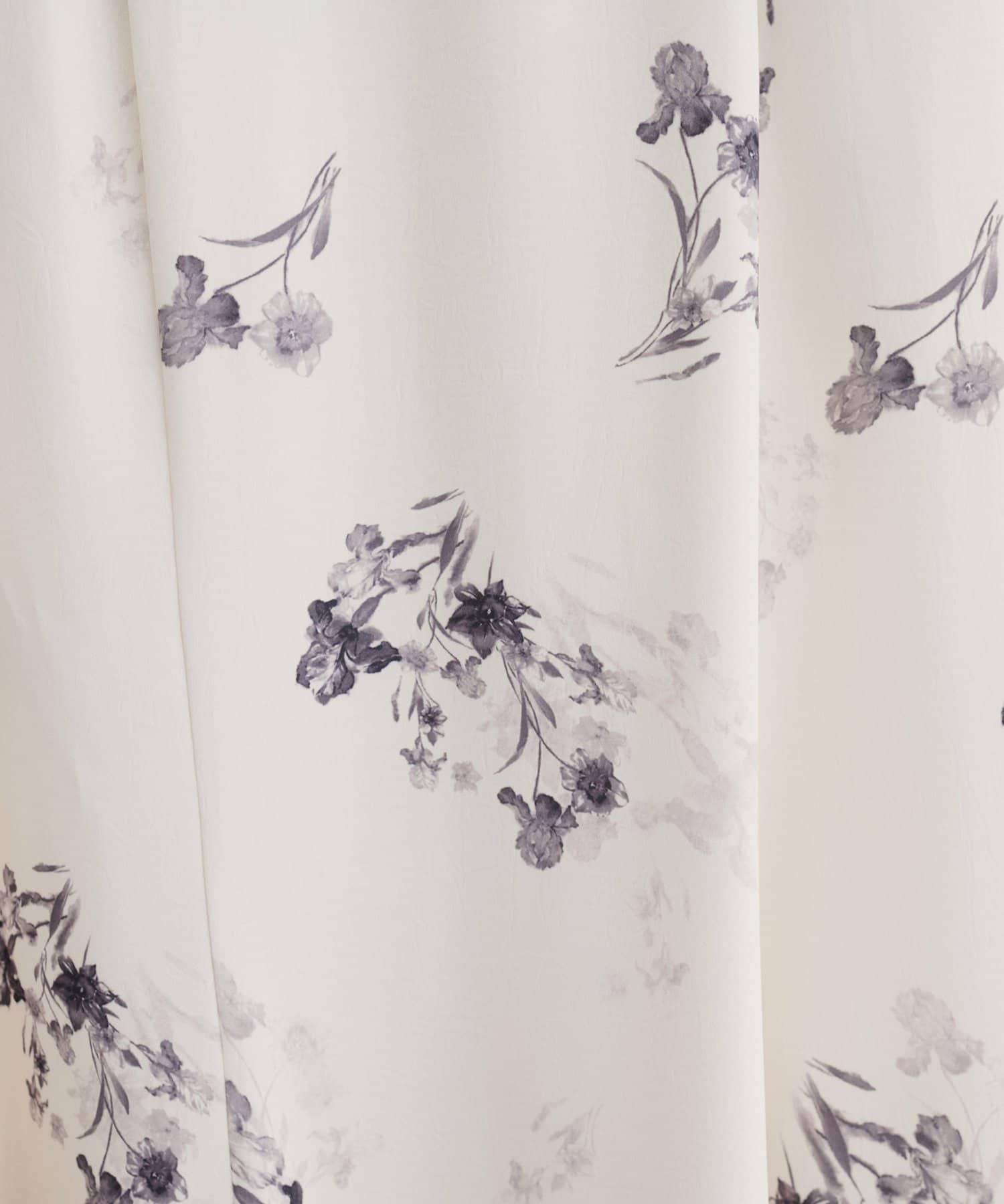 水彩画のような繊細なタッチで描かれたフラワープリントが、優雅で上品な雰囲気を演出。