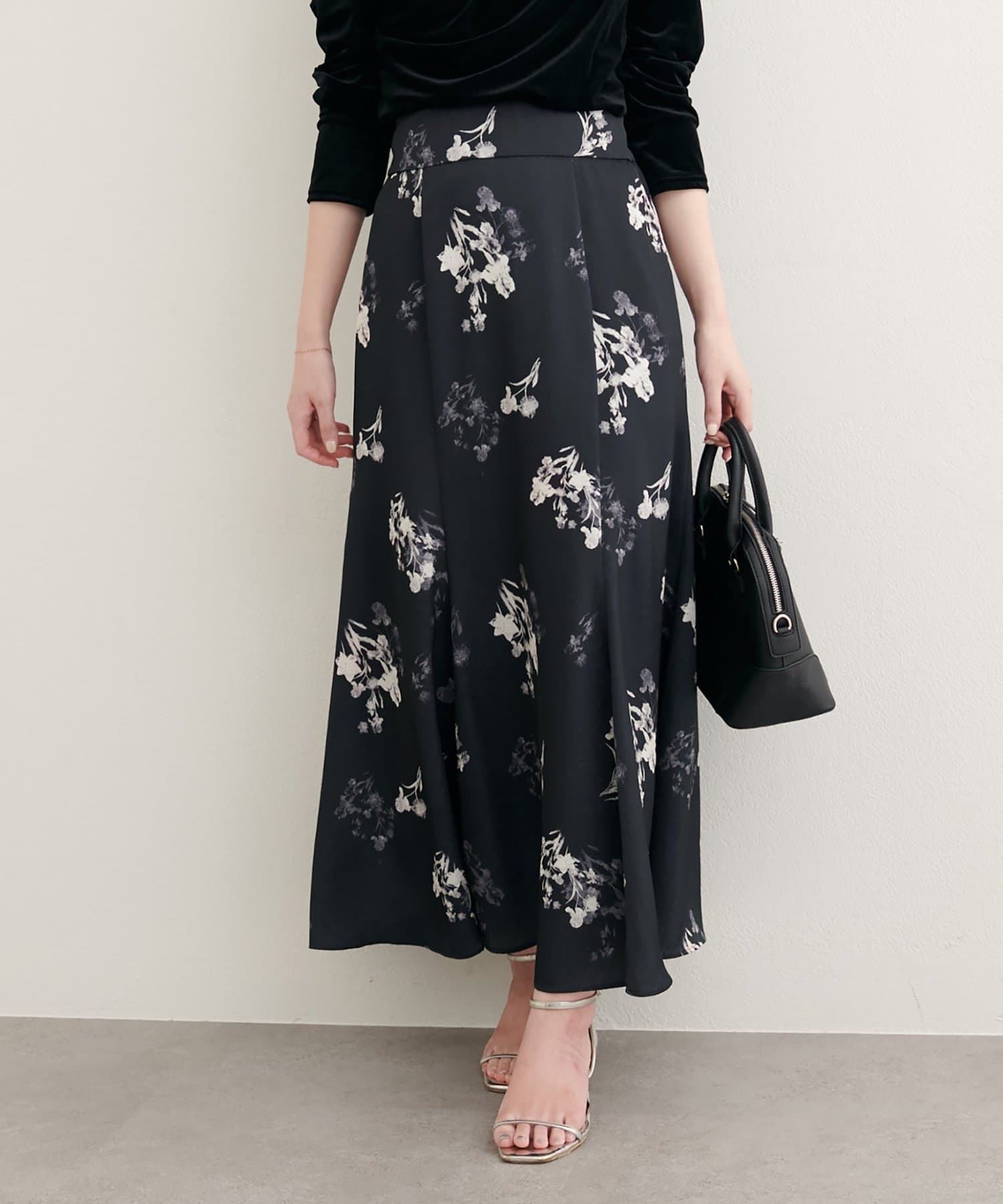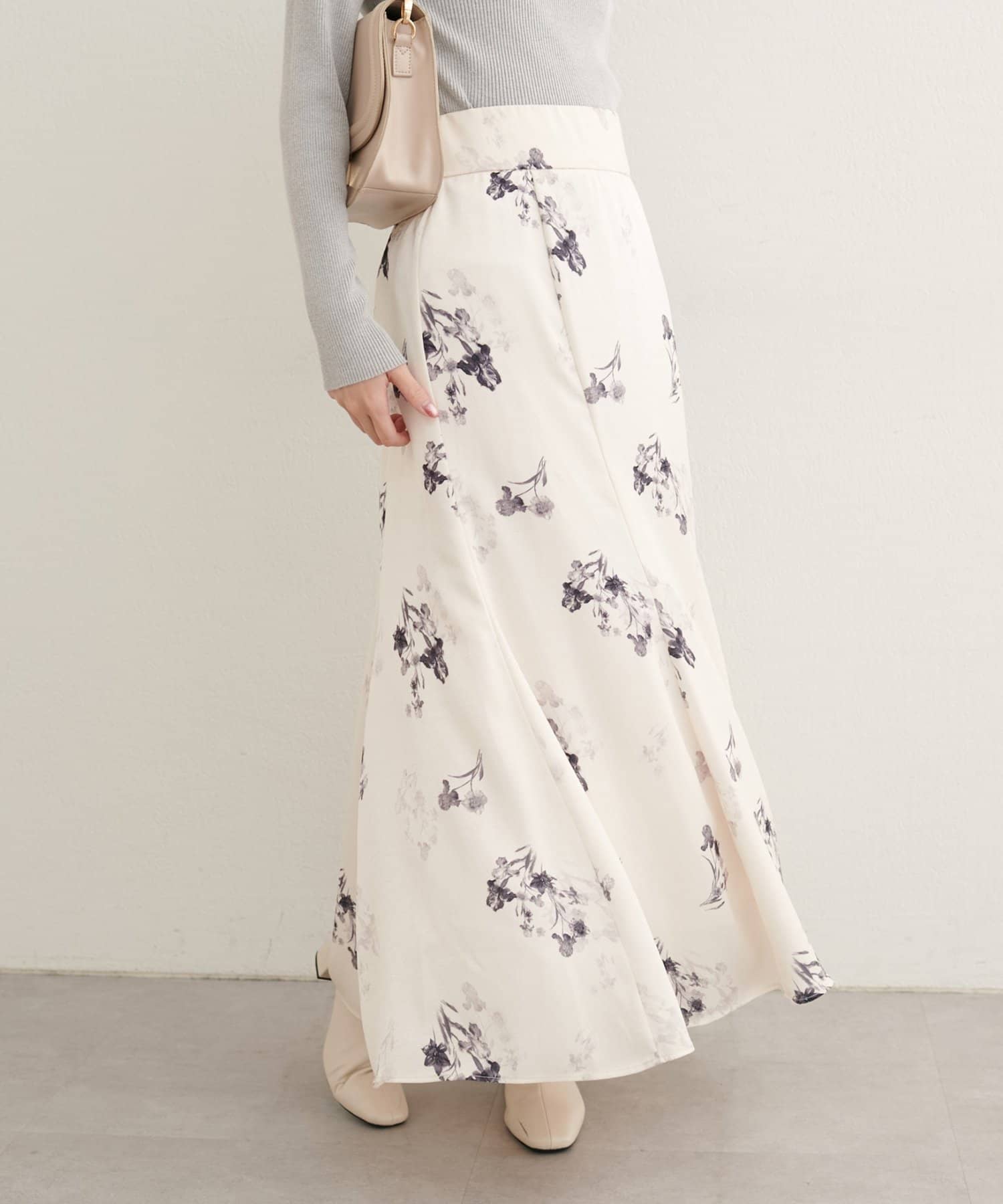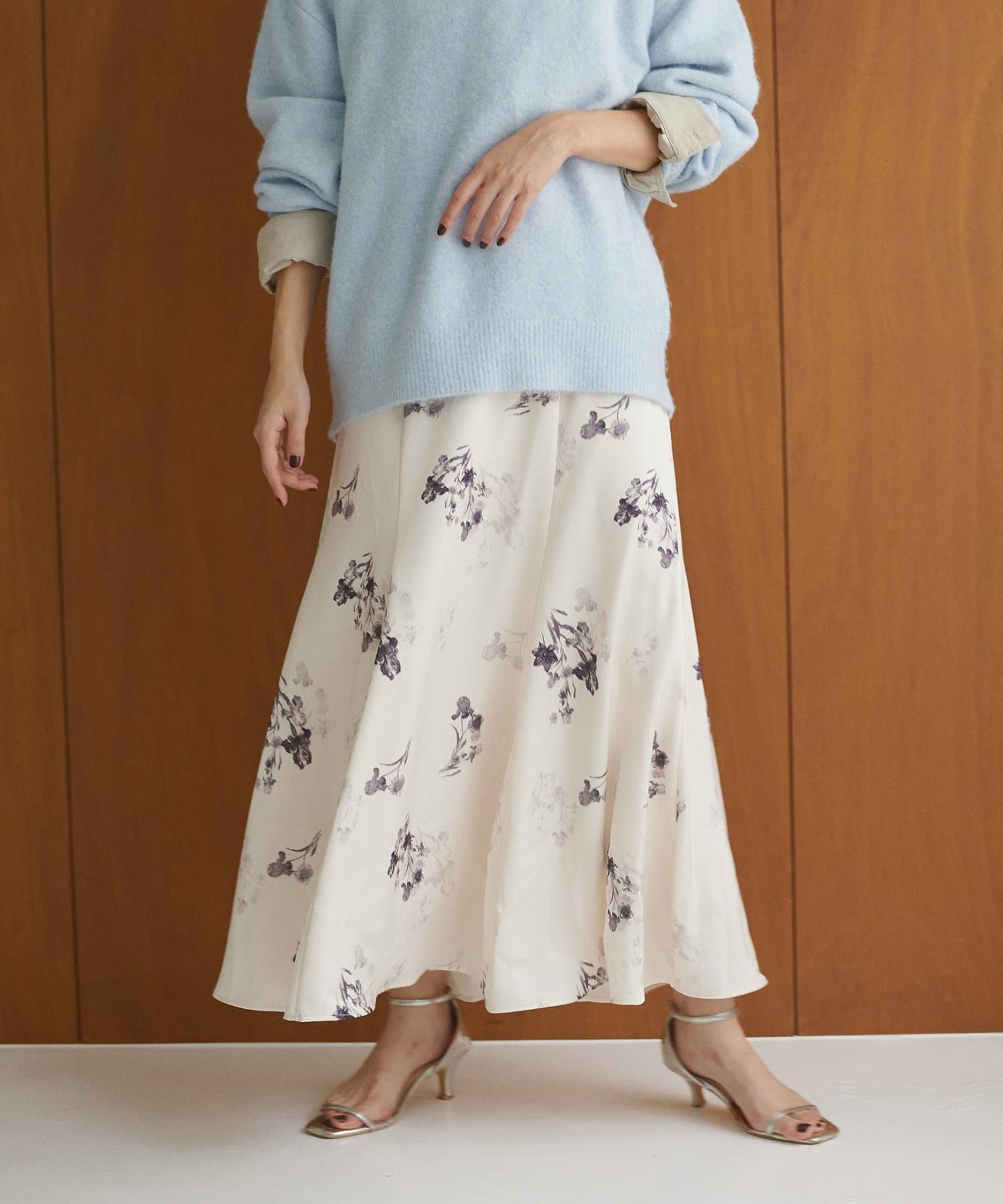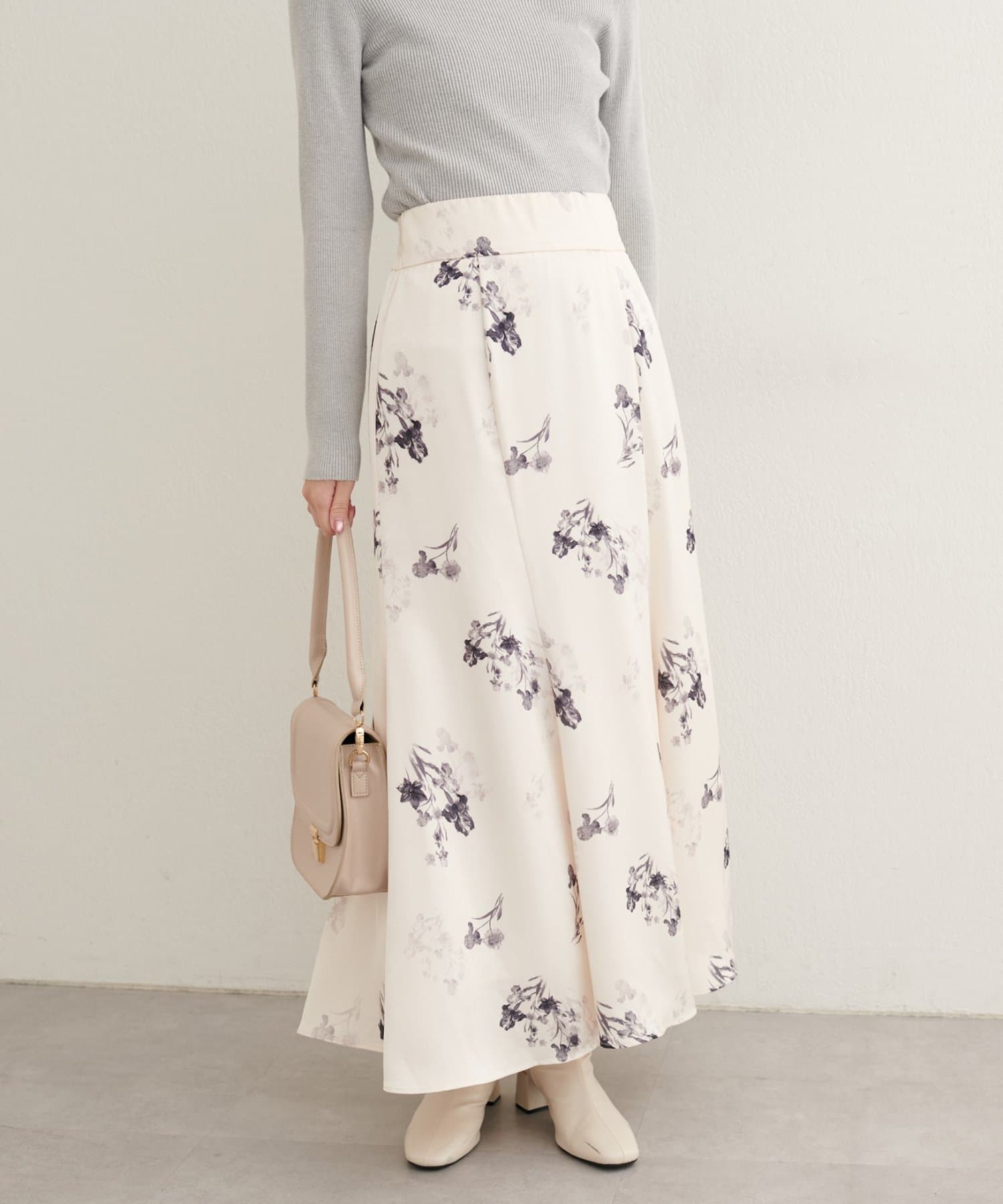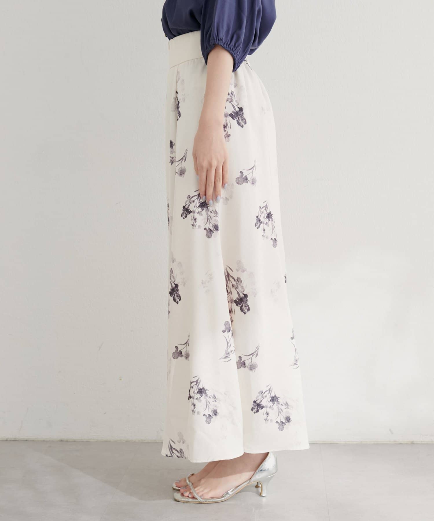 水彩画のような繊細なタッチで描かれたフラワープリントが、優雅で上品な雰囲気を演出。