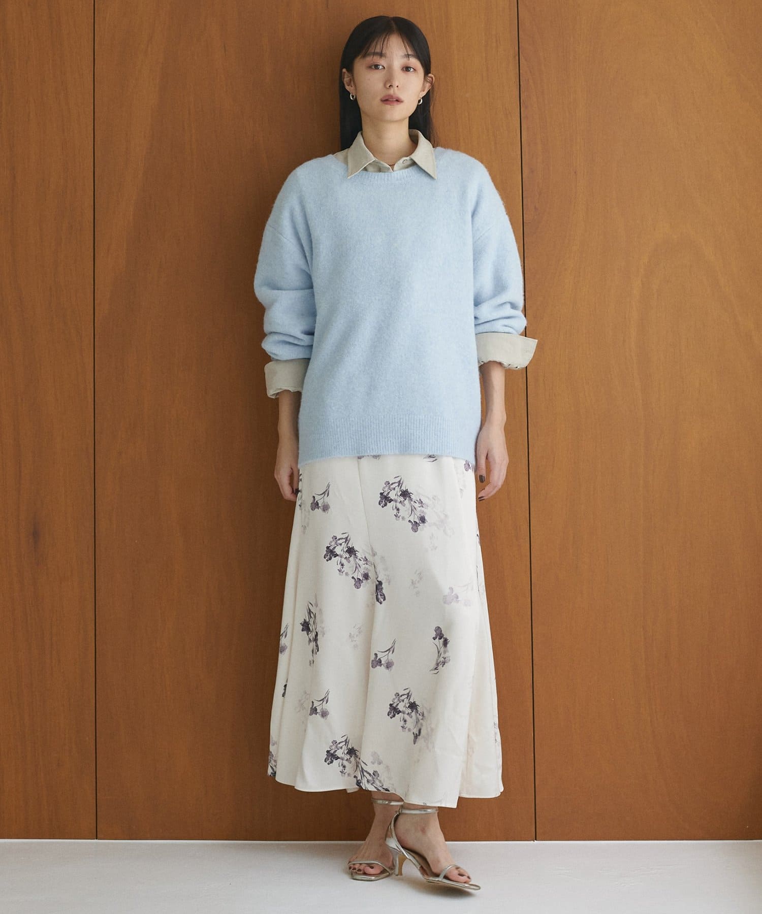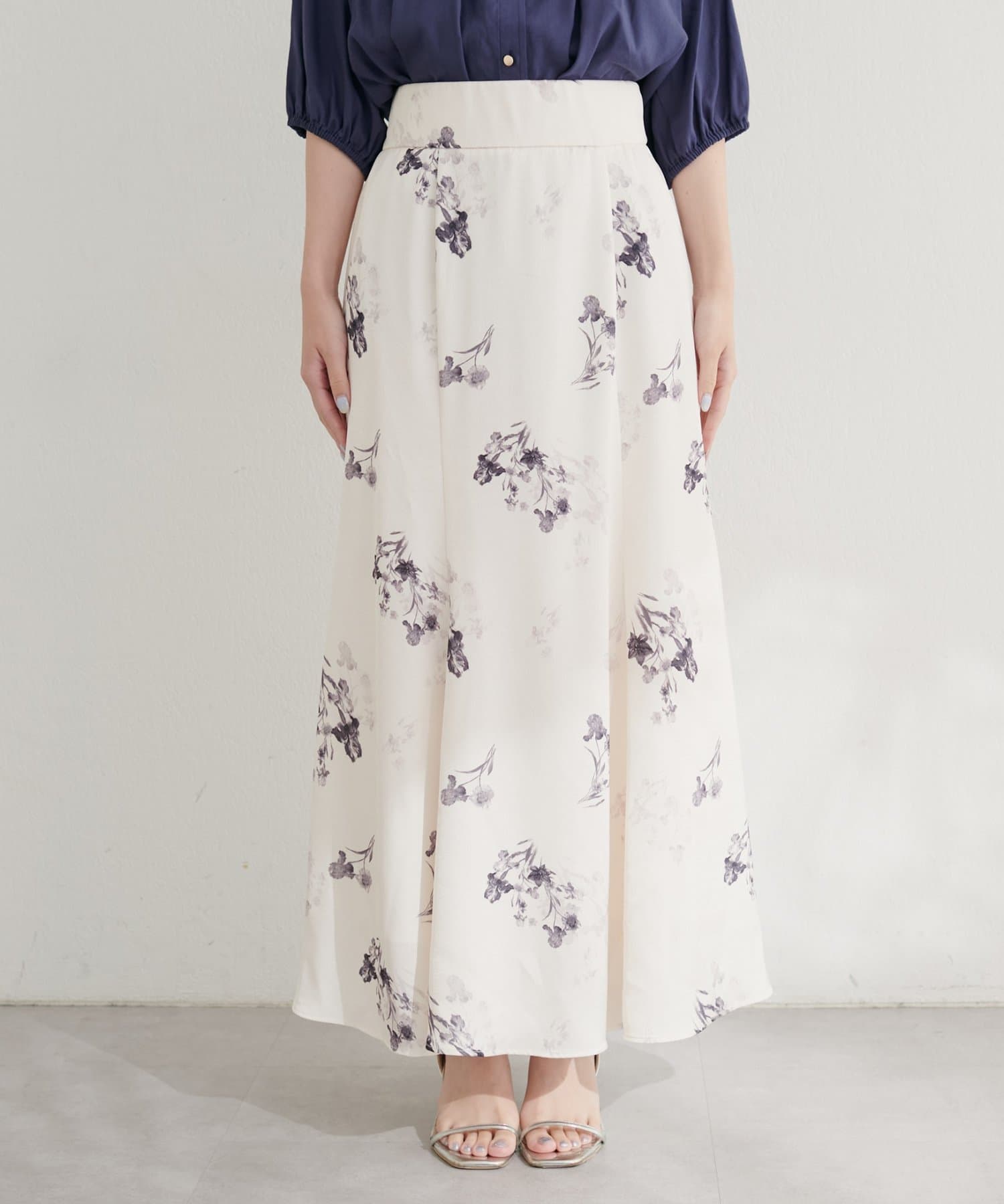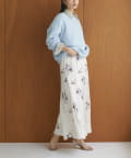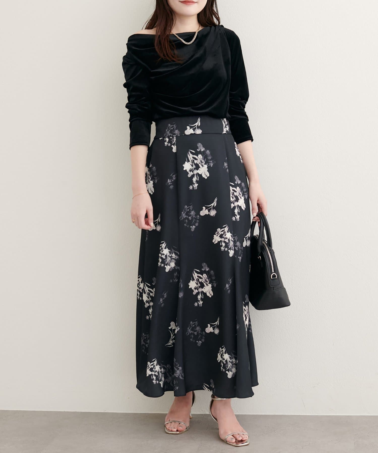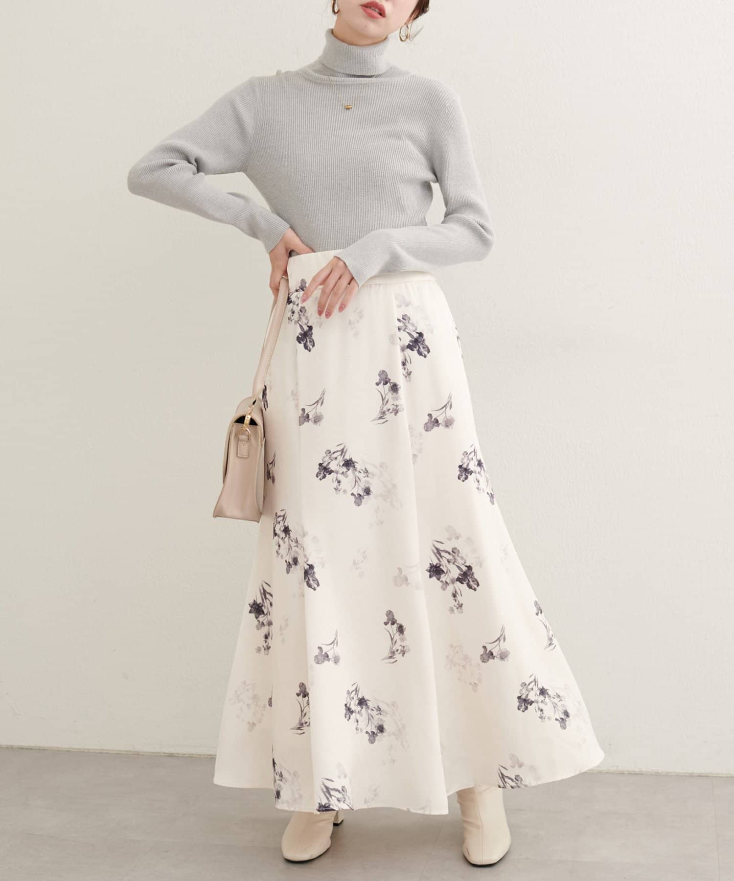 水彩画のような繊細なタッチで描かれたフラワープリントが、優雅で上品な雰囲気を演出。