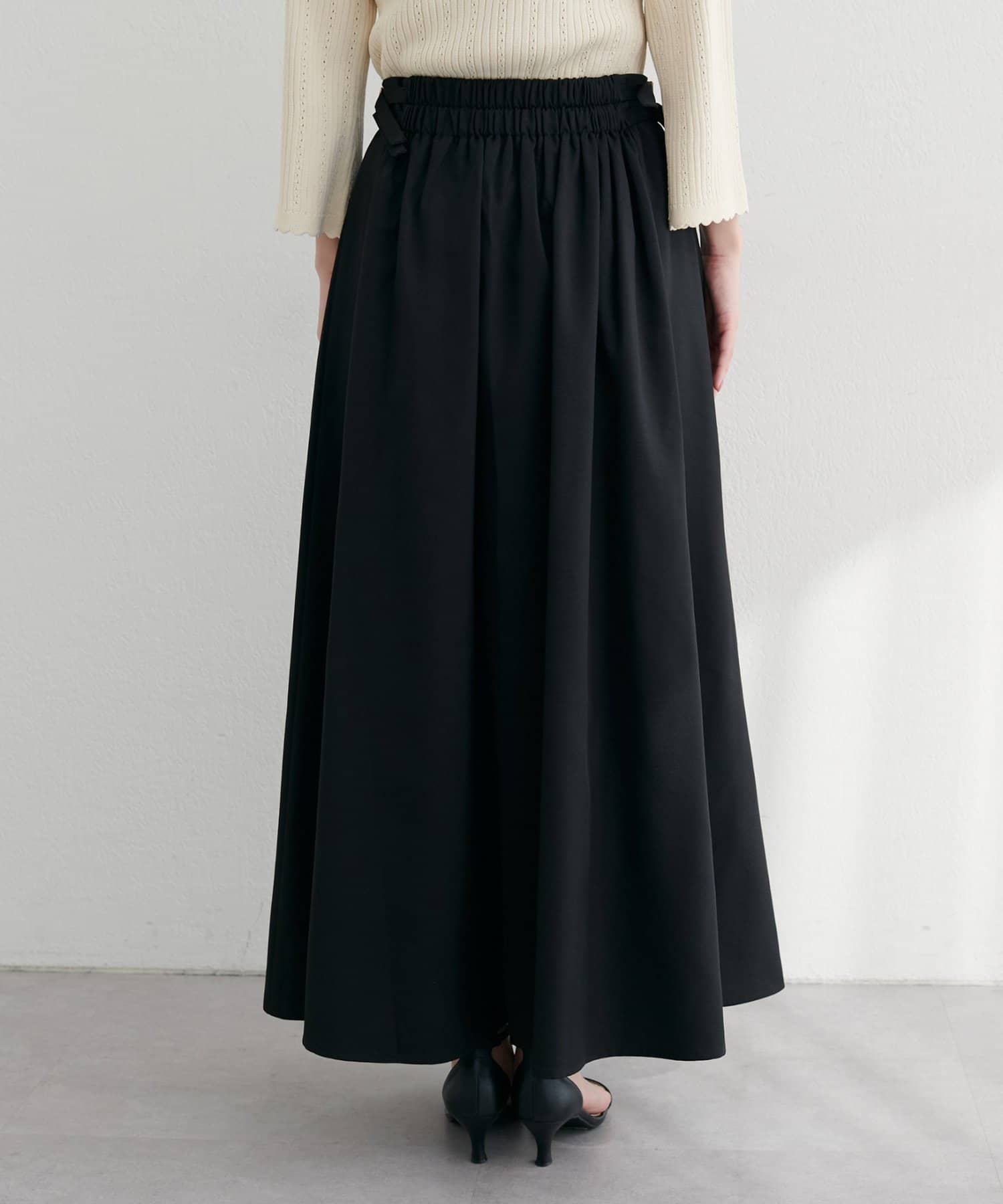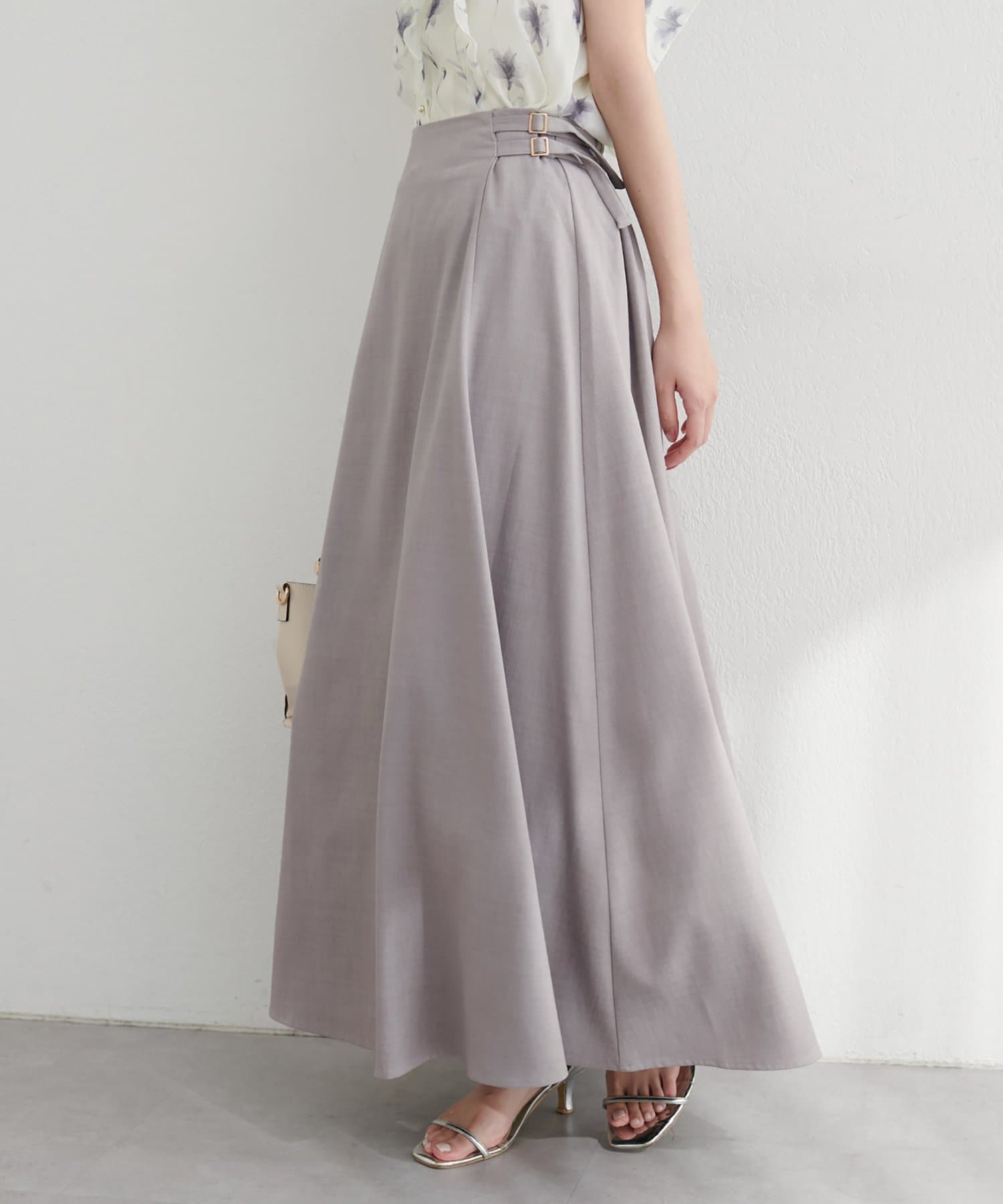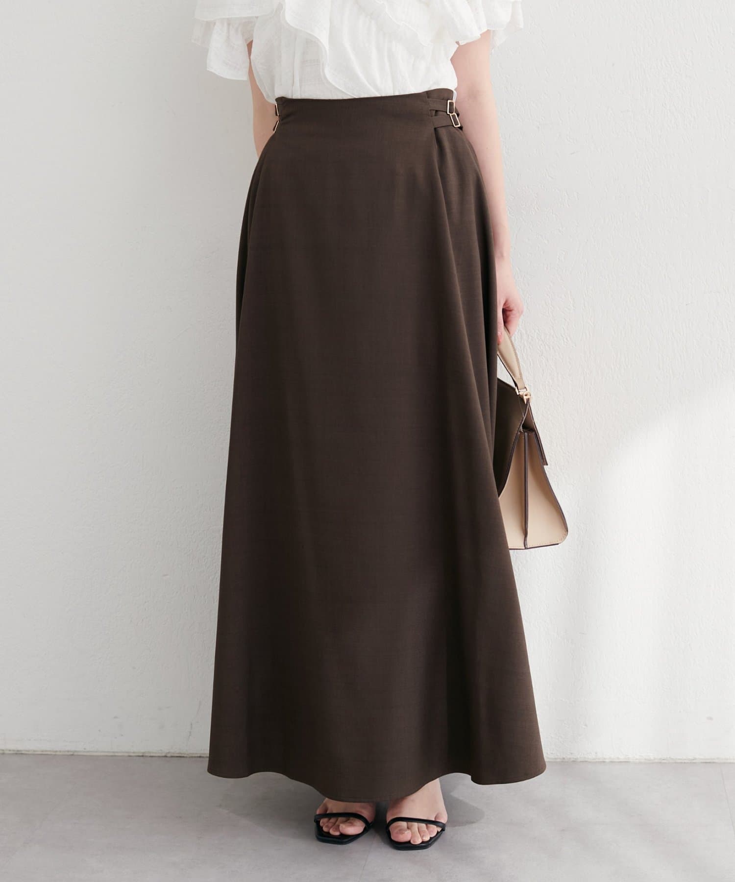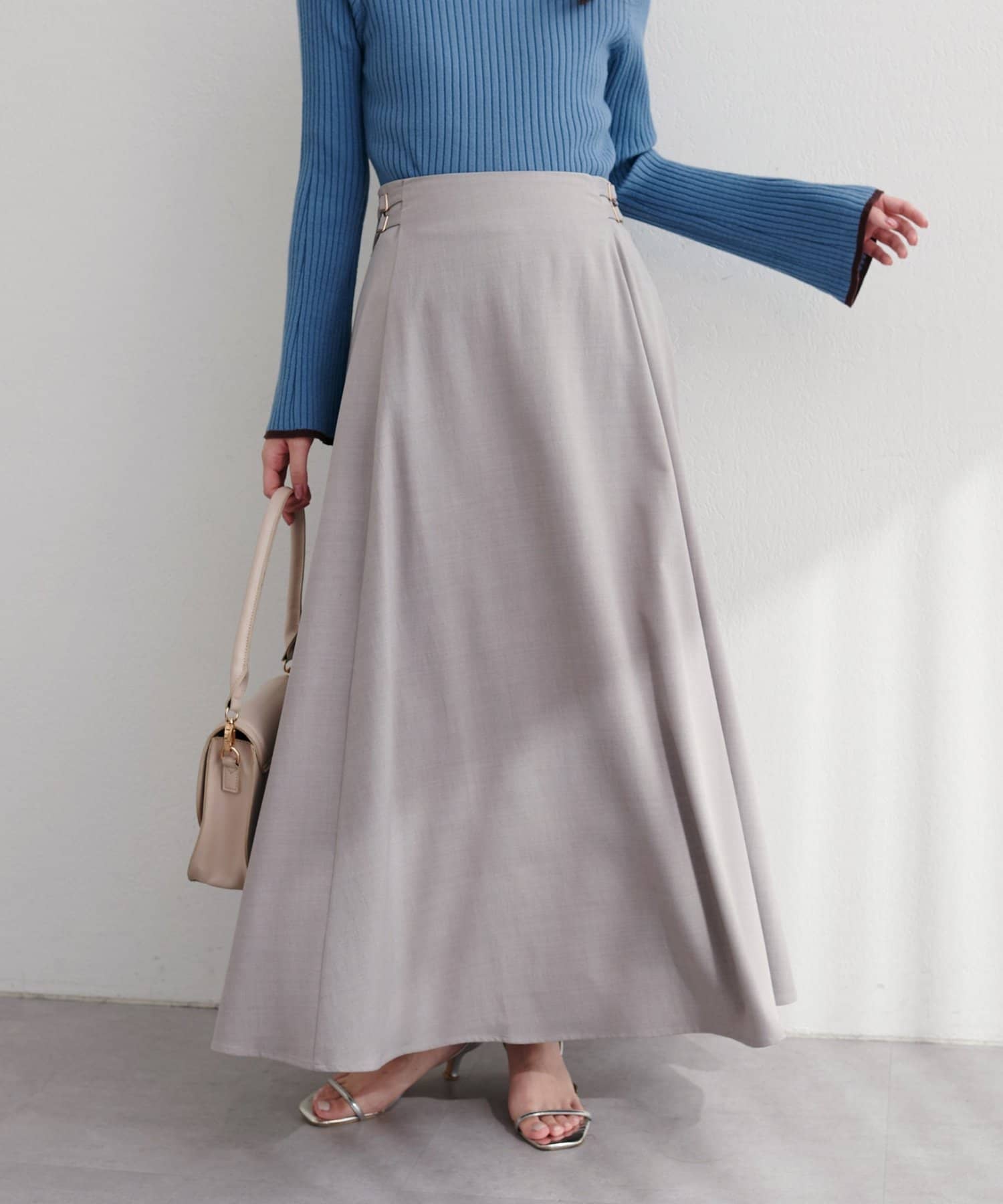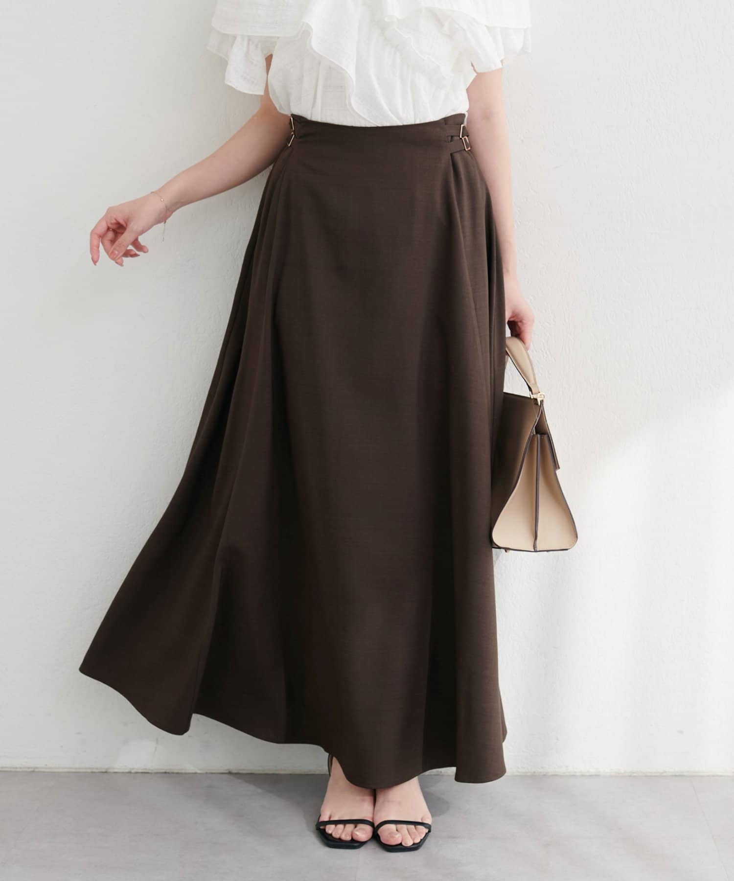 歩くたびに優雅に揺れるフレアシルエットが、女性らしさを引き立てるハイウエストスカート。