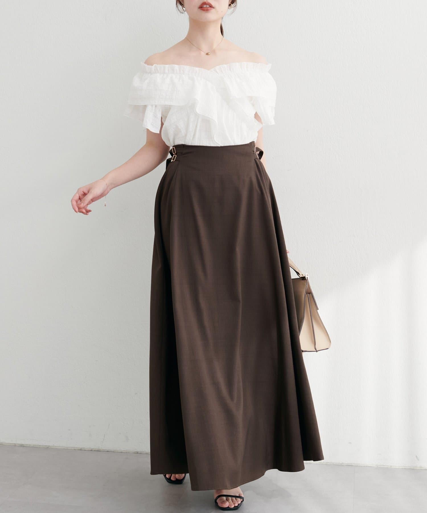 ブラウスやニットと合わせてフェミニンに、Tシャツと合わせて大人カジュアルにも着こなせます。