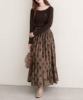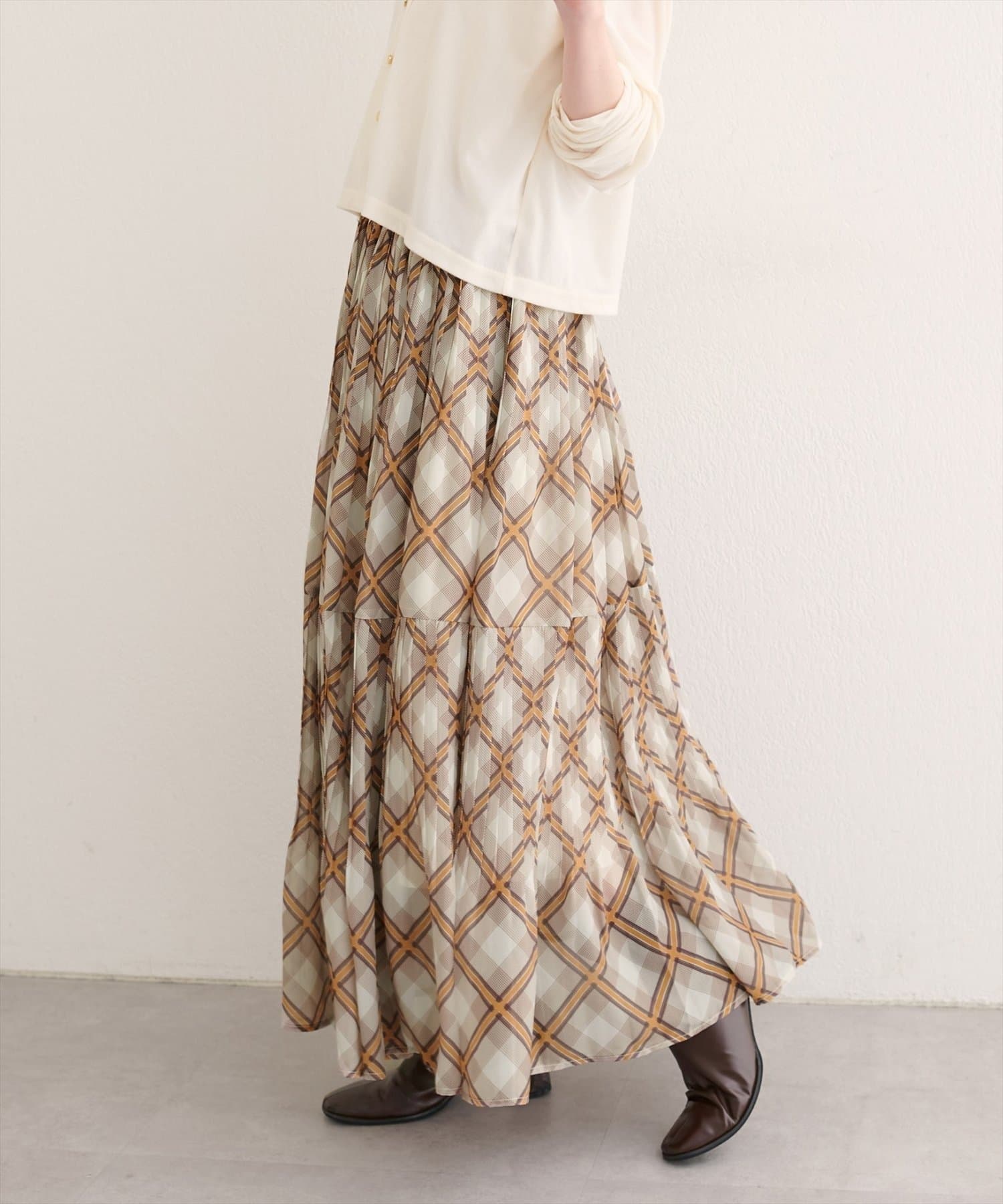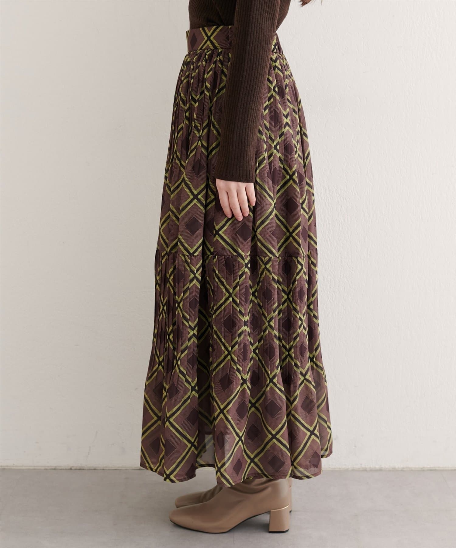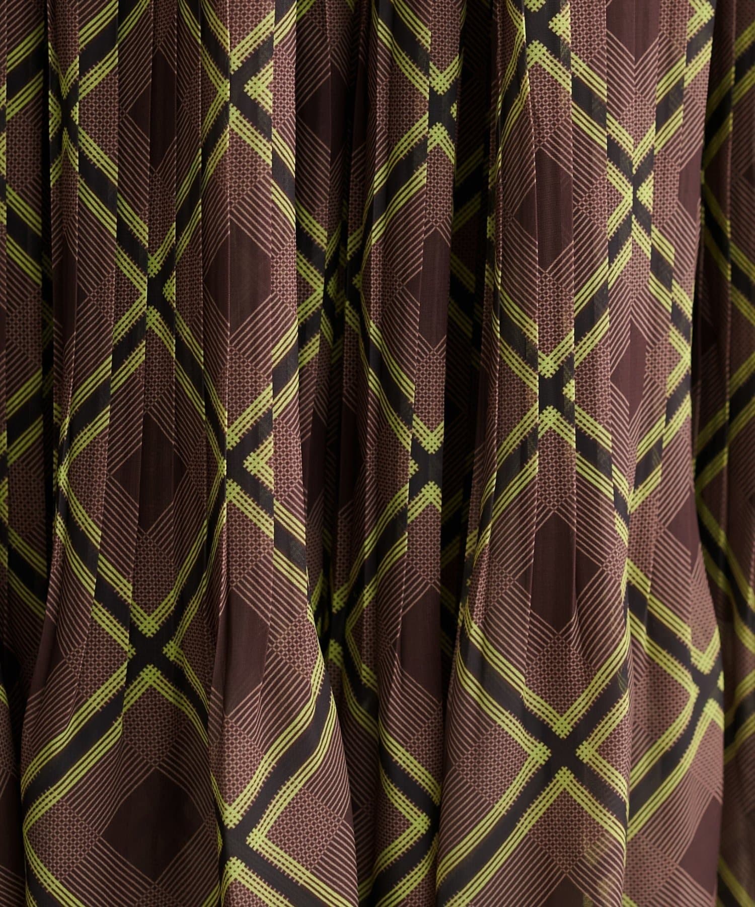 柄×プリーツが生み出す、奥行きのある表情。歩くたびにふわりと揺れる裾が、エレガントな雰囲気を演出します。