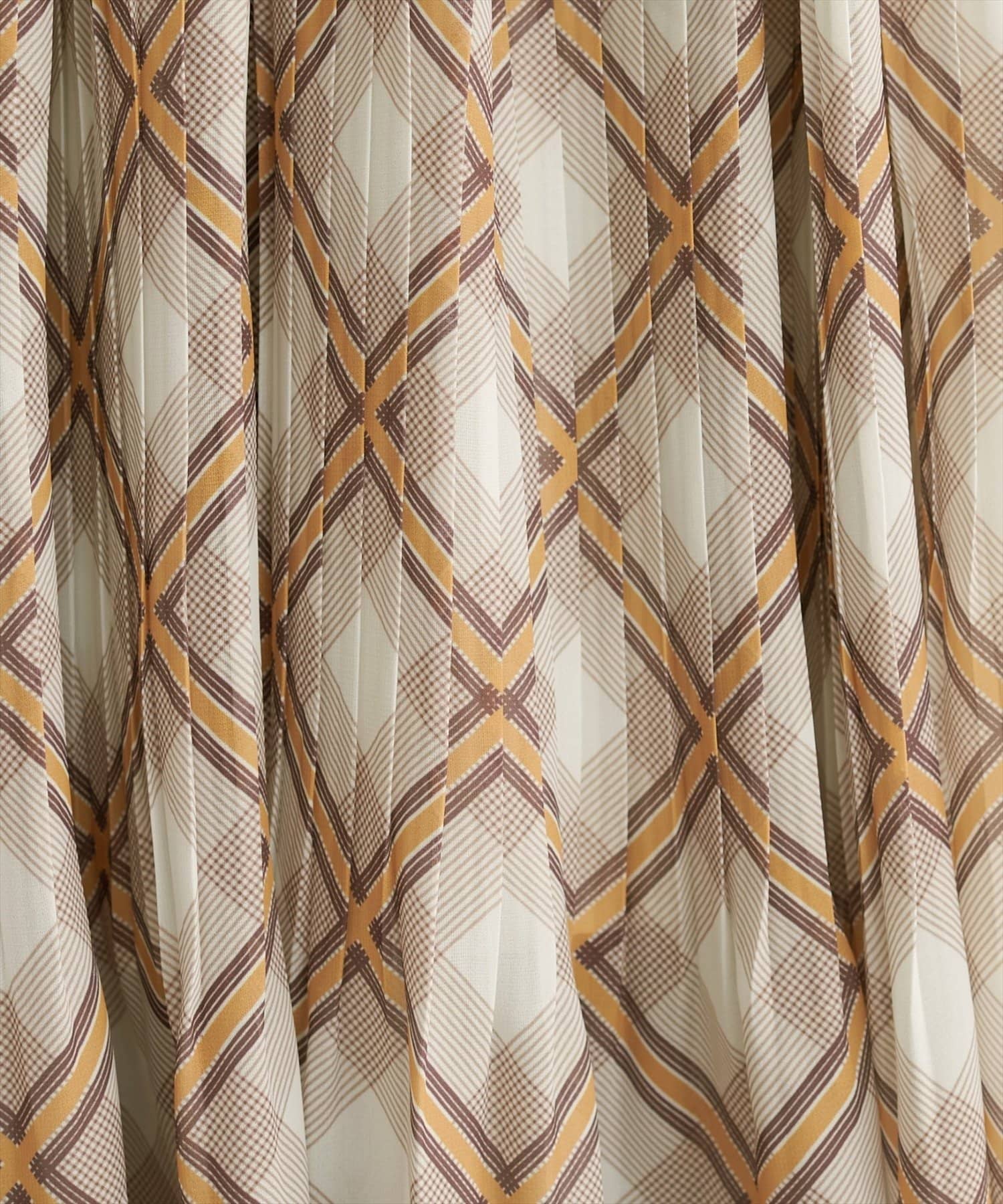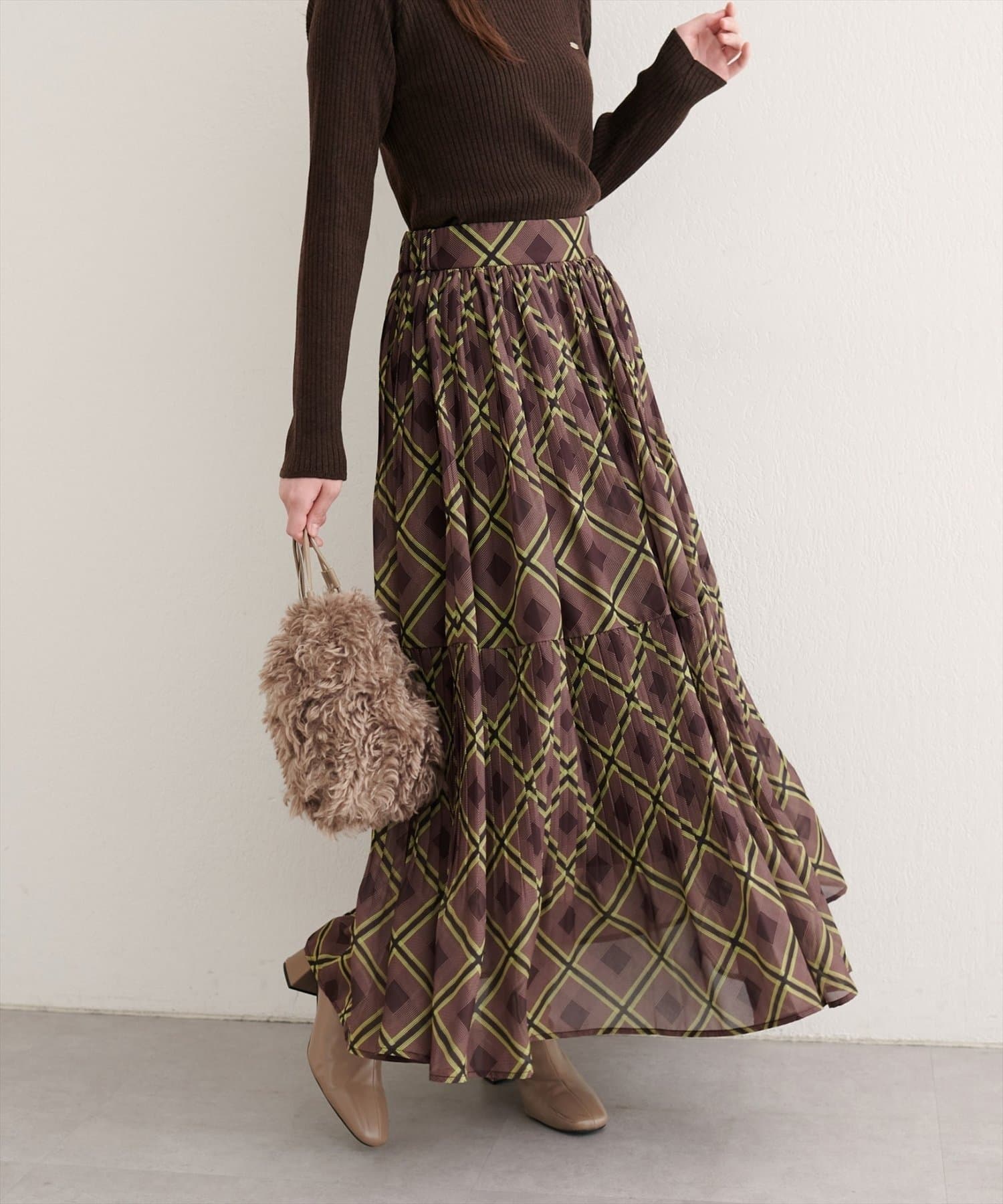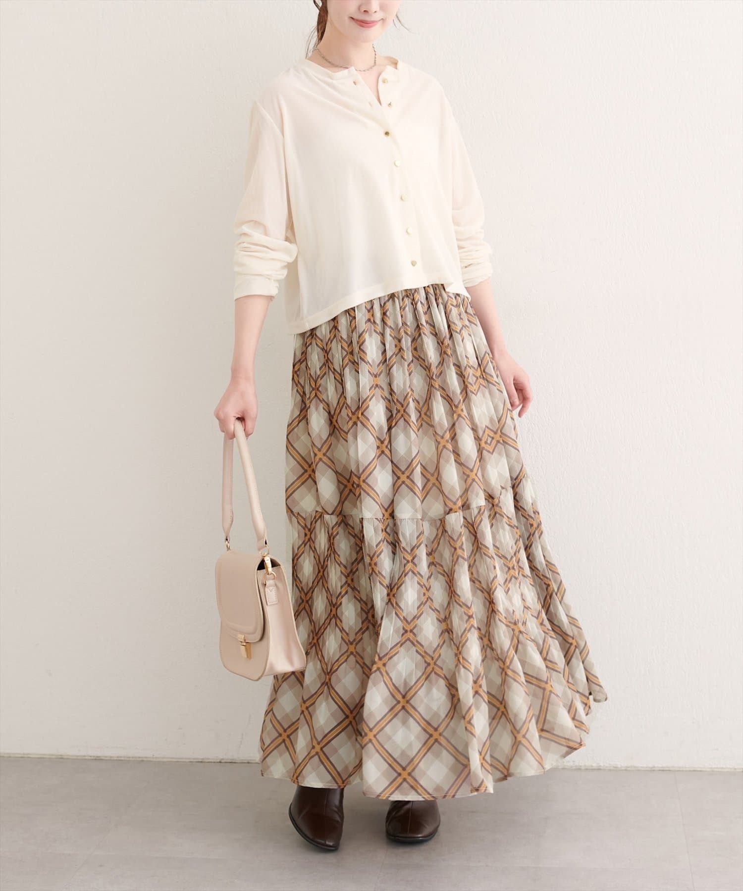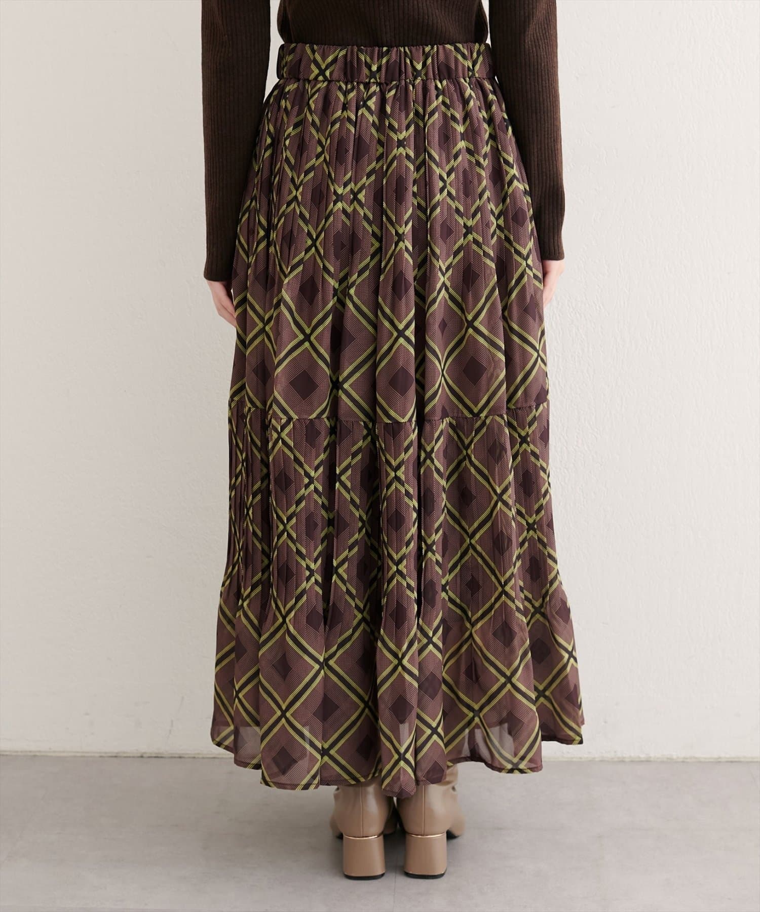 柄×プリーツが生み出す、奥行きのある表情。歩くたびにふわりと揺れる裾が、エレガントな雰囲気を演出します。