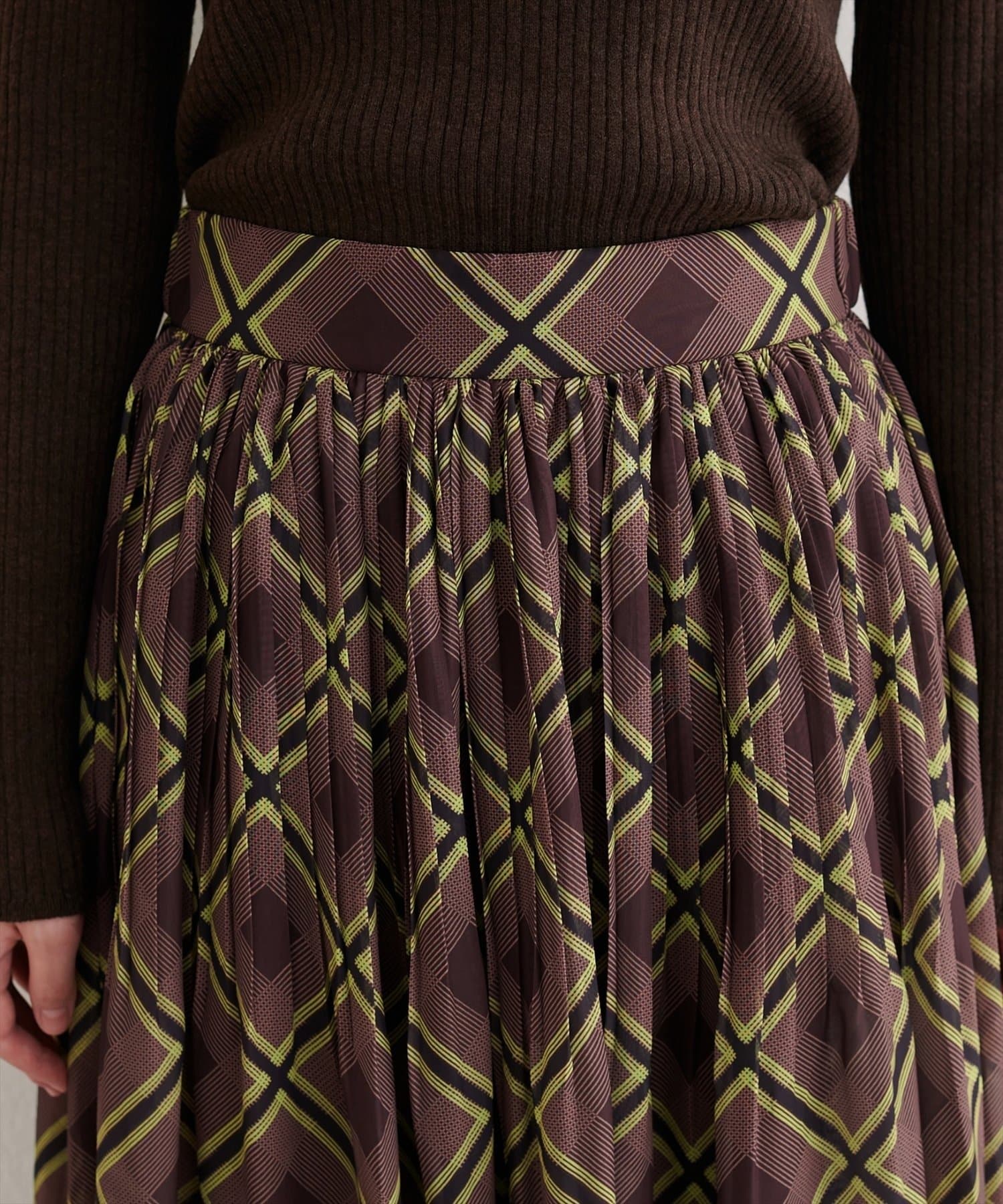目を引く幾何学模様と、繊細なプリーツ加工を組み合わせた、主役級スカートが登場しました。