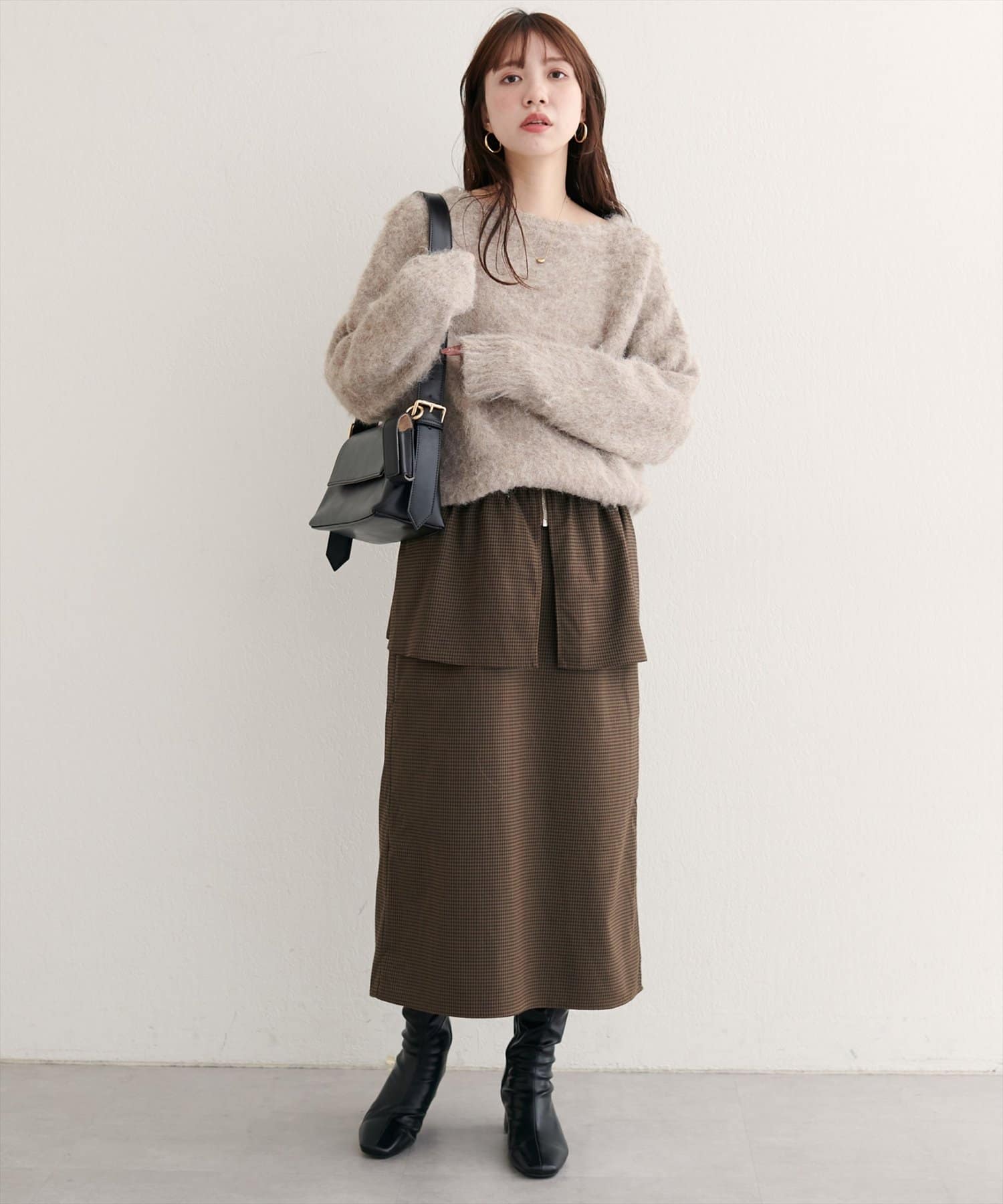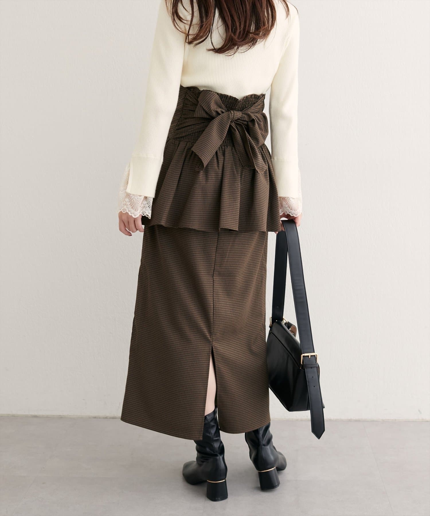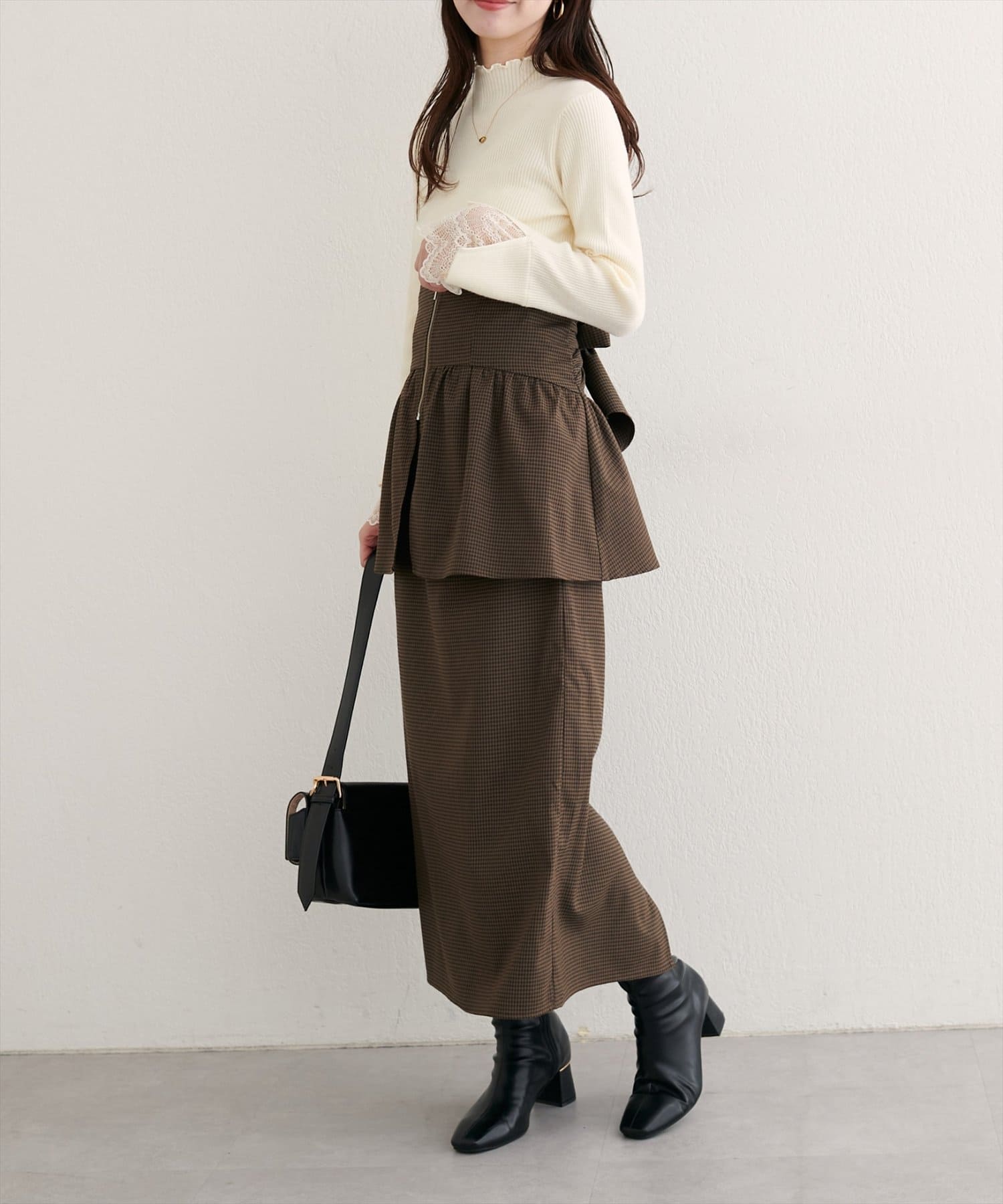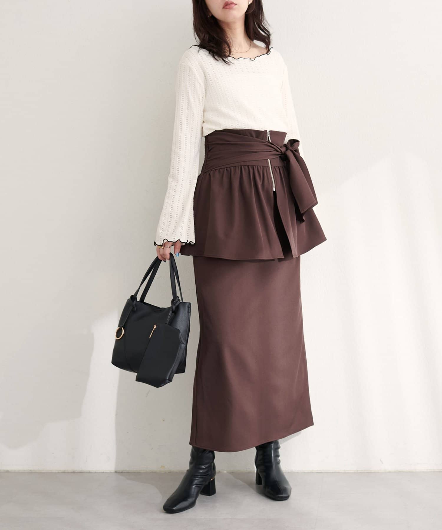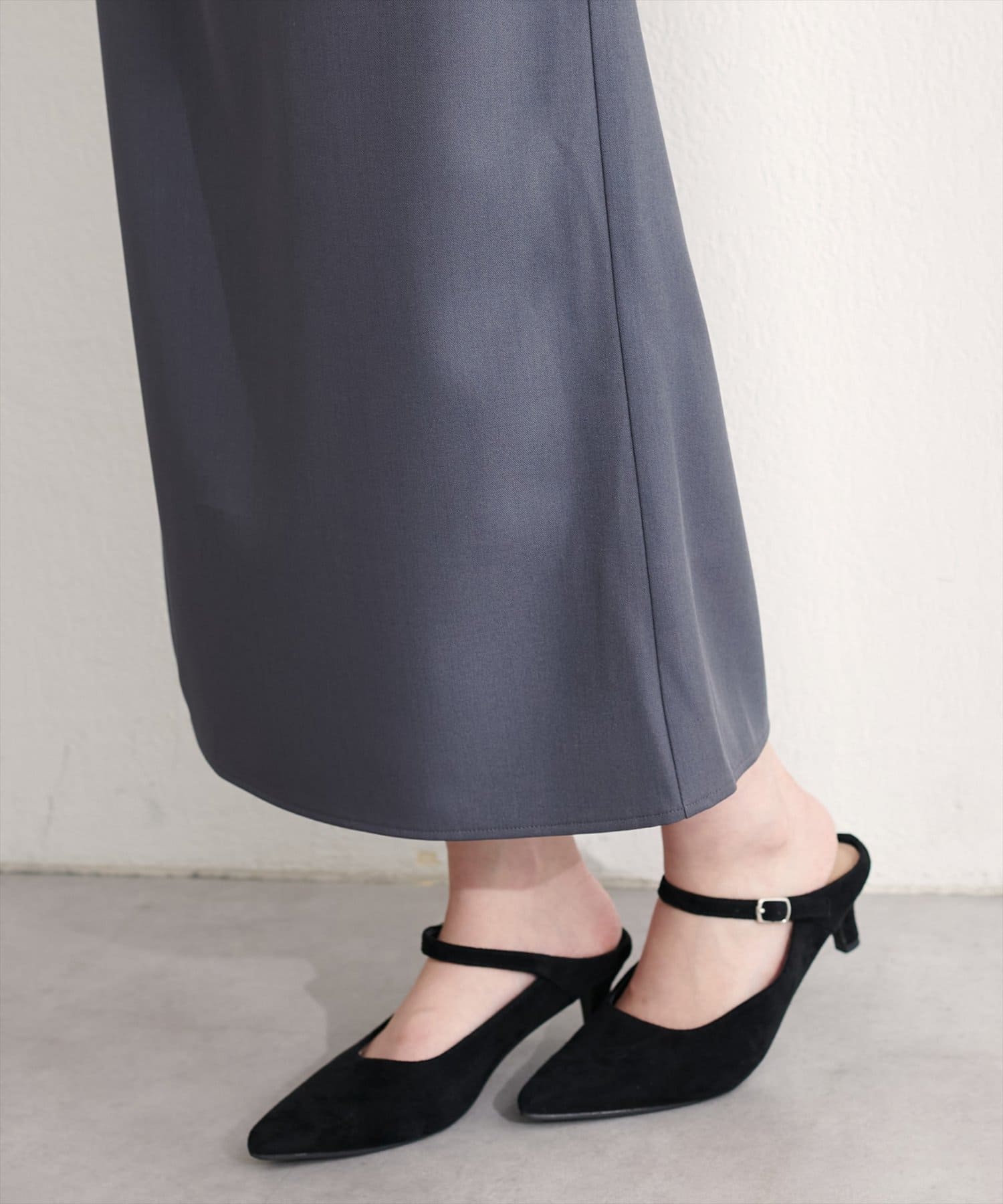 スカートはIラインシルエットなので、すっきりとした印象に。