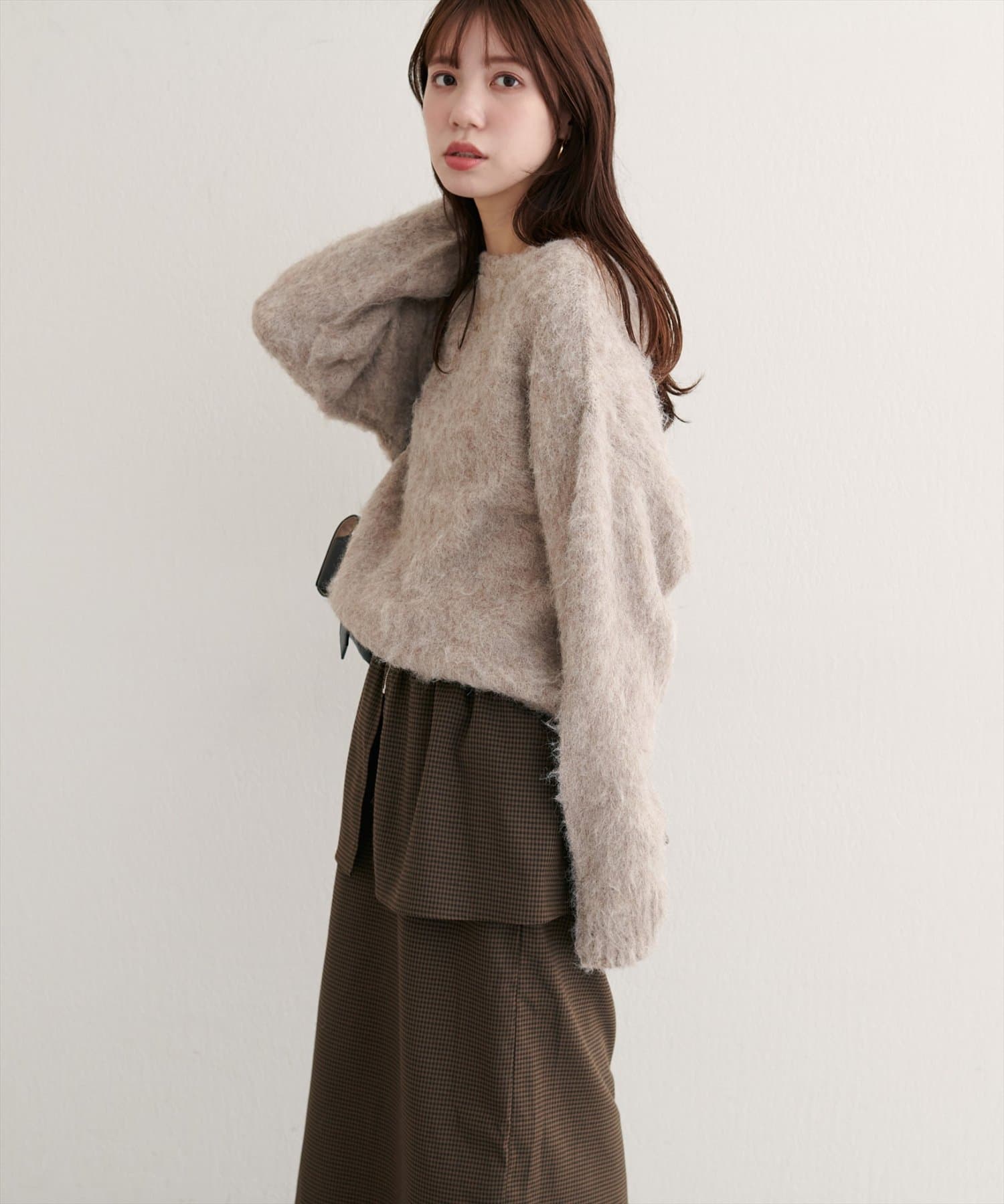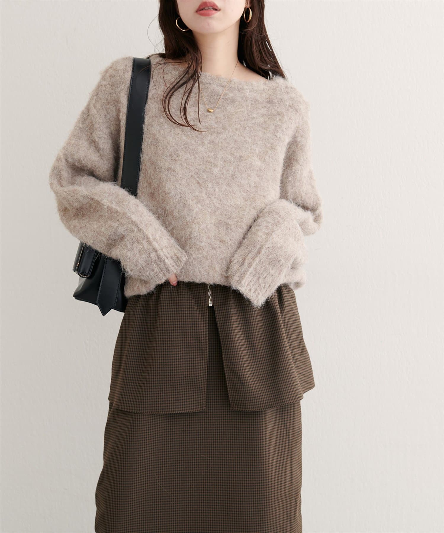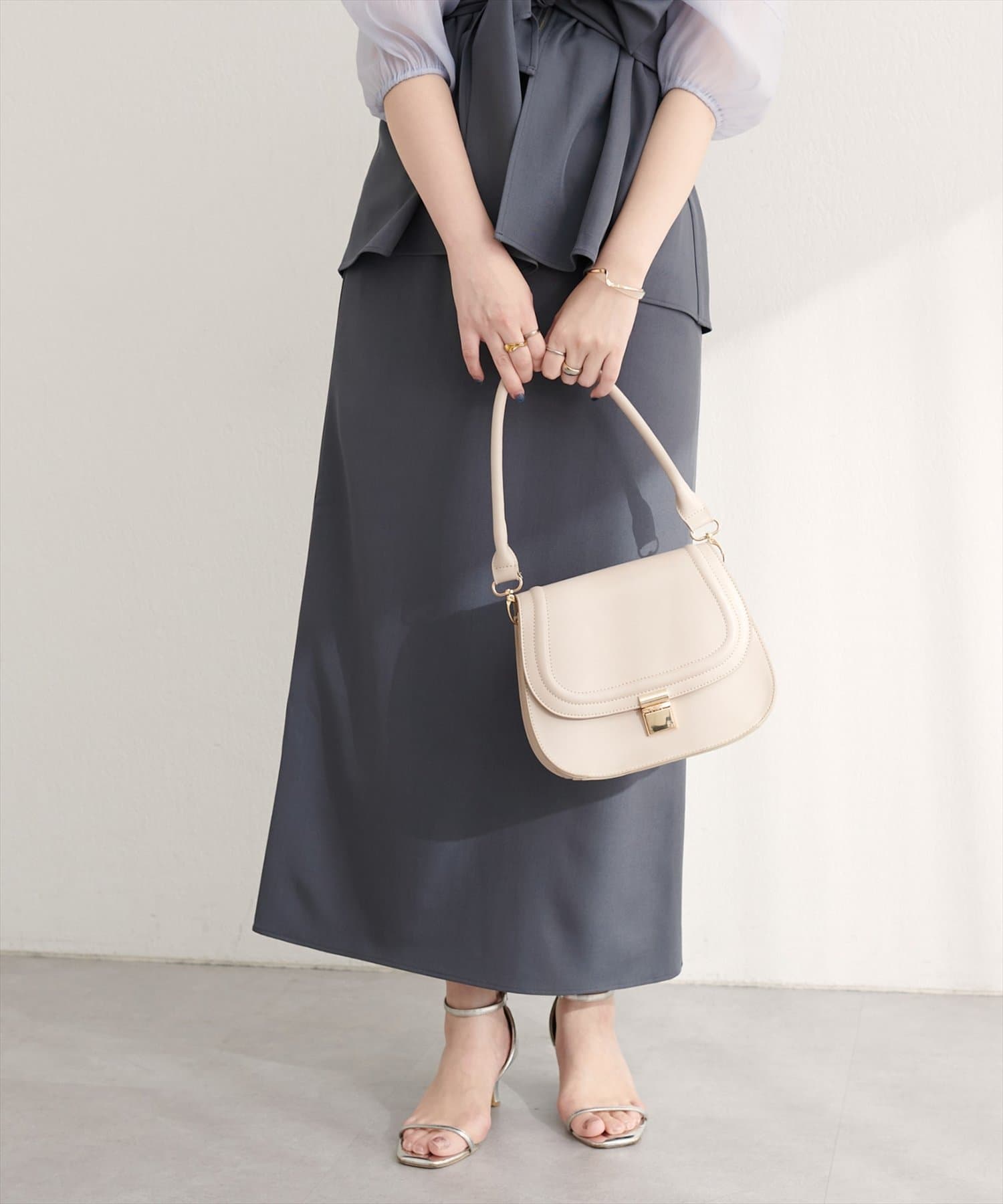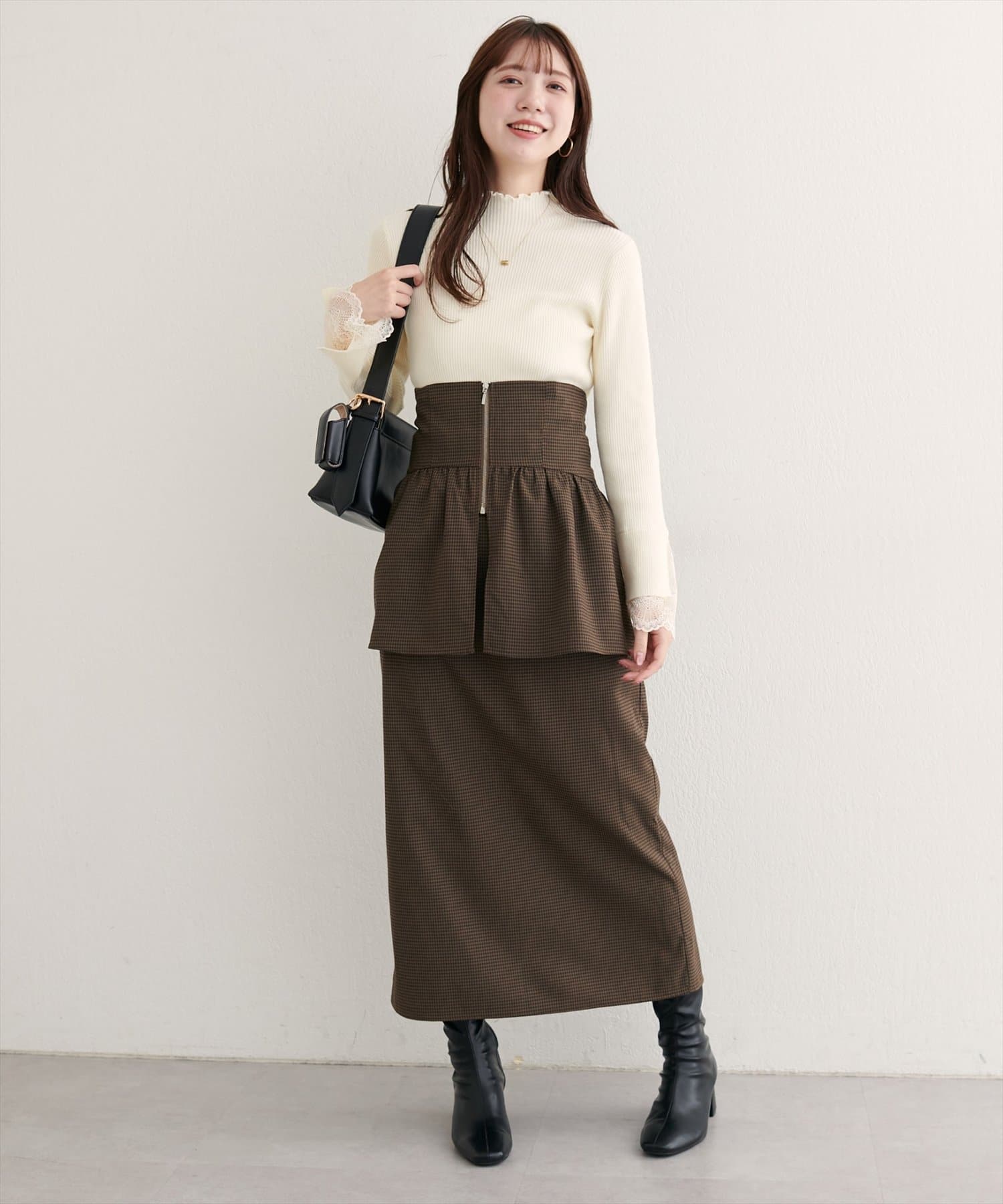 スカートはIラインシルエットなので、すっきりとした印象に。