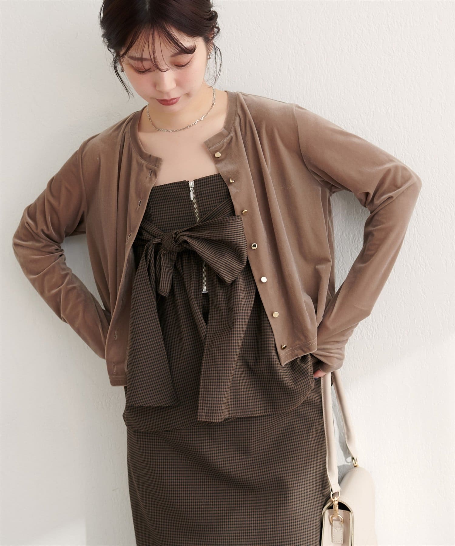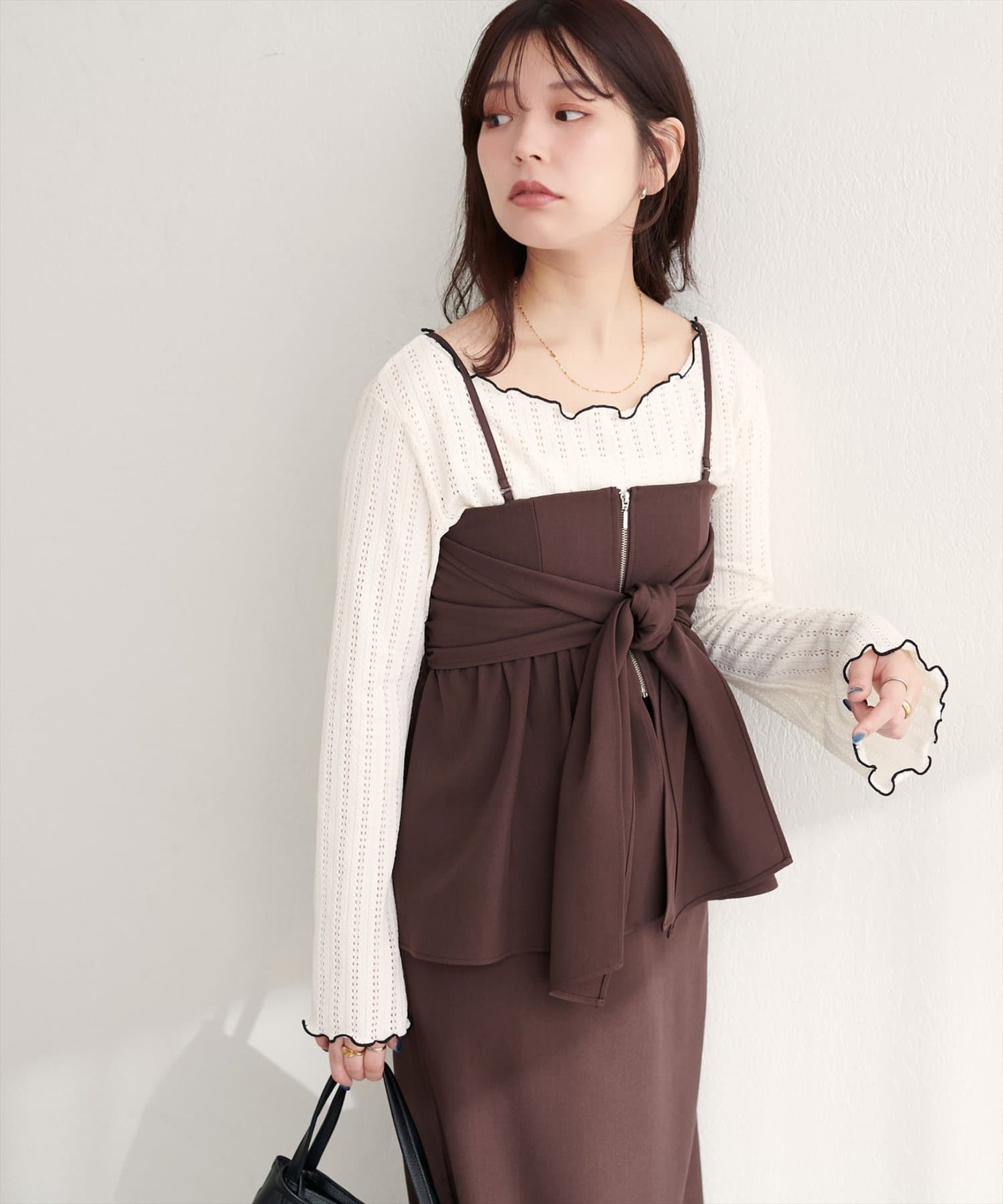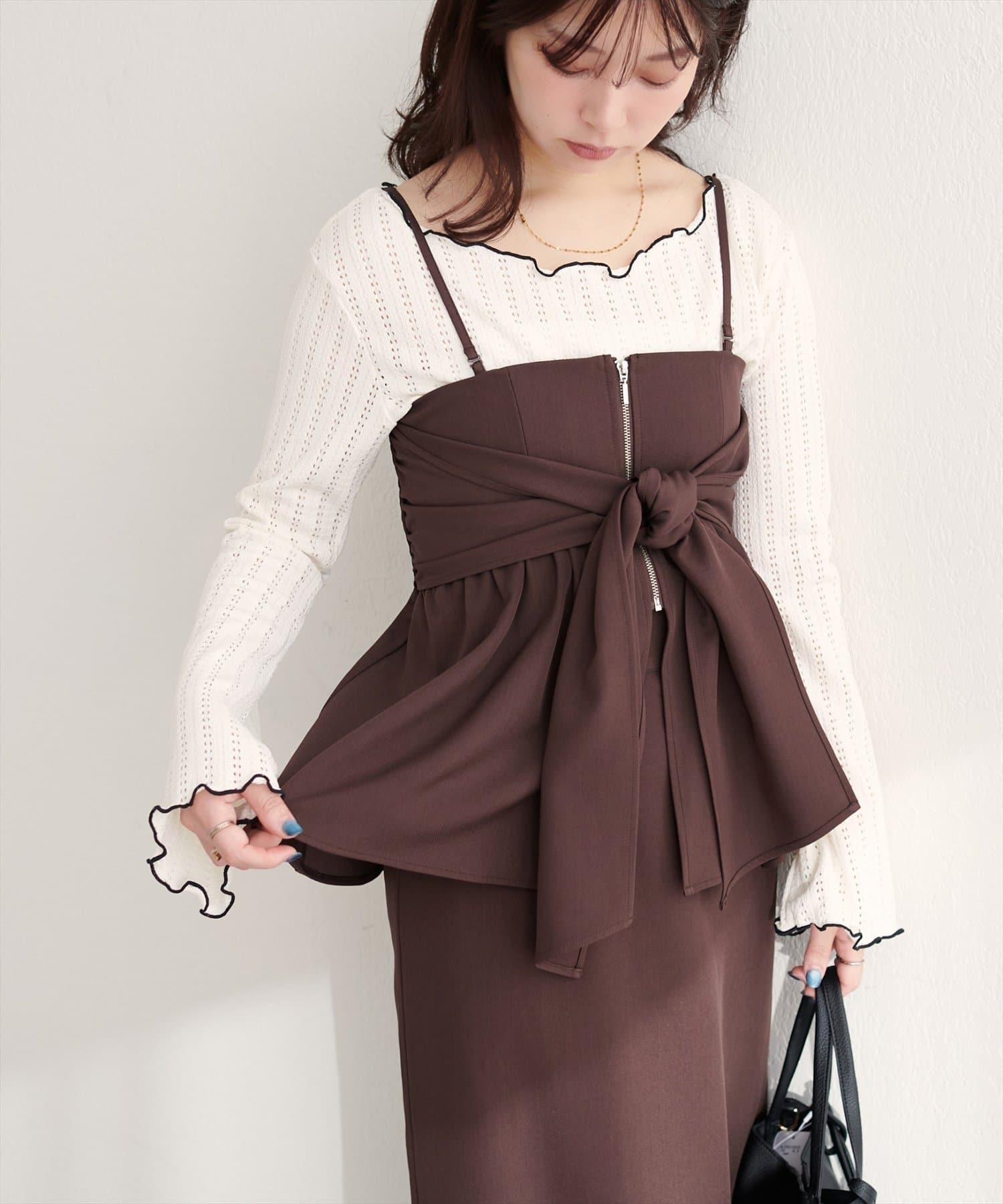 ブラウスやニットにビスチェを重ねて、フェミニンな印象に。