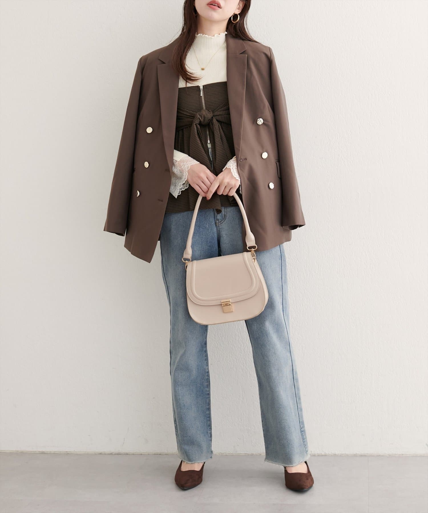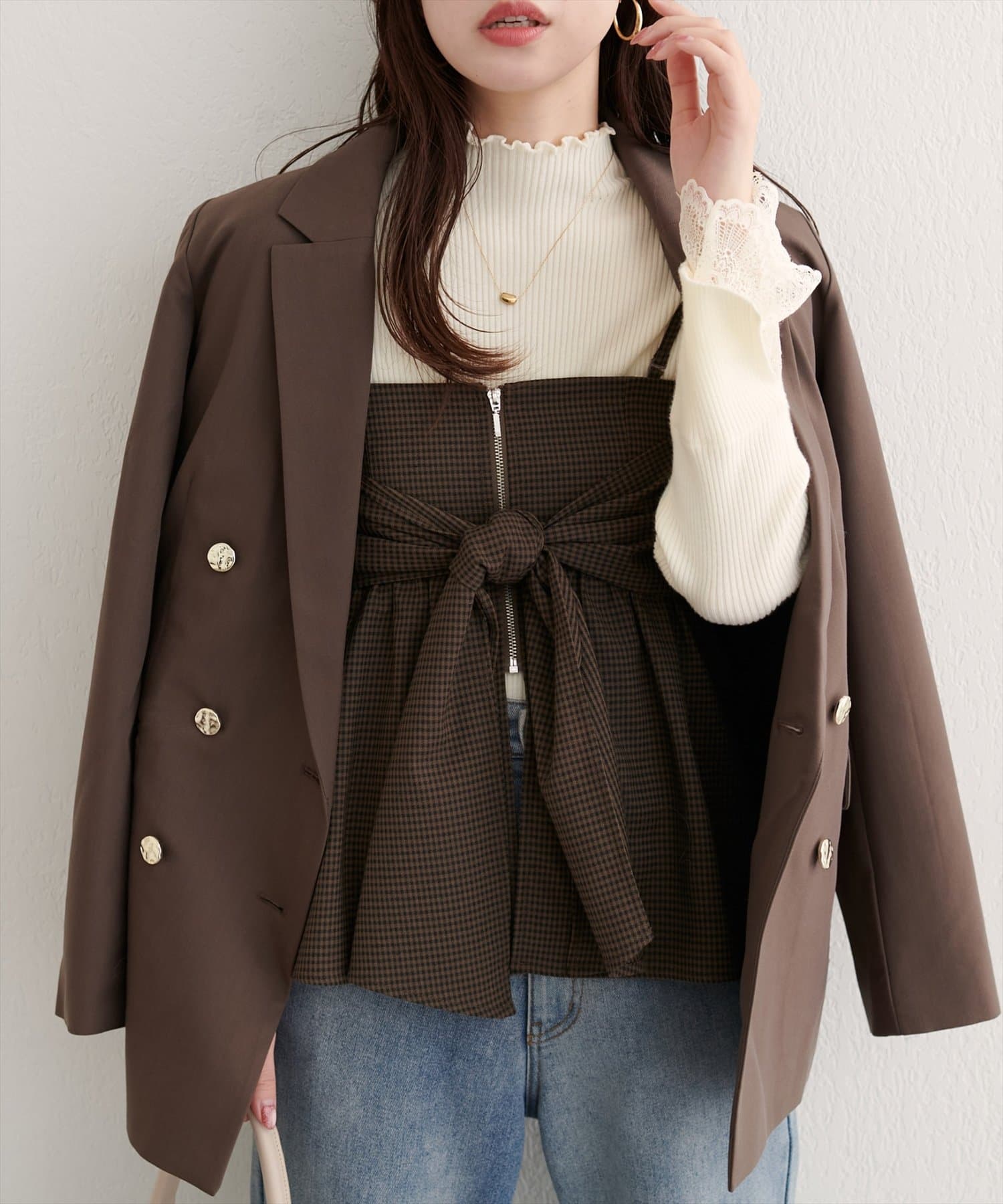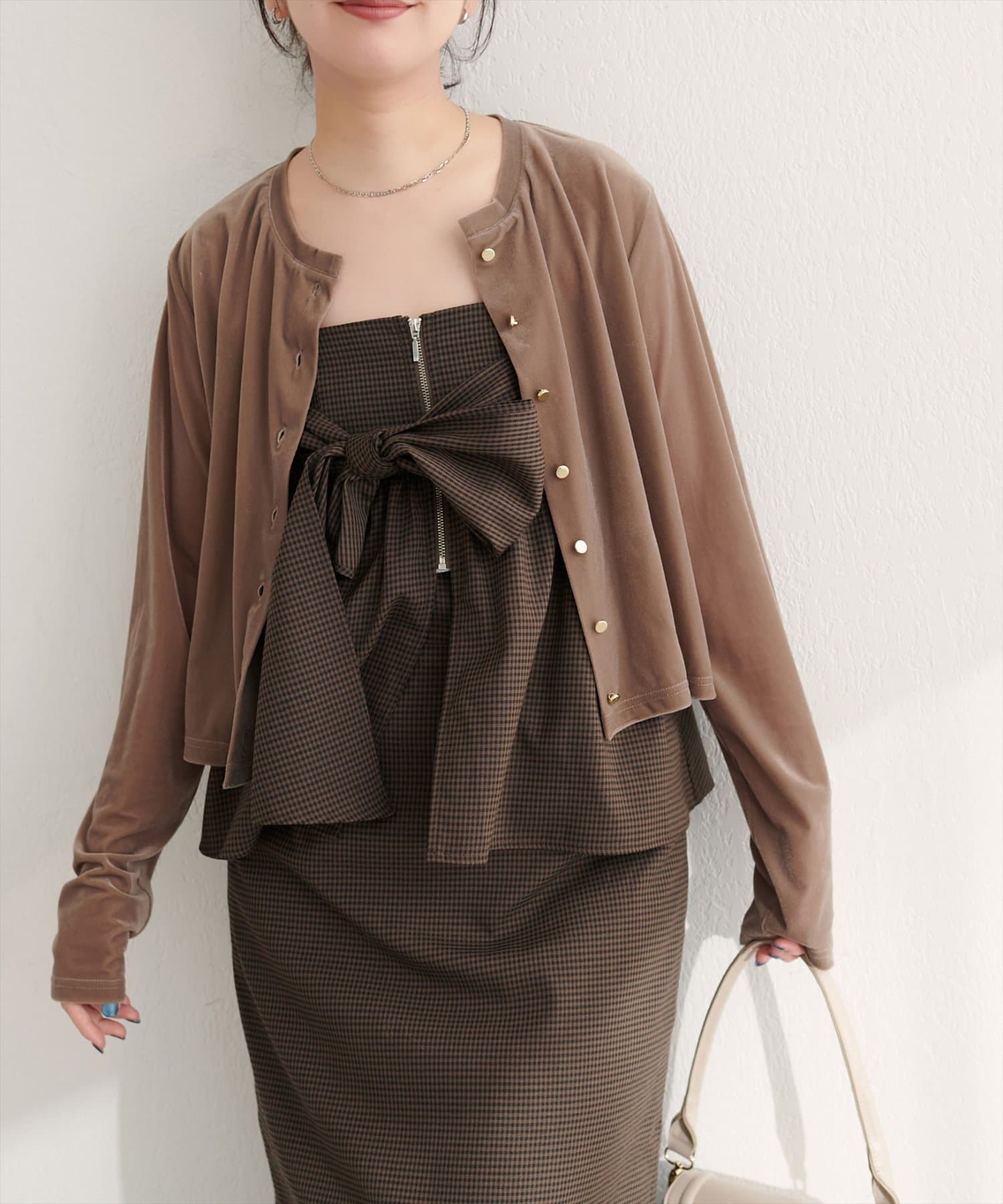 ブラウスやニットにビスチェを重ねて、フェミニンな印象に。