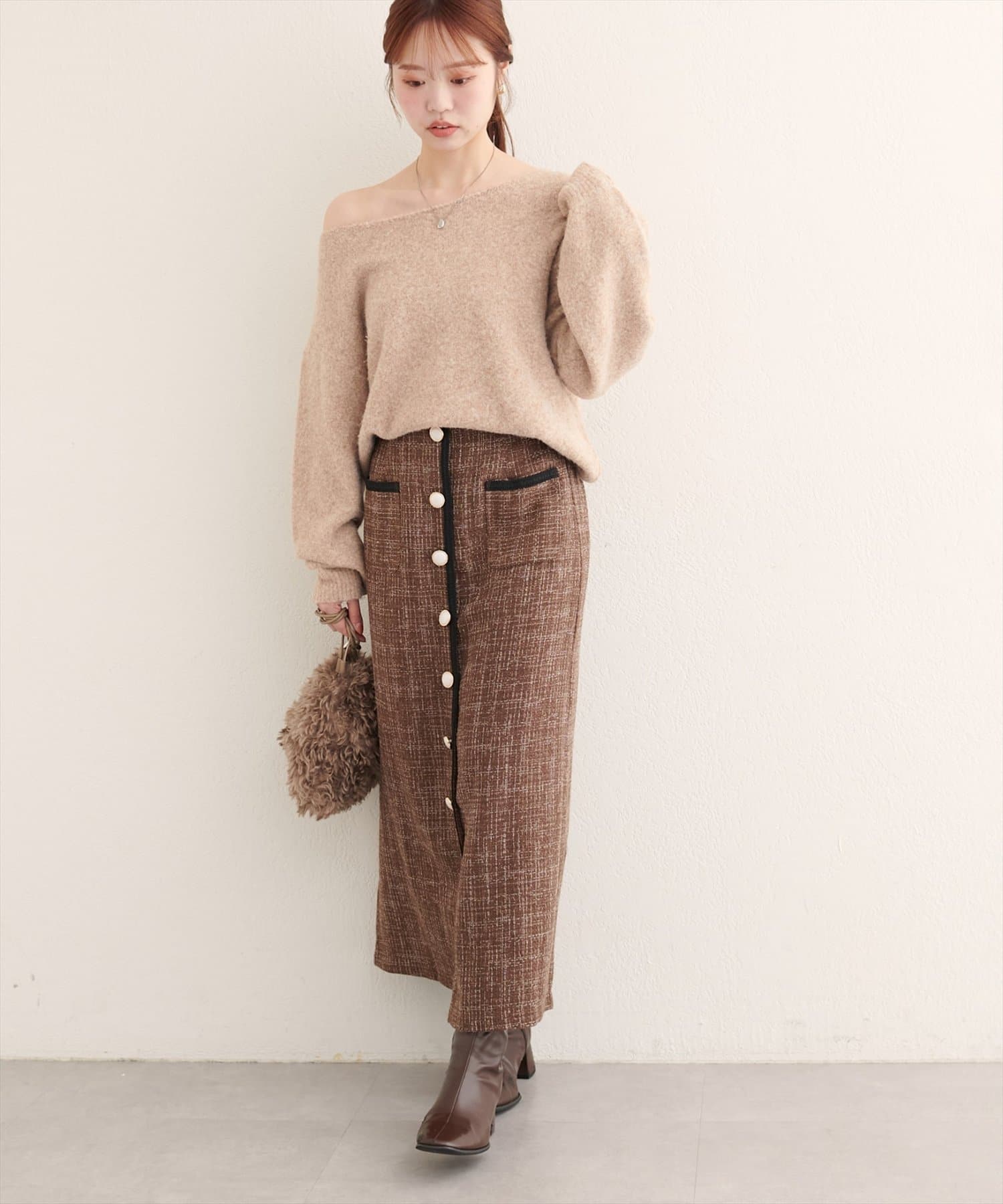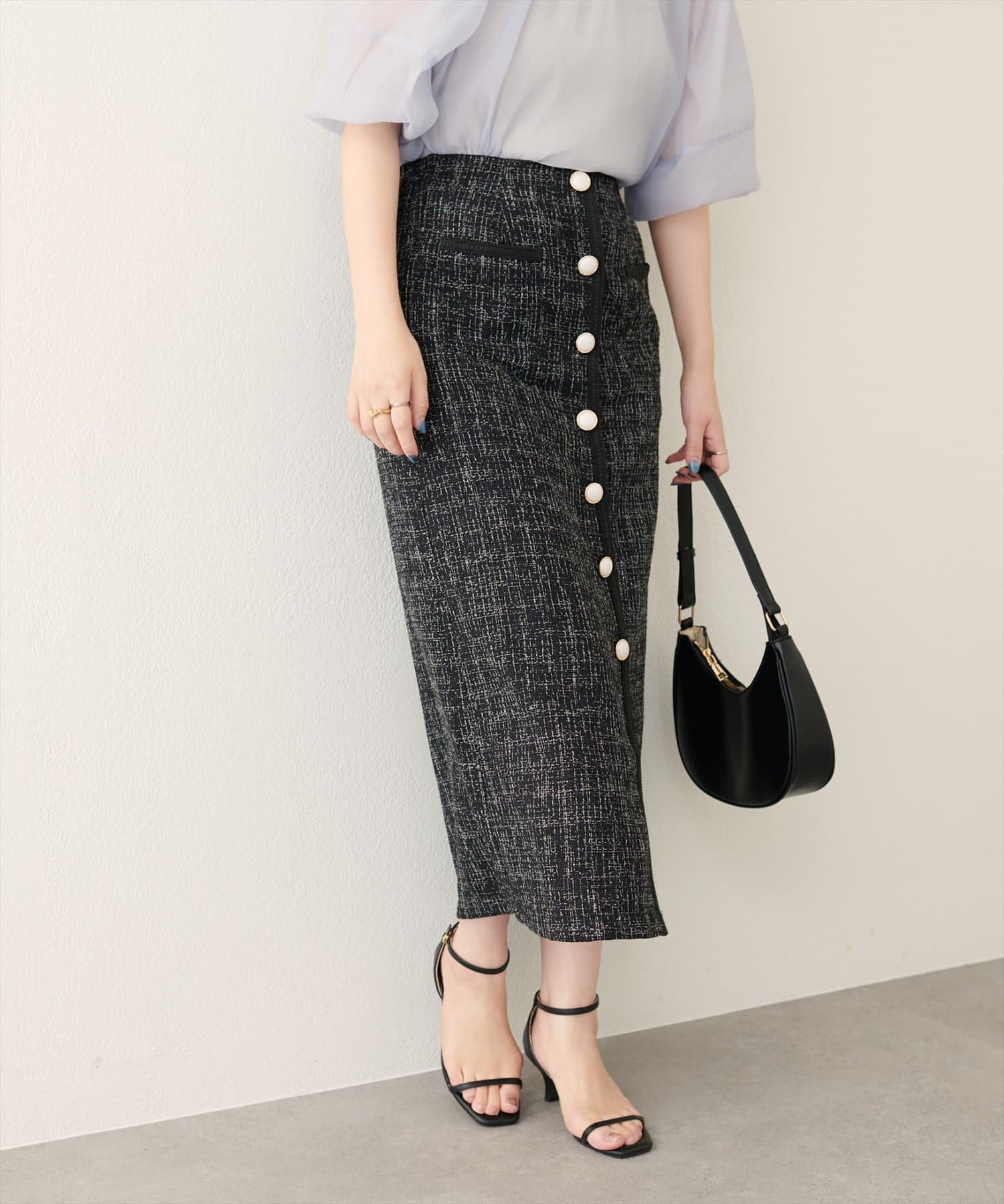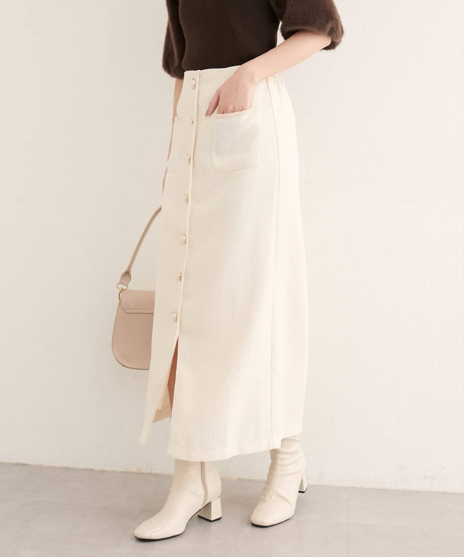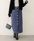 表面感のあるツイード調がコーディネートに表情を与えてくれるタイトスカートが登場。