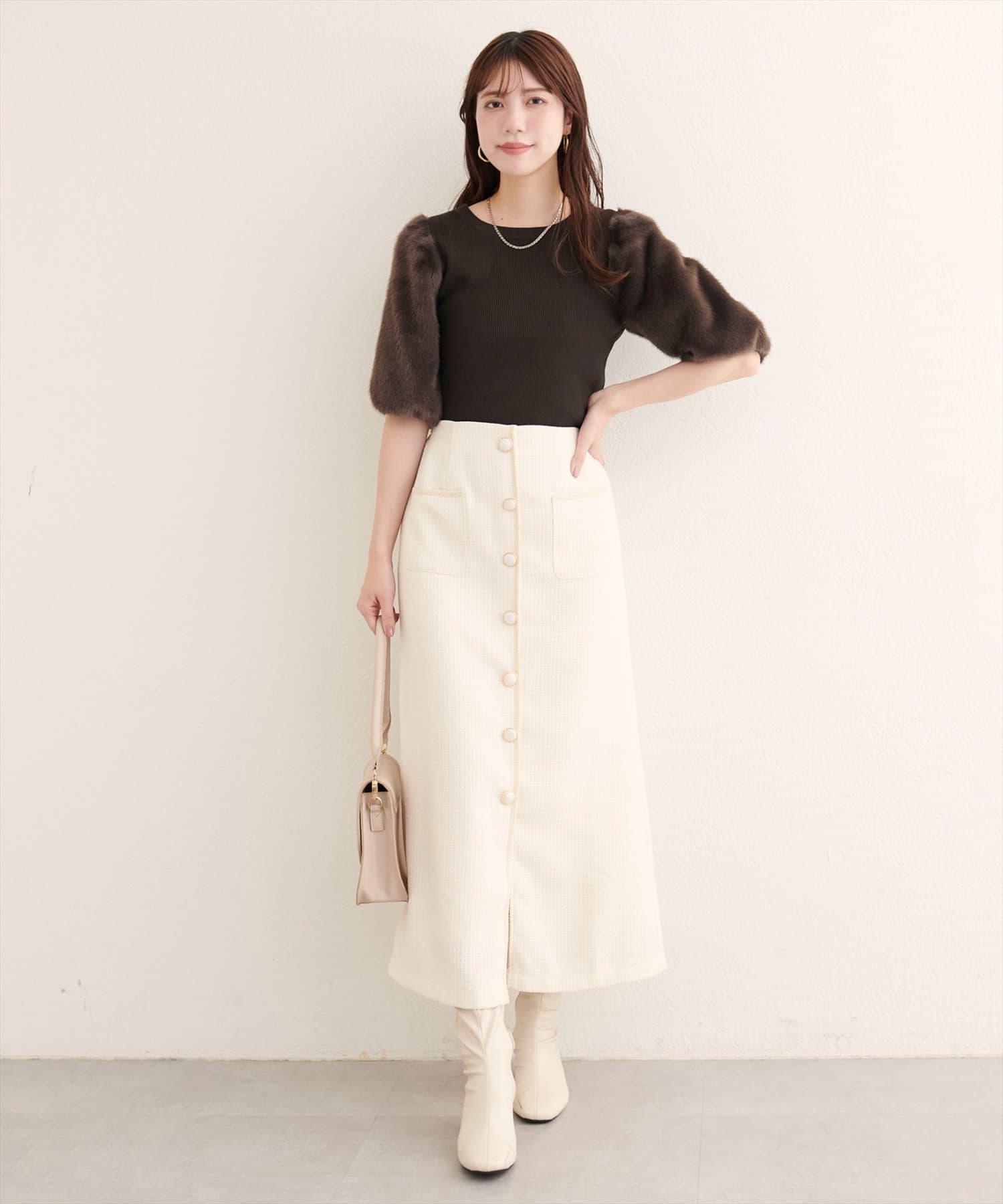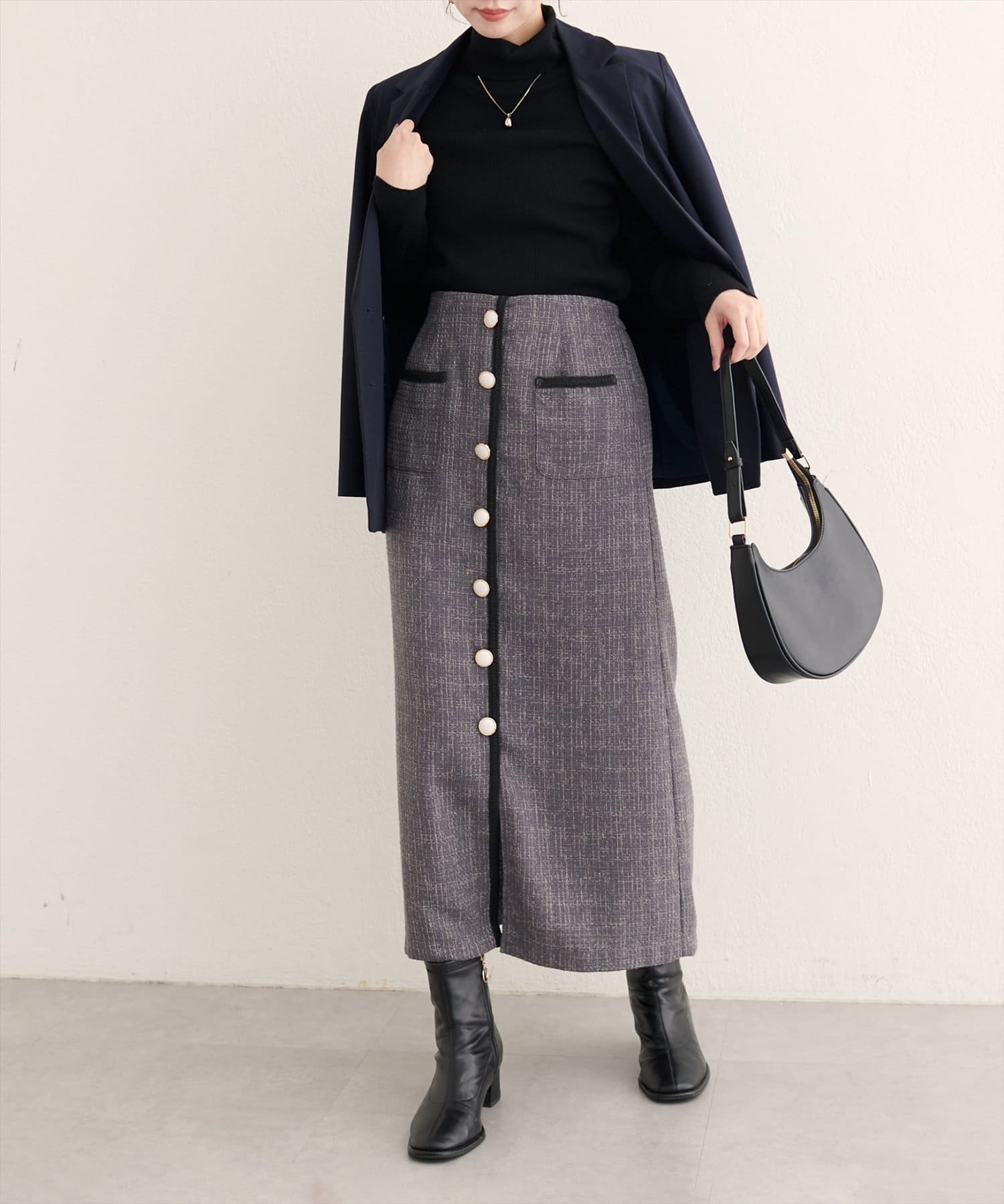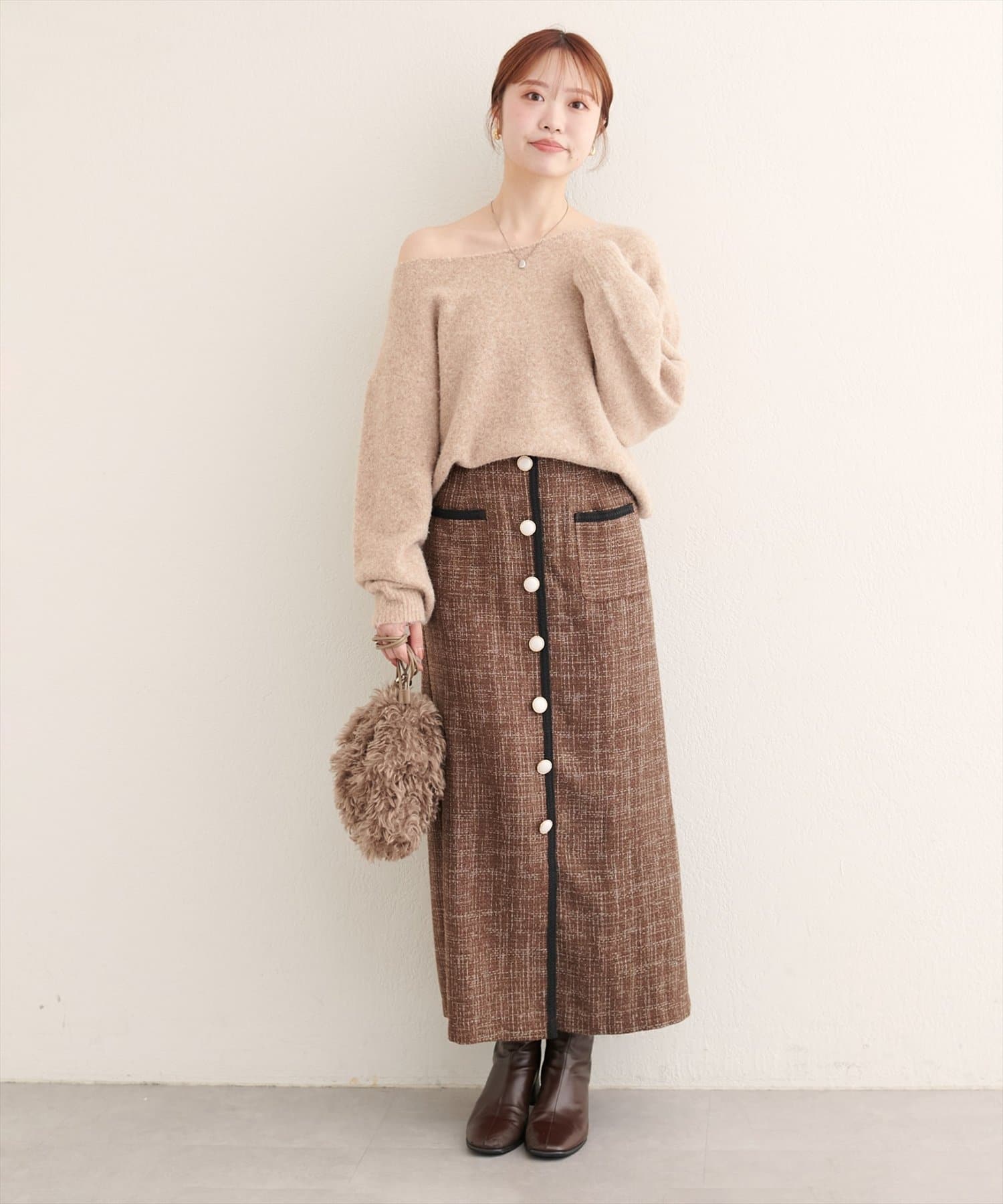 表面感のあるツイード調がコーディネートに表情を与えてくれるタイトスカートが登場。