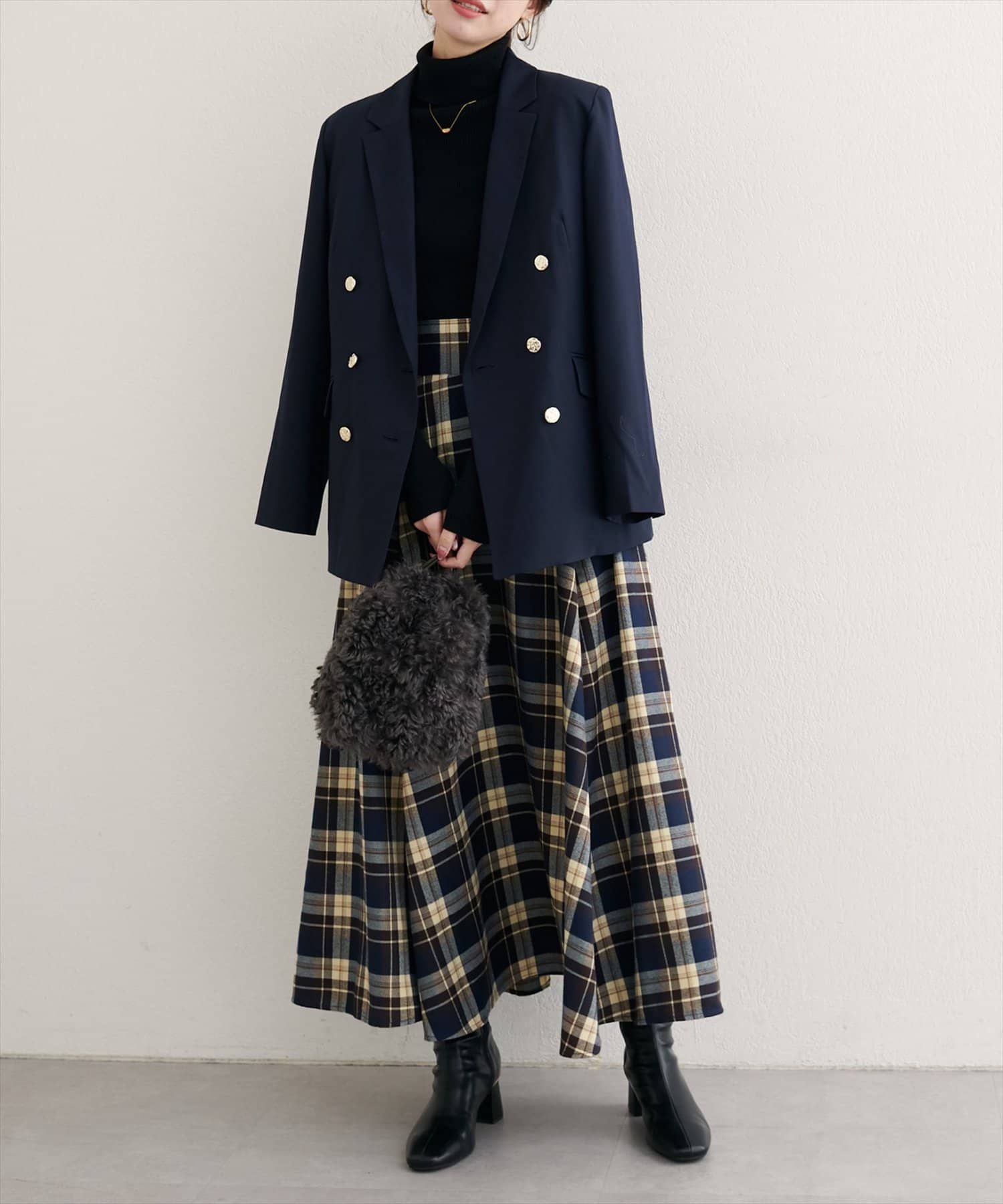落ち着いた色合いのチェック柄は、カジュアルになりすぎず、上品な印象を与えます。