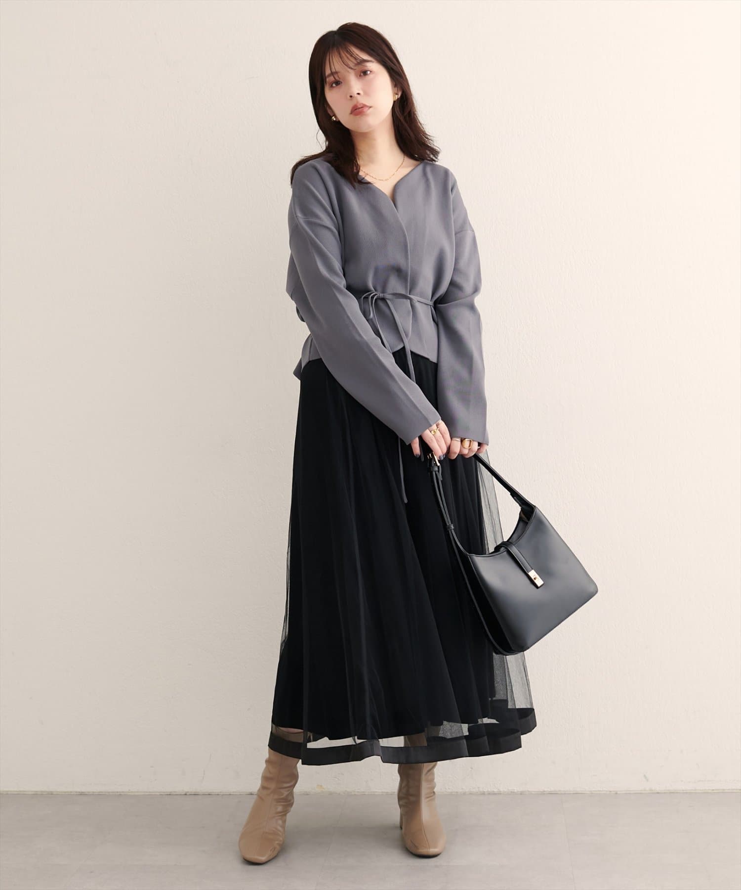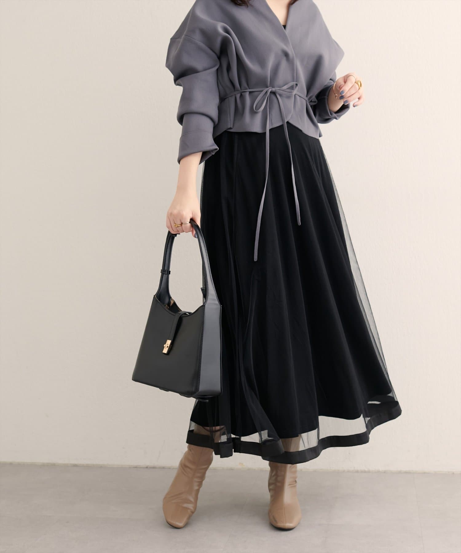 広がりすぎないシルエットなので、甘くなりすぎず、大人の女性にも取り入れやすいのが魅力です。