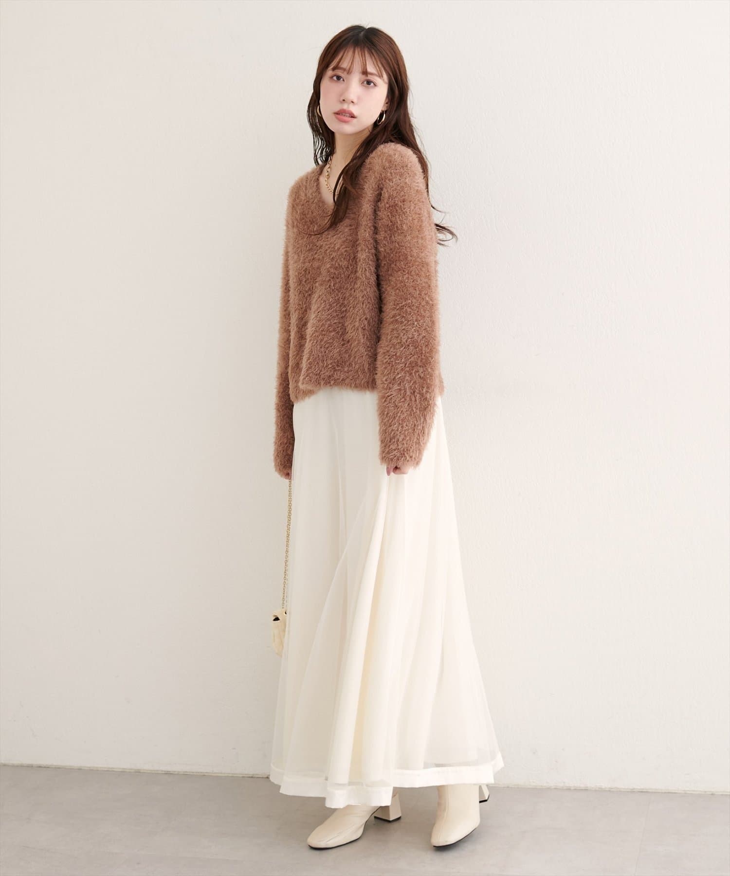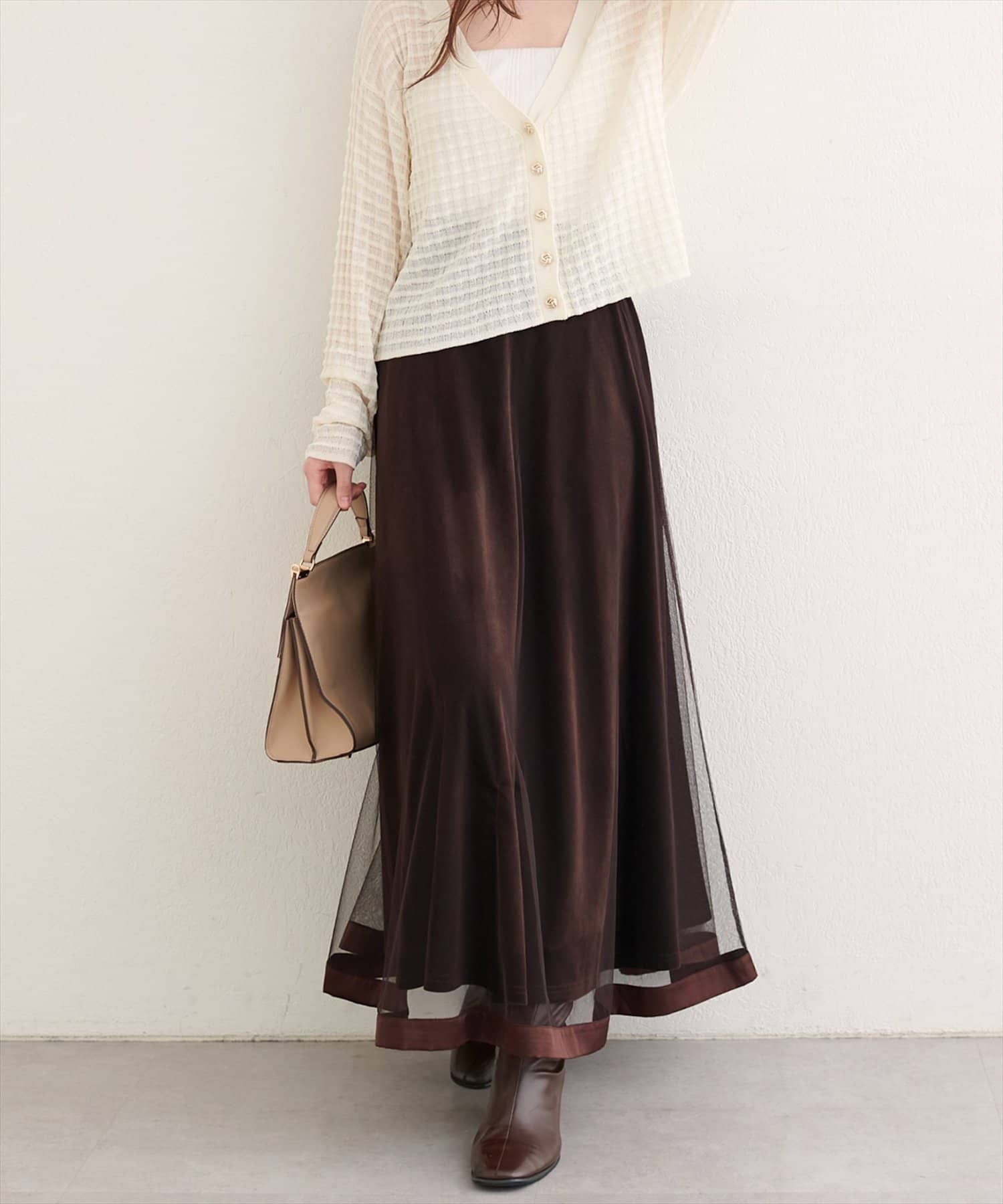 広がりすぎないシルエットなので、甘くなりすぎず、大人の女性にも取り入れやすいのが魅力です。