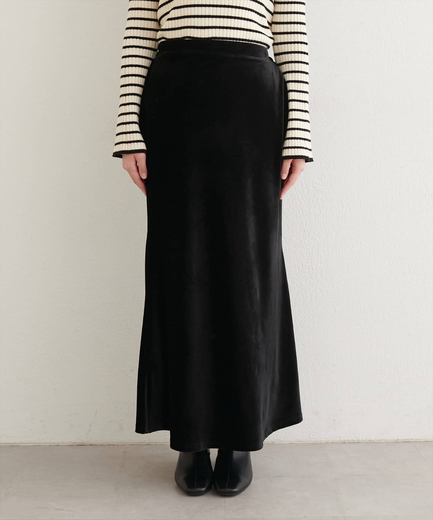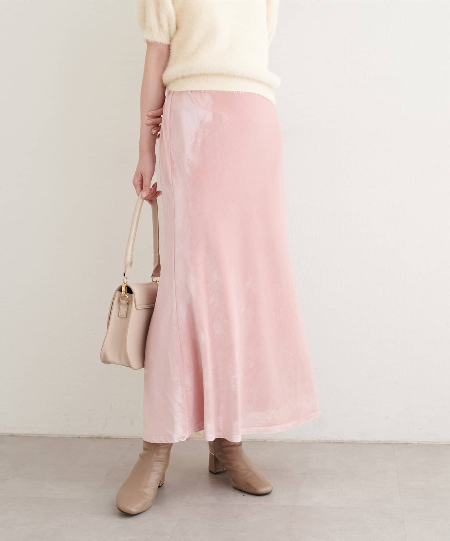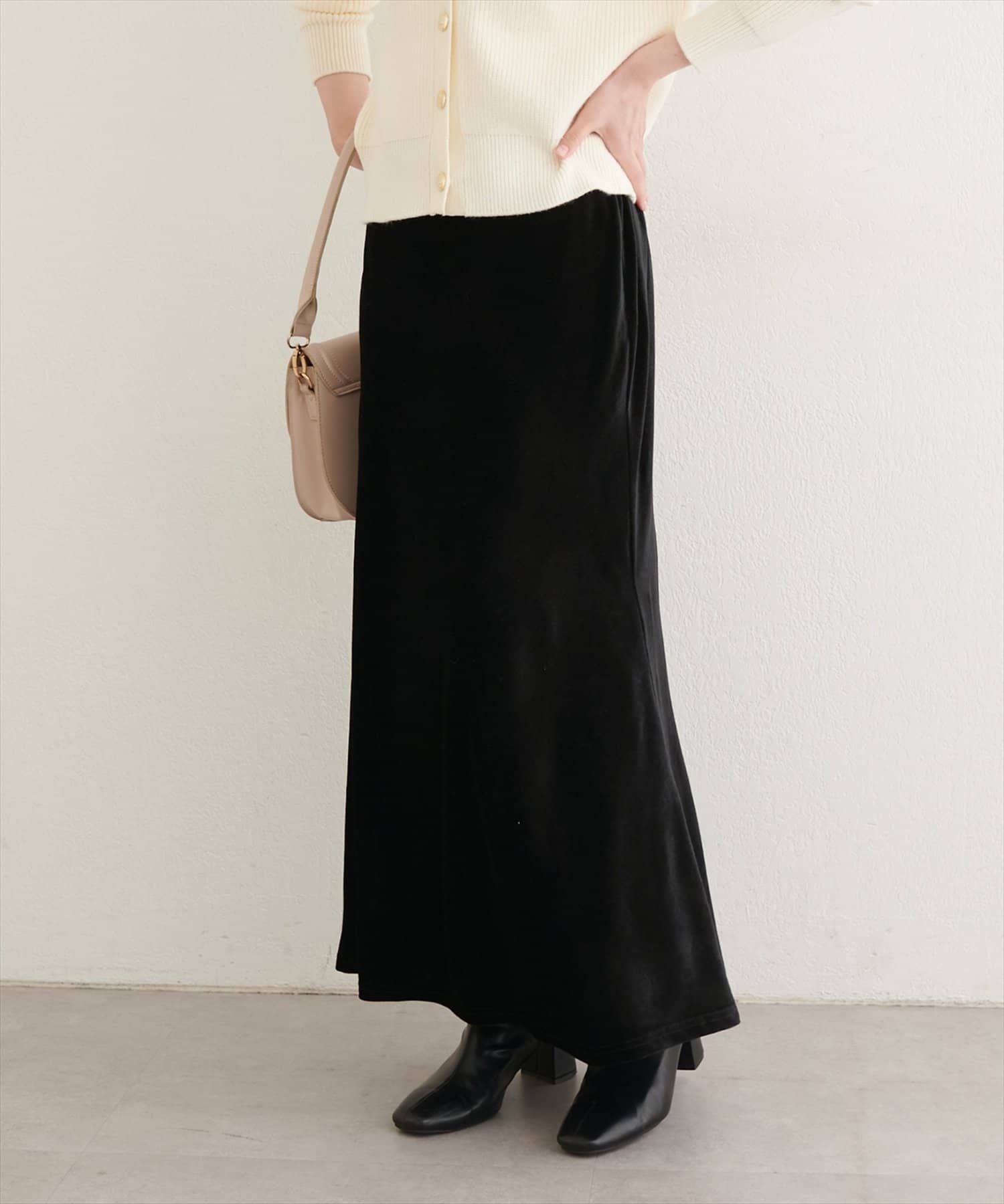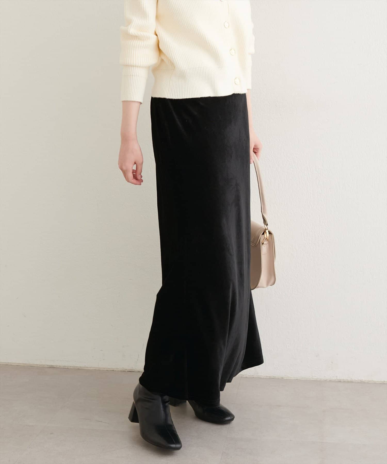 歩くたびに優雅な揺れを生み出す、ベロアマーメイドスカート。上品な光沢を放つベロア素材が、