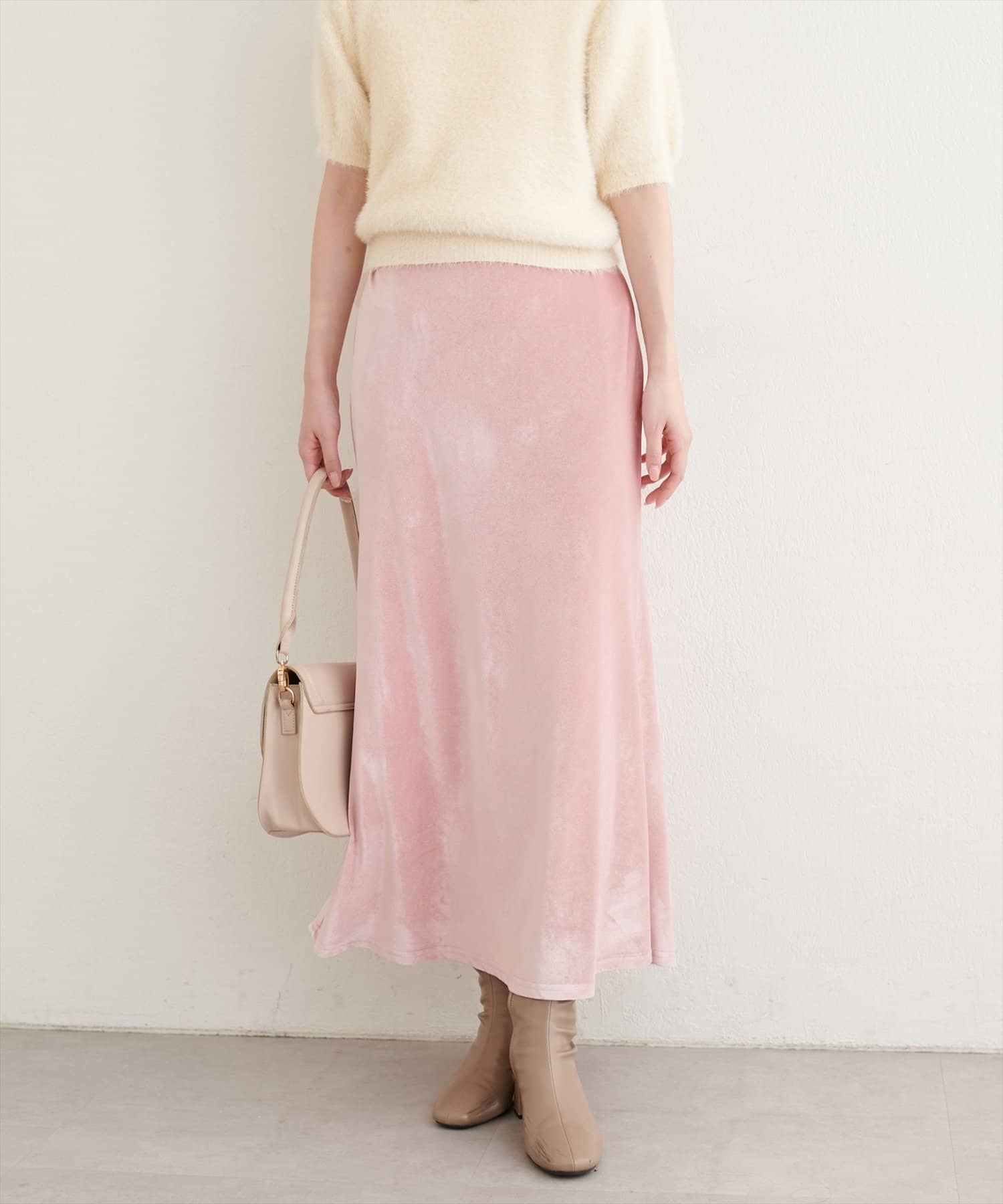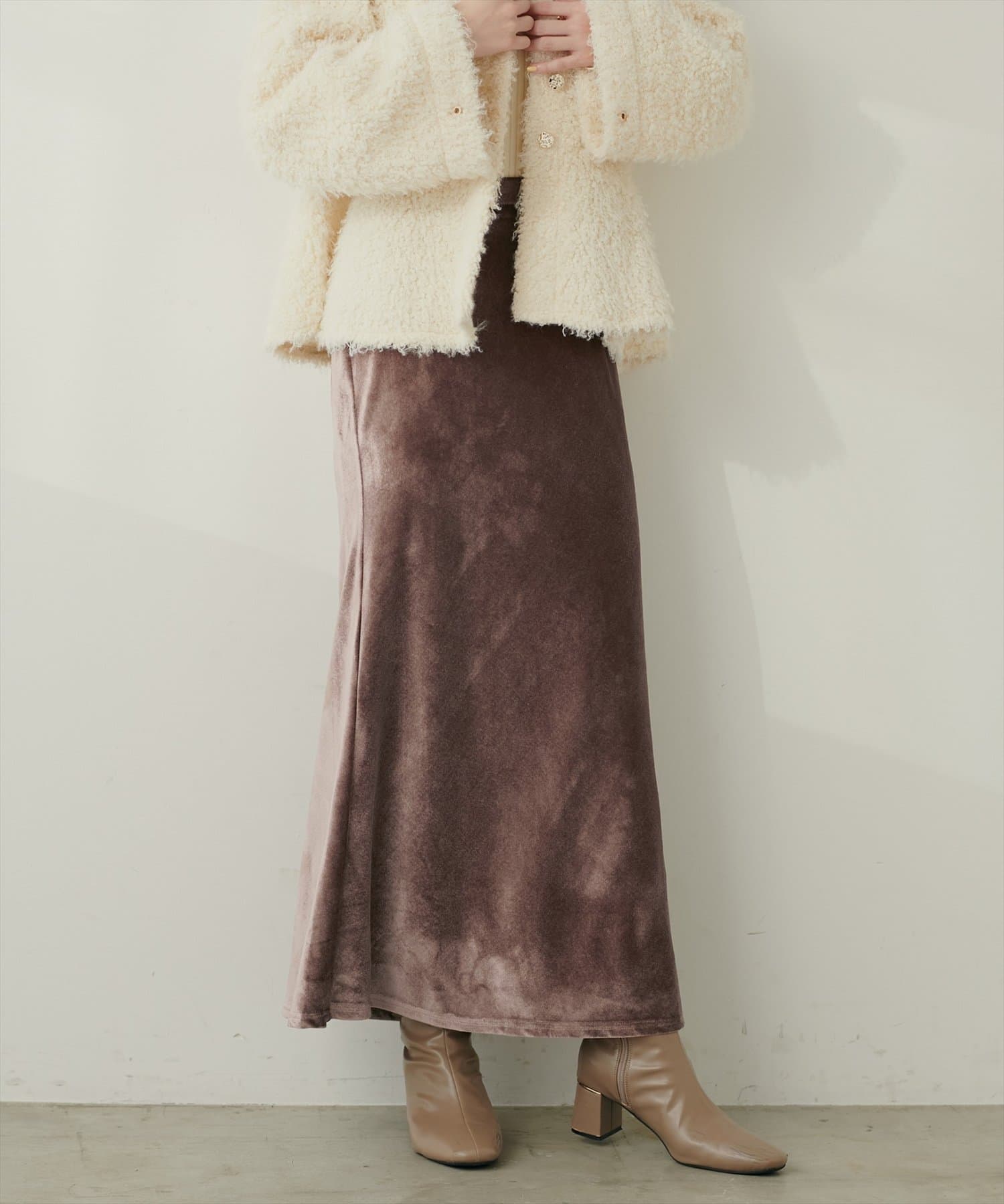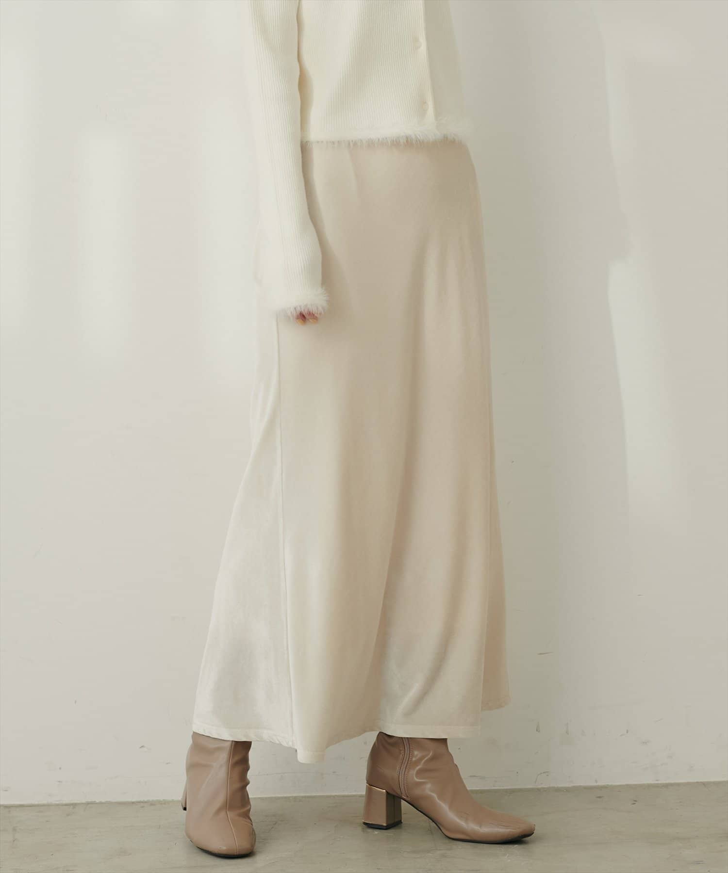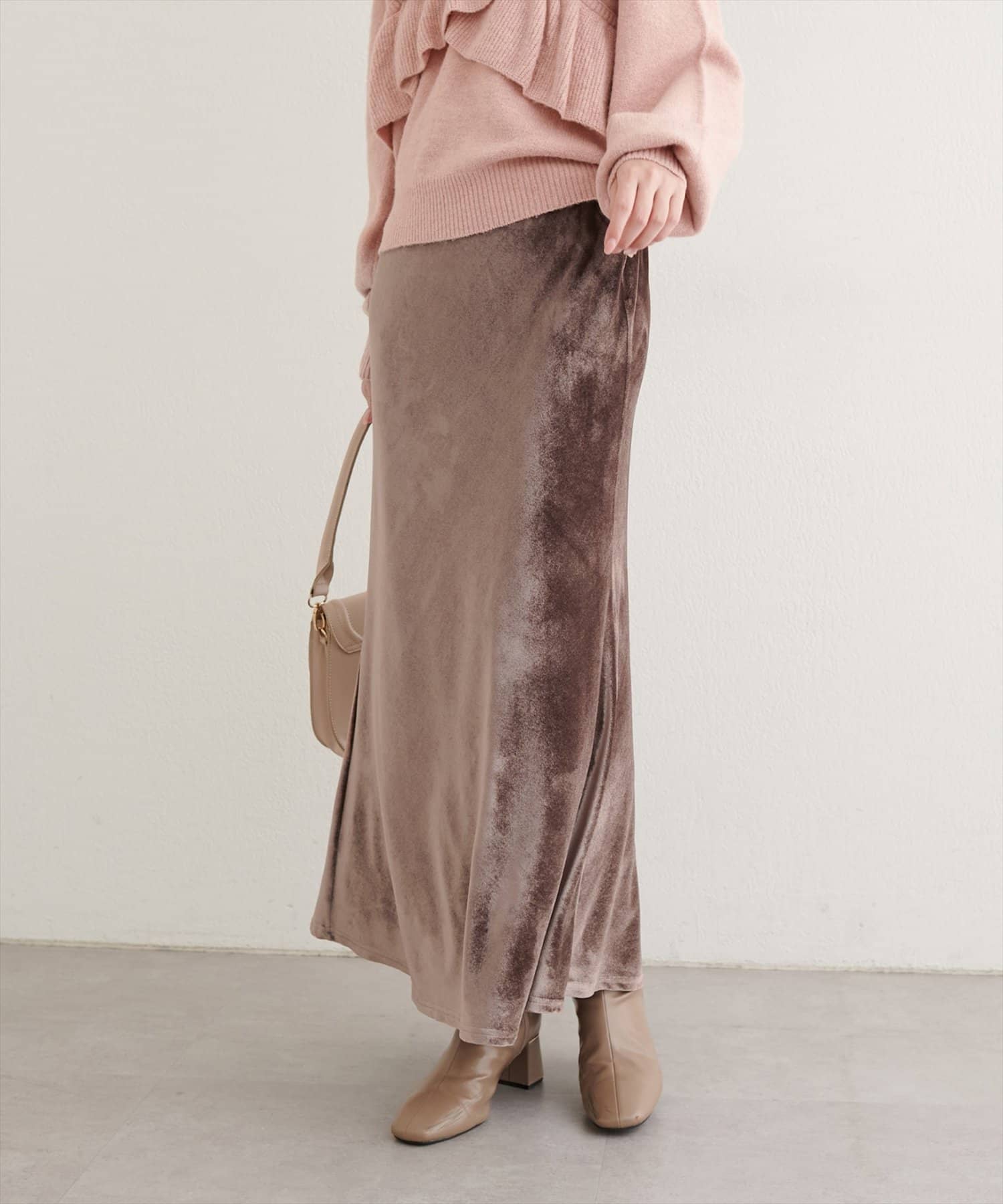 歩くたびに優雅な揺れを生み出す、ベロアマーメイドスカート。上品な光沢を放つベロア素材が、