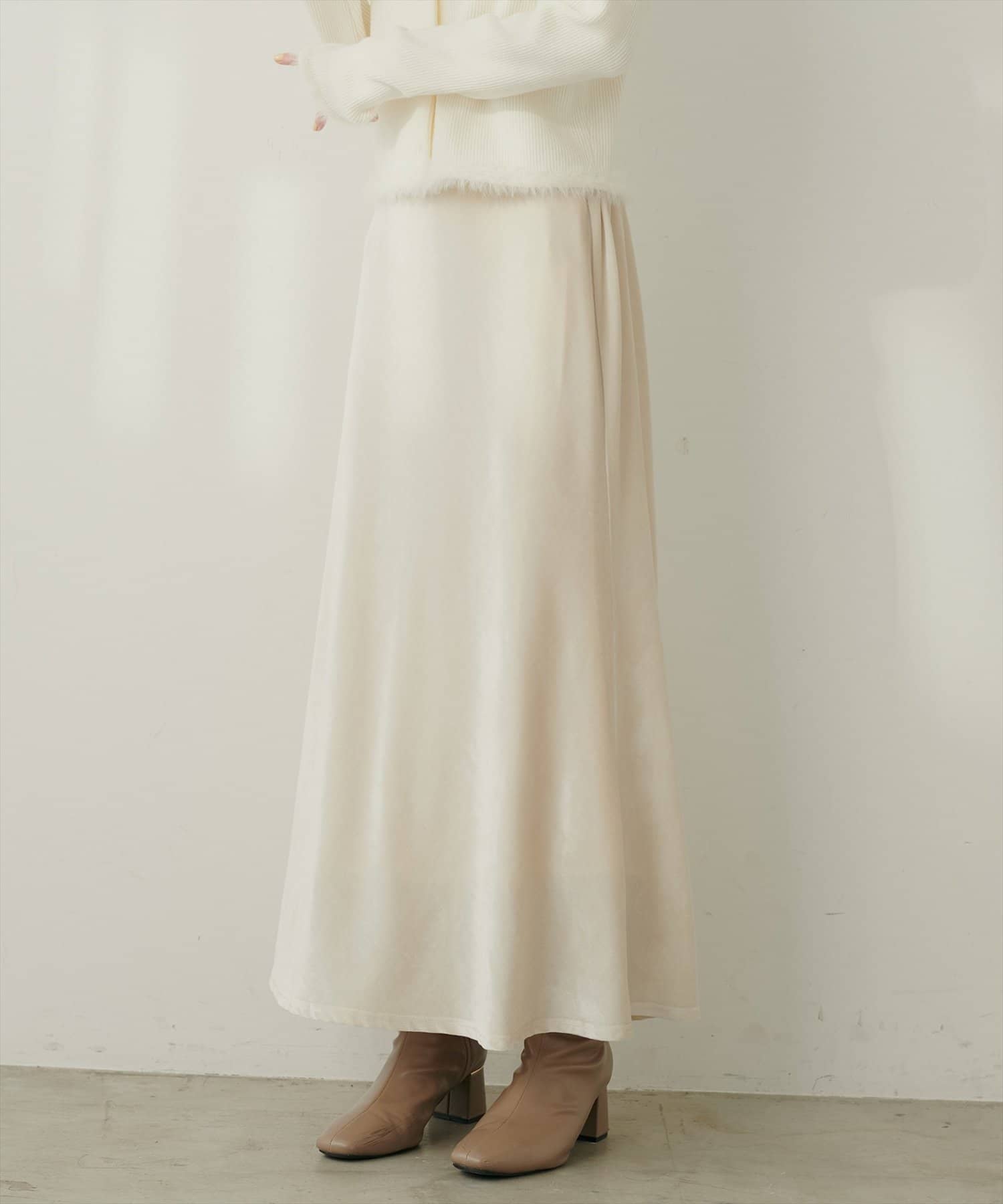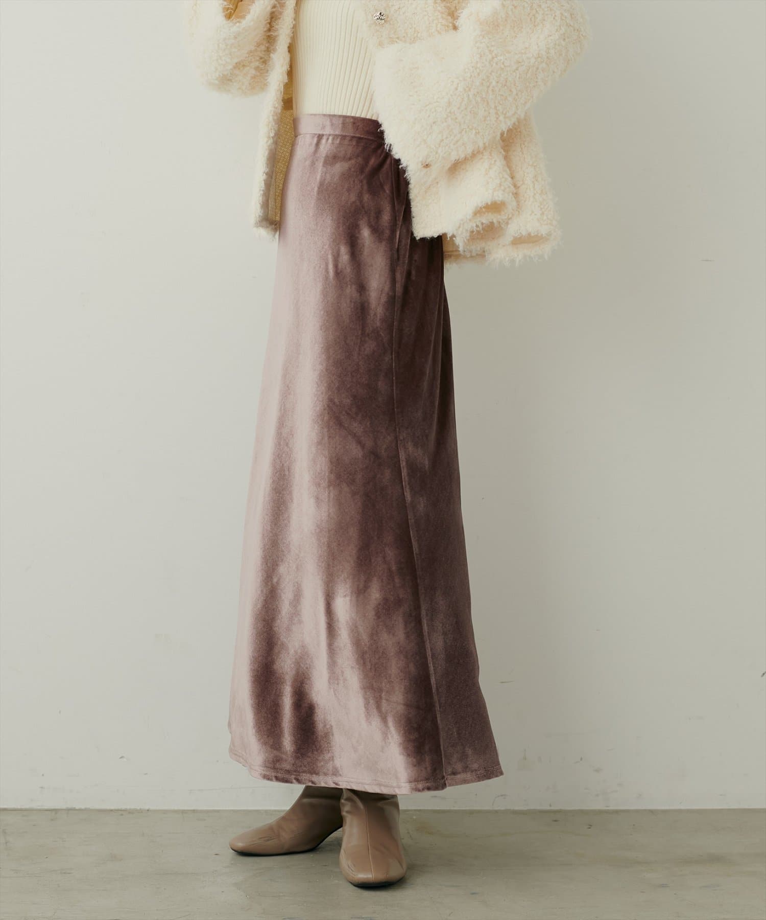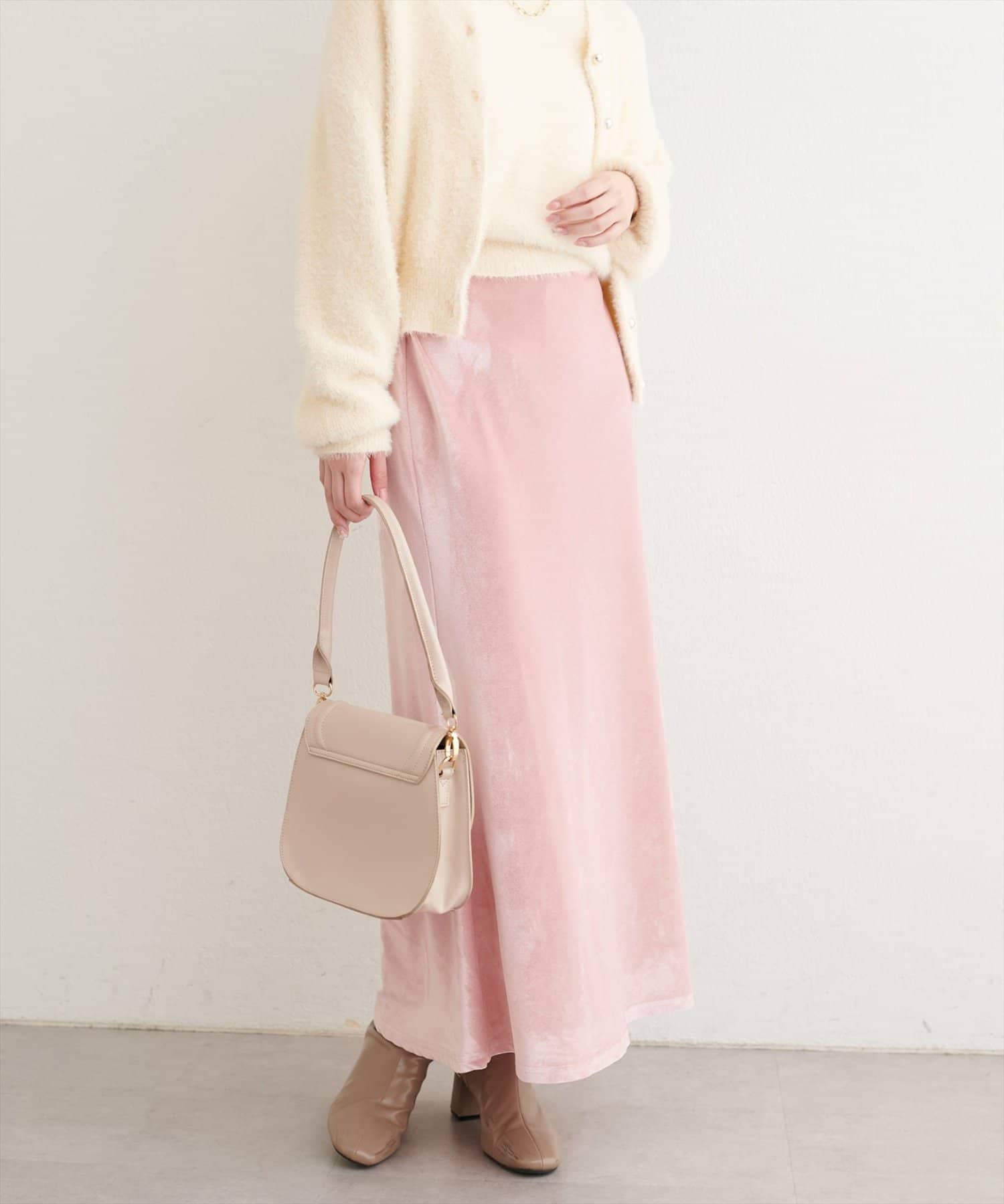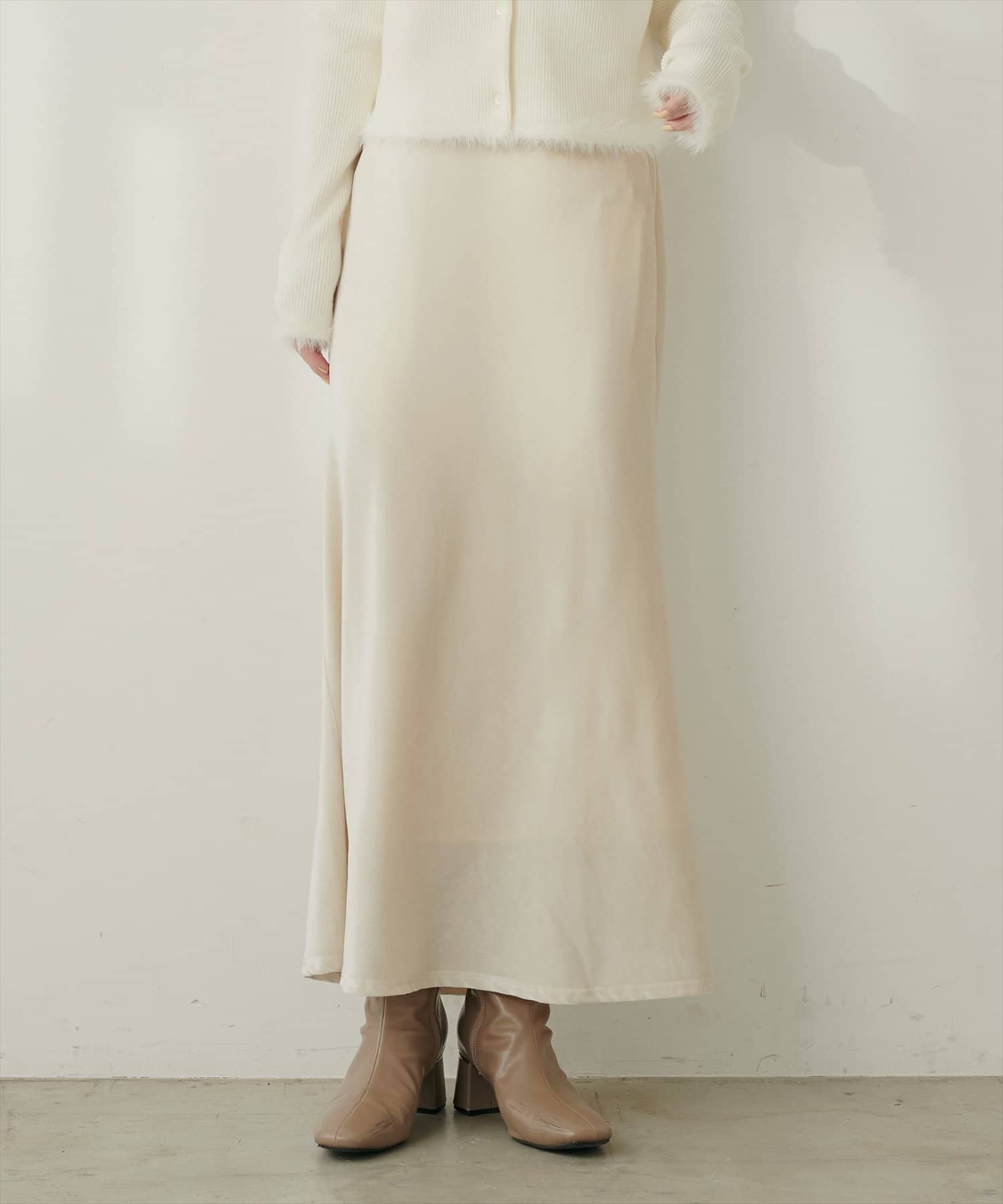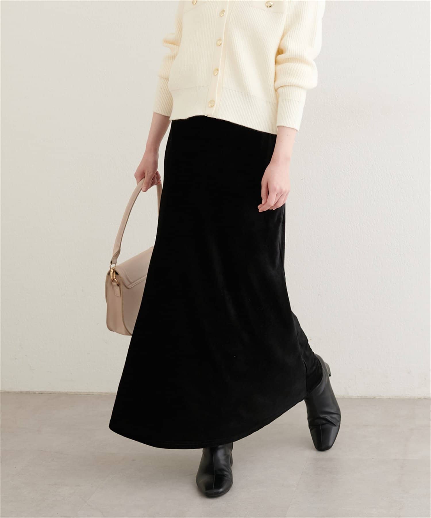 歩くたびに優雅な揺れを生み出す、ベロアマーメイドスカート。上品な光沢を放つベロア素材が、