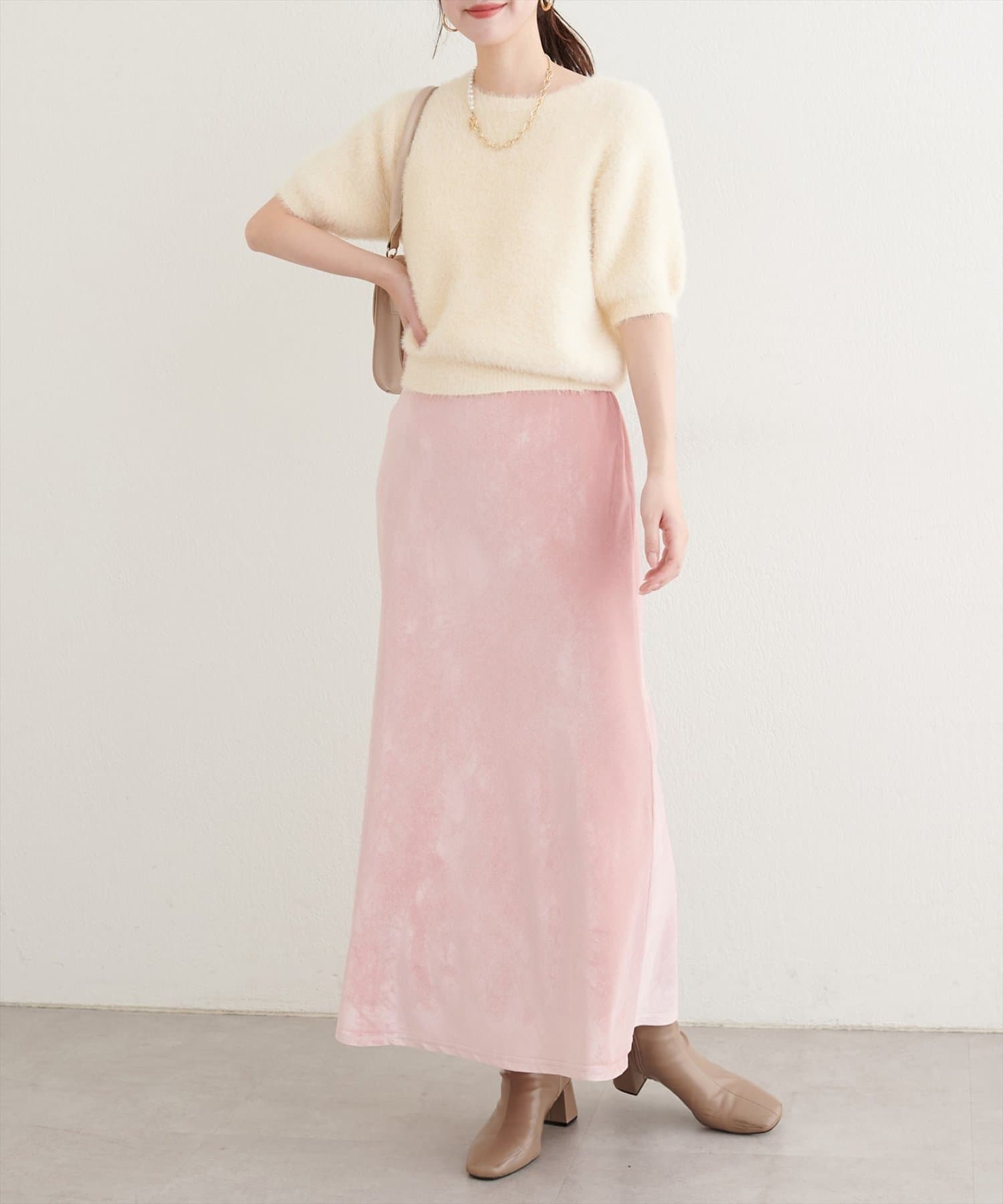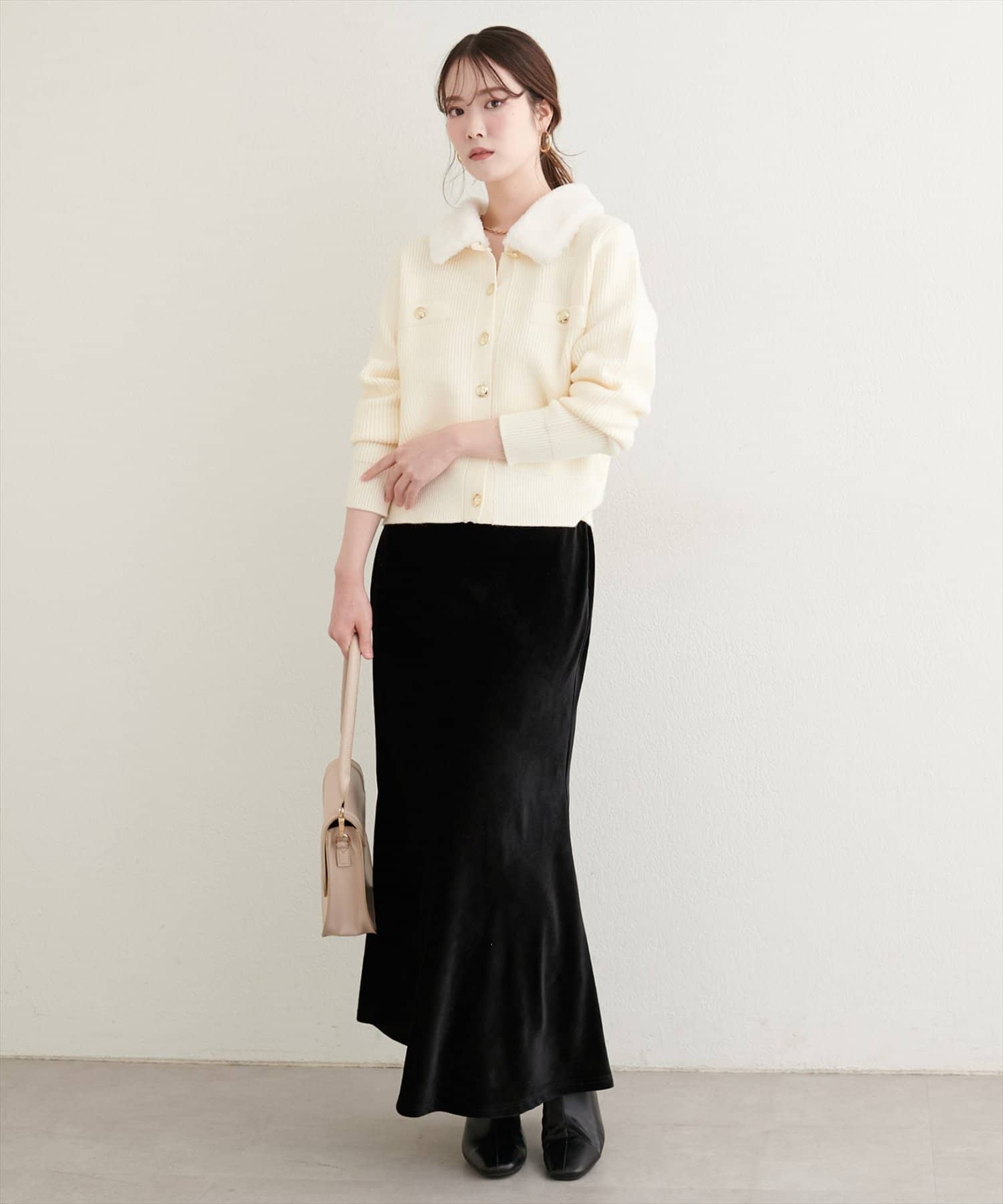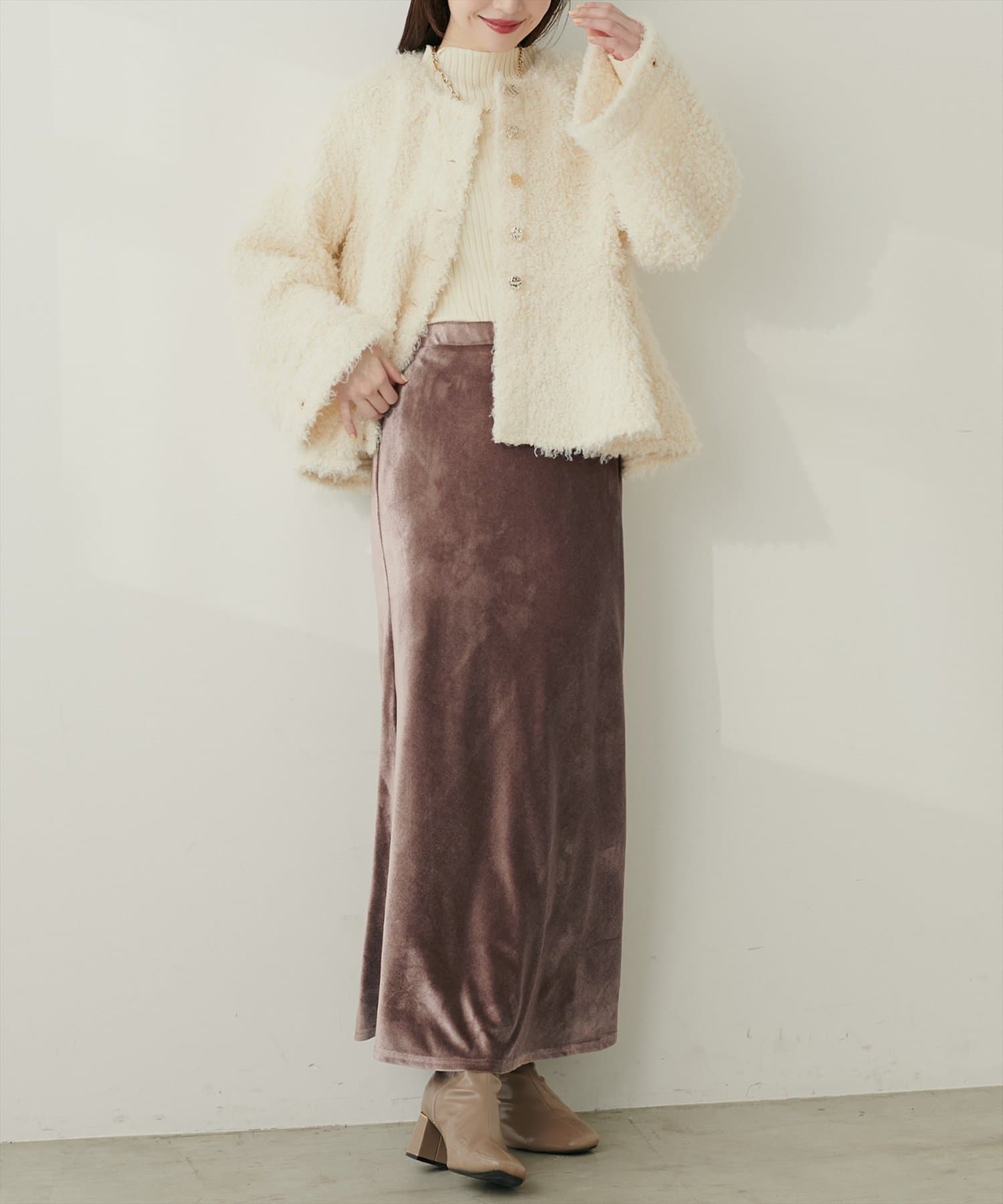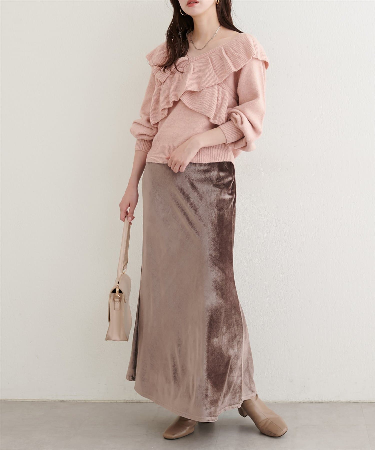 歩くたびに優雅な揺れを生み出す、ベロアマーメイドスカート。上品な光沢を放つベロア素材が、