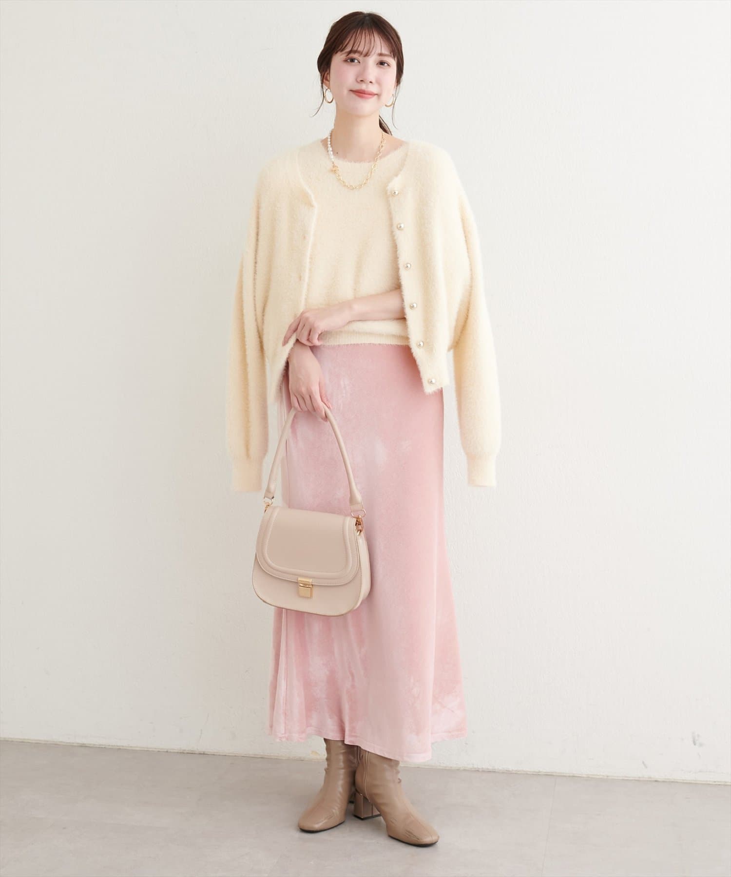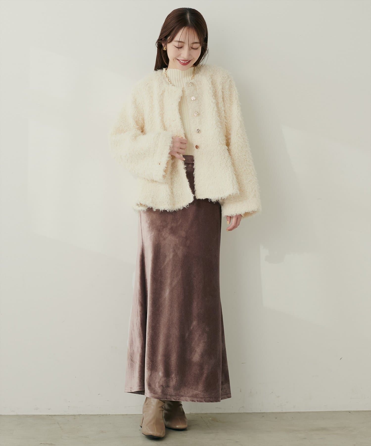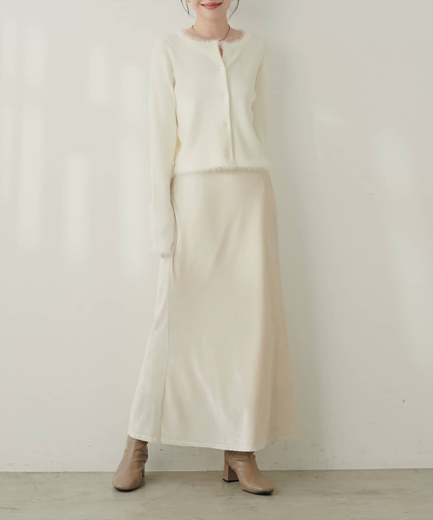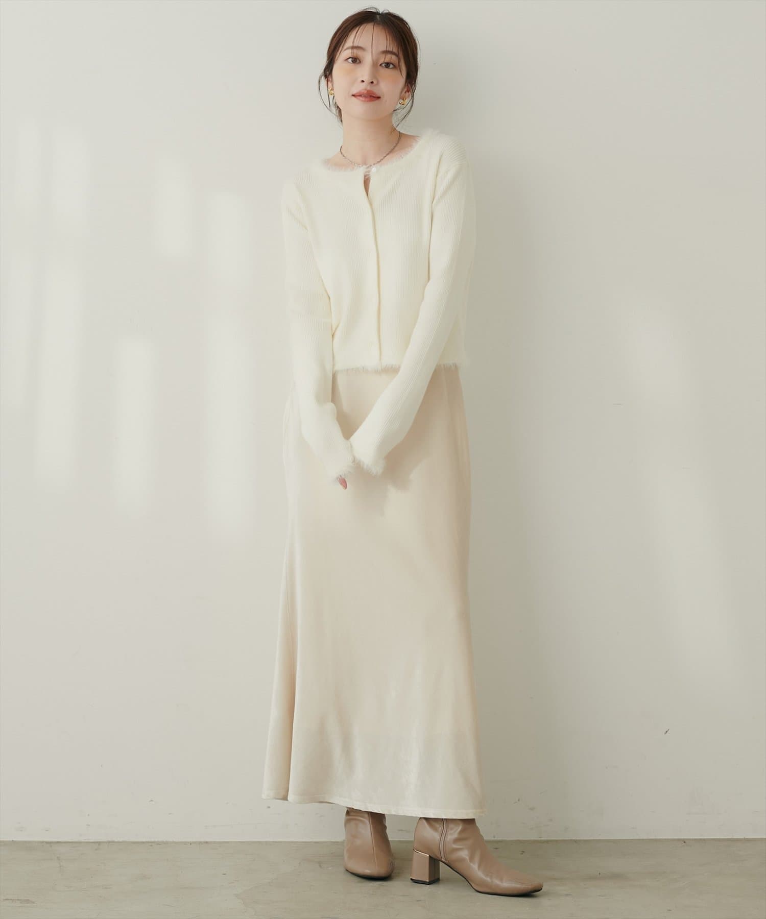 歩くたびに優雅な揺れを生み出す、ベロアマーメイドスカート。上品な光沢を放つベロア素材が、