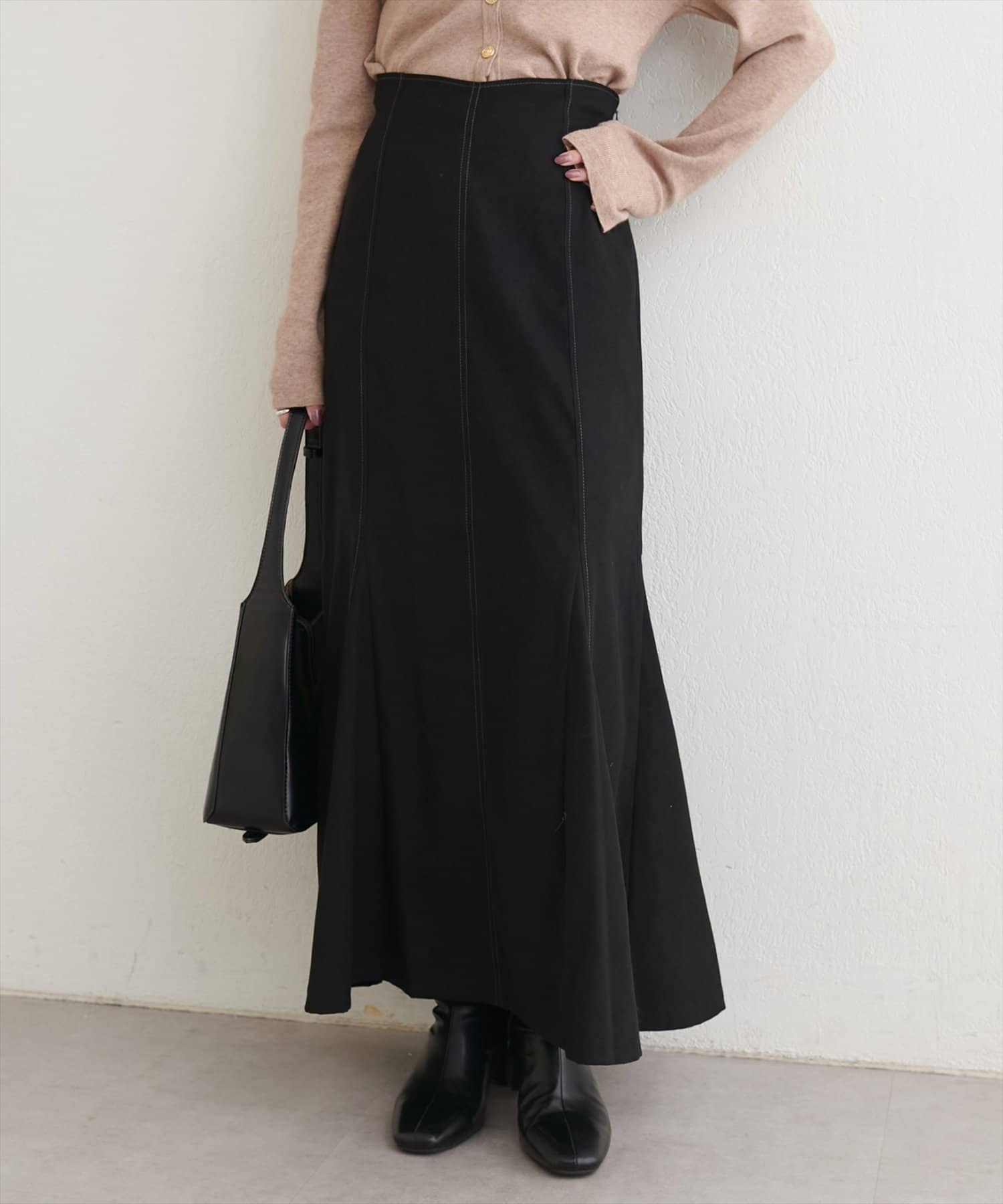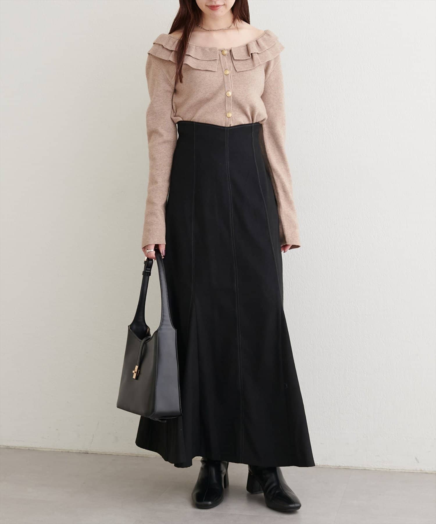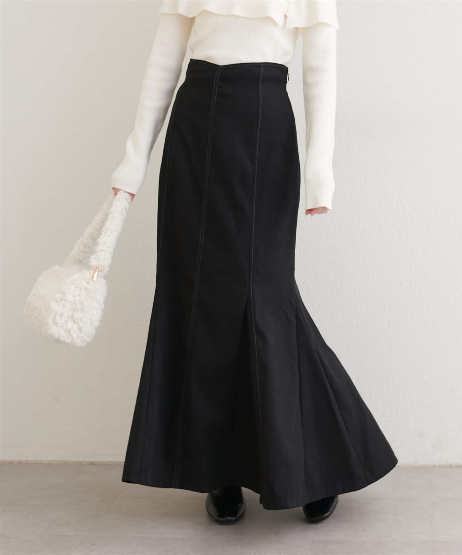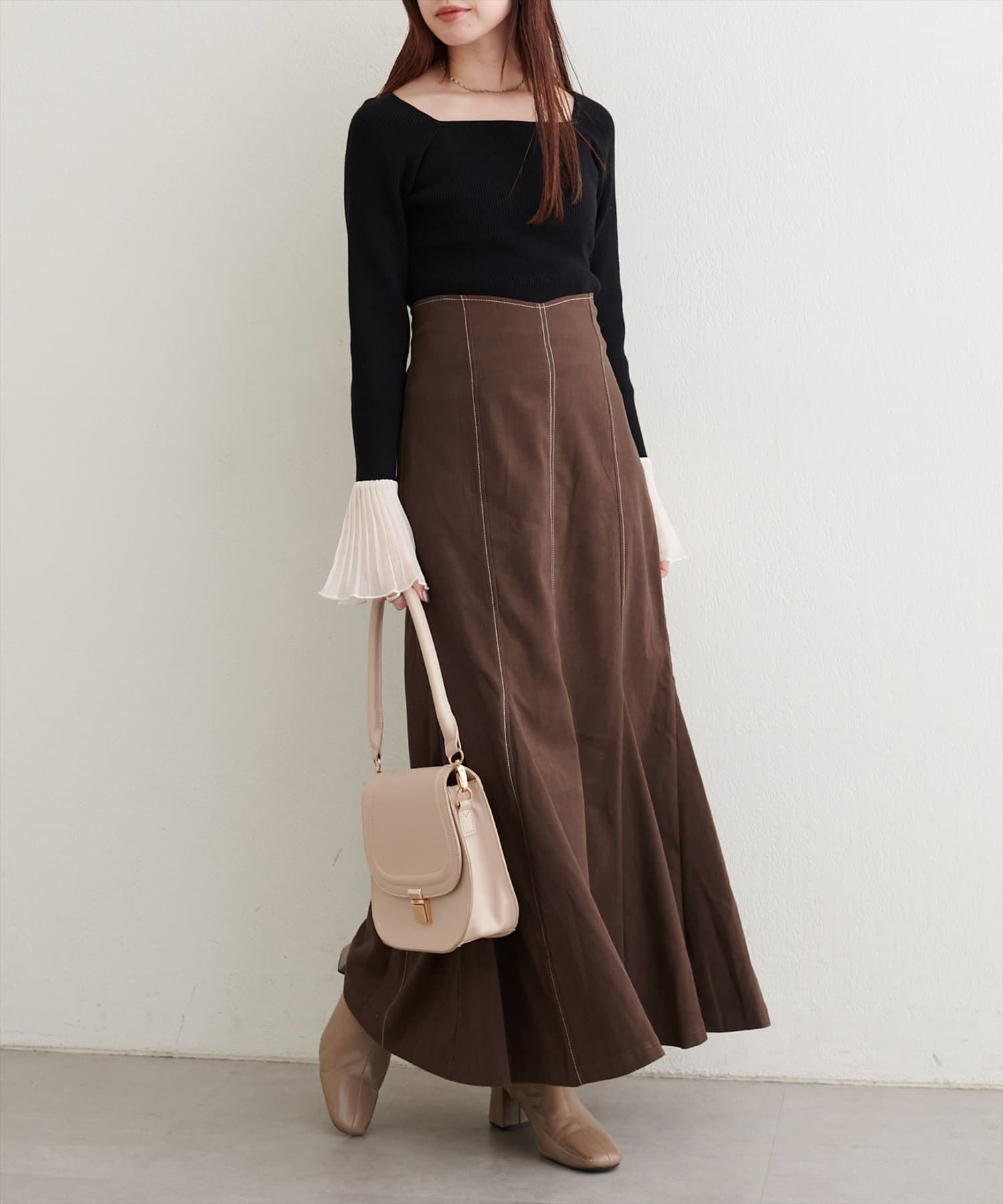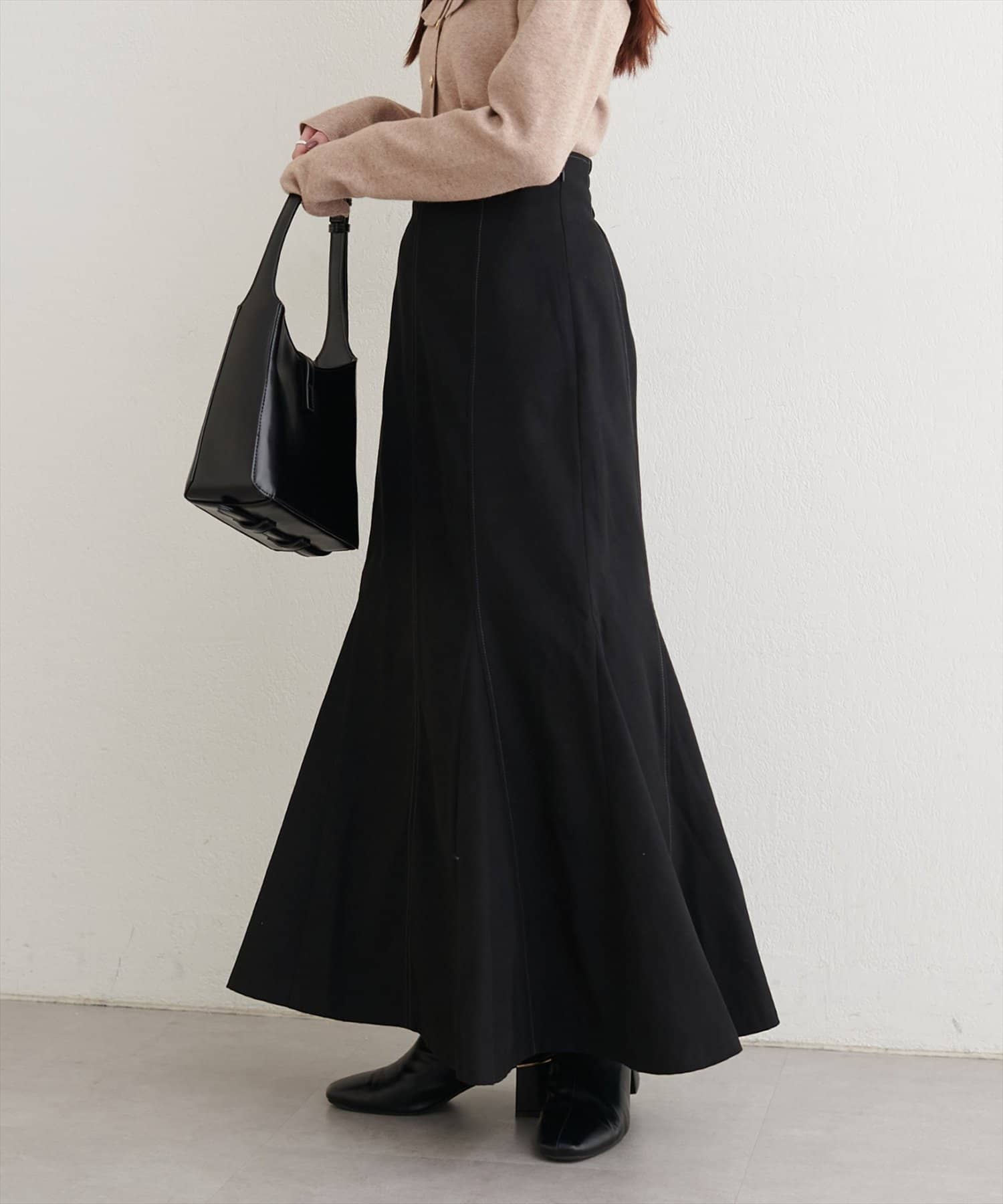 トップスにコンパクトなニットやブラウスを合わせ、スカートの美しいシルエットを強調することでこなれた印象に。