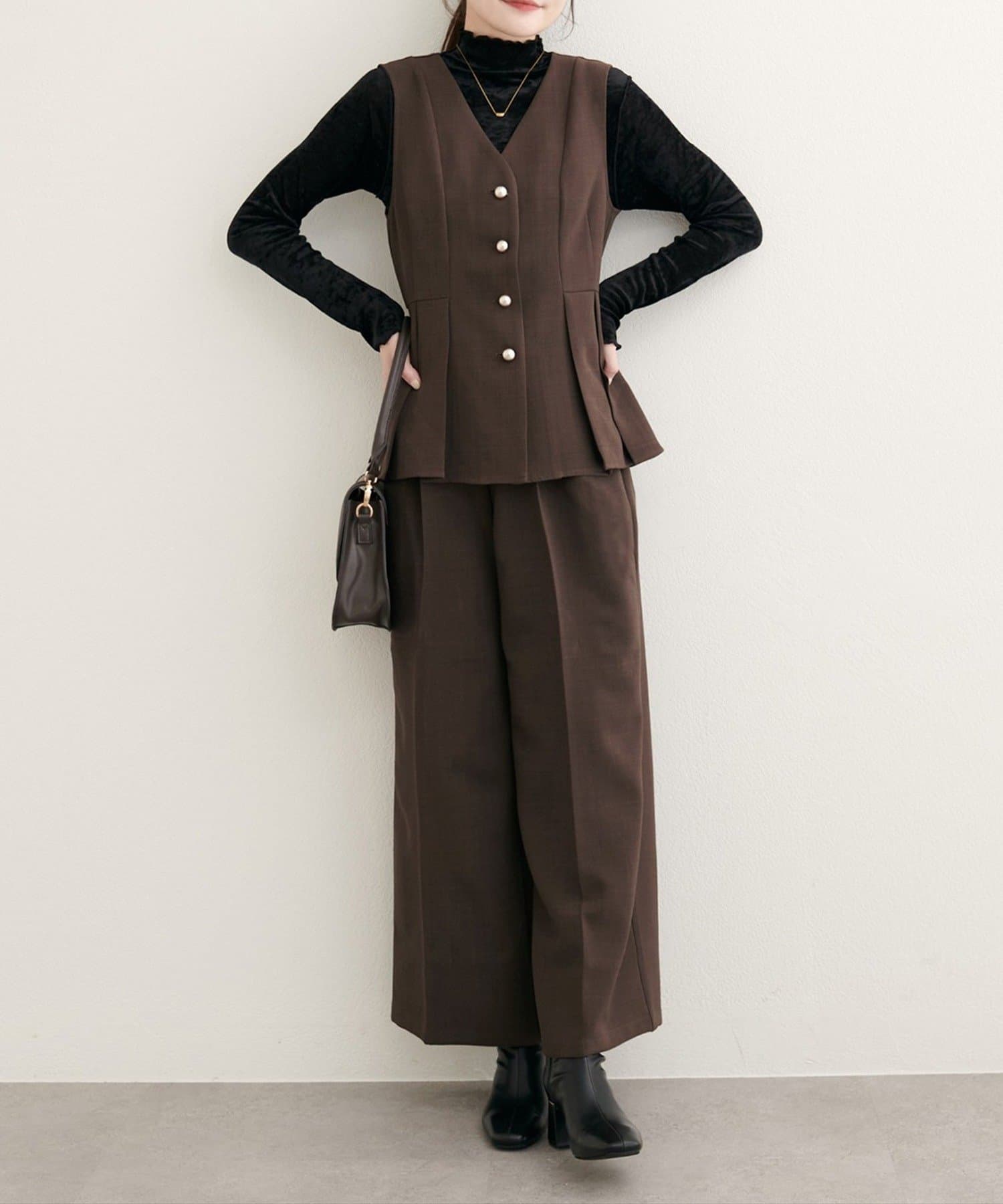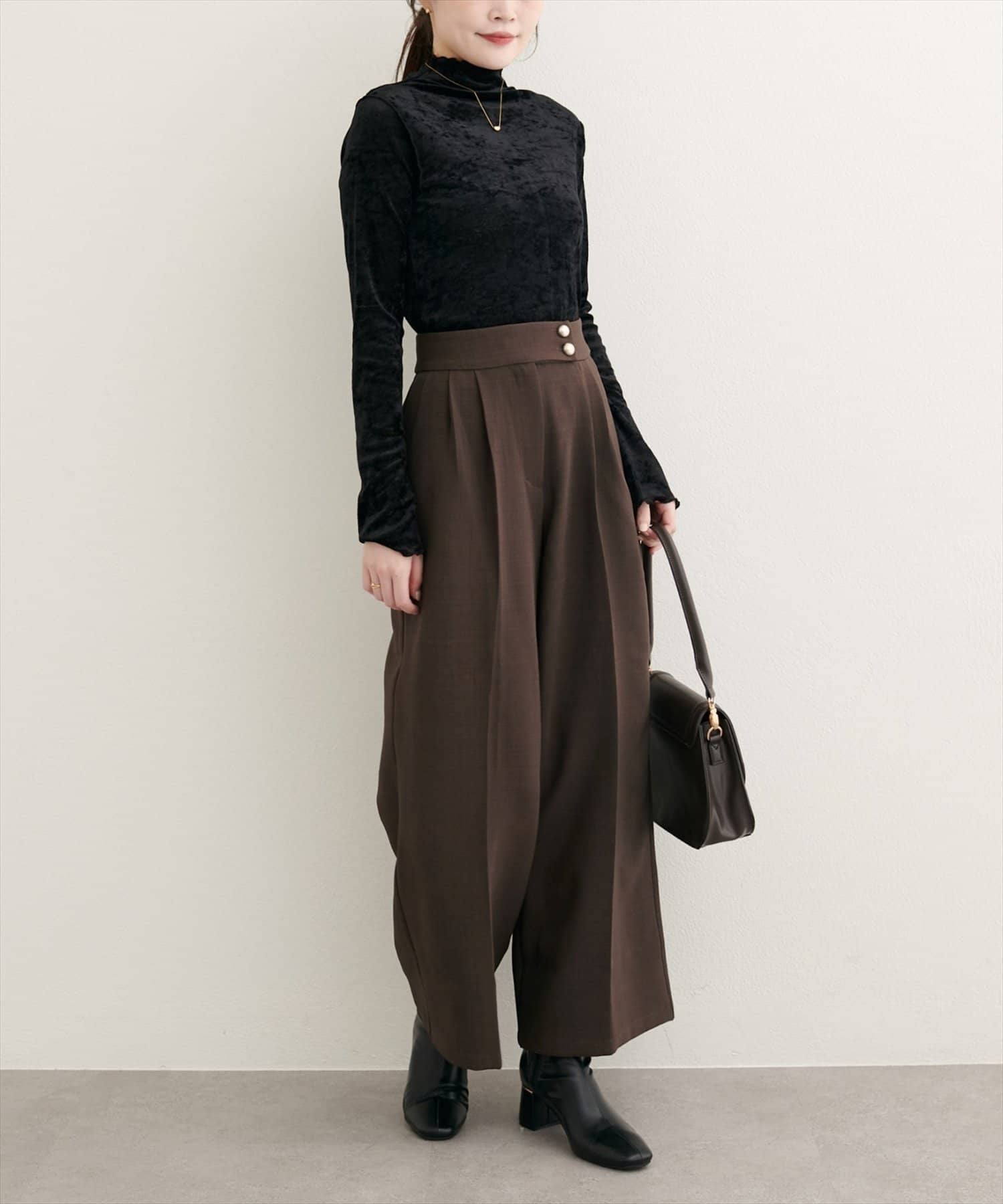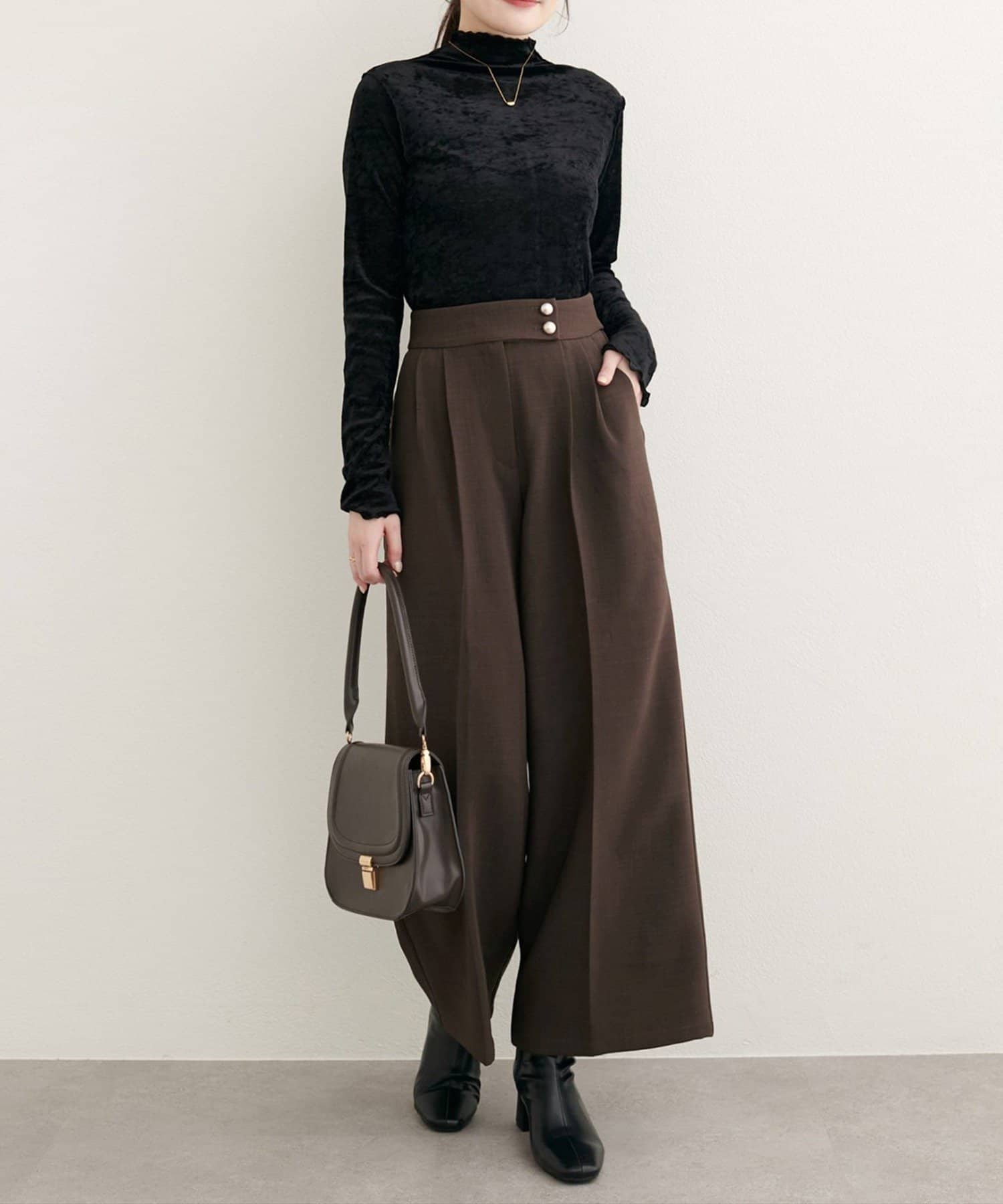 コーディネート全体を上品に引き締めます。リラックス感のあるワイドシルエットは、トレンド感たっぷり。