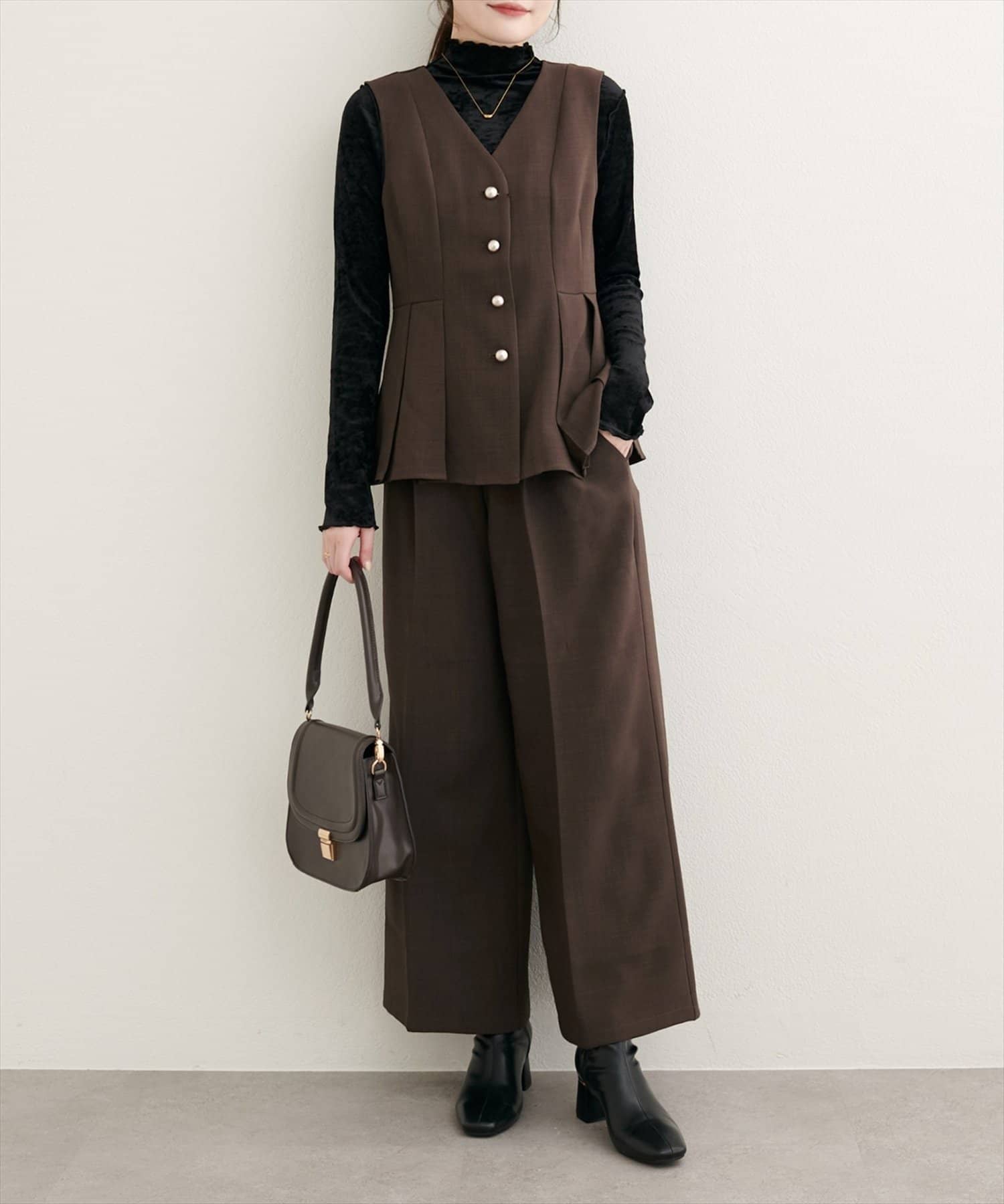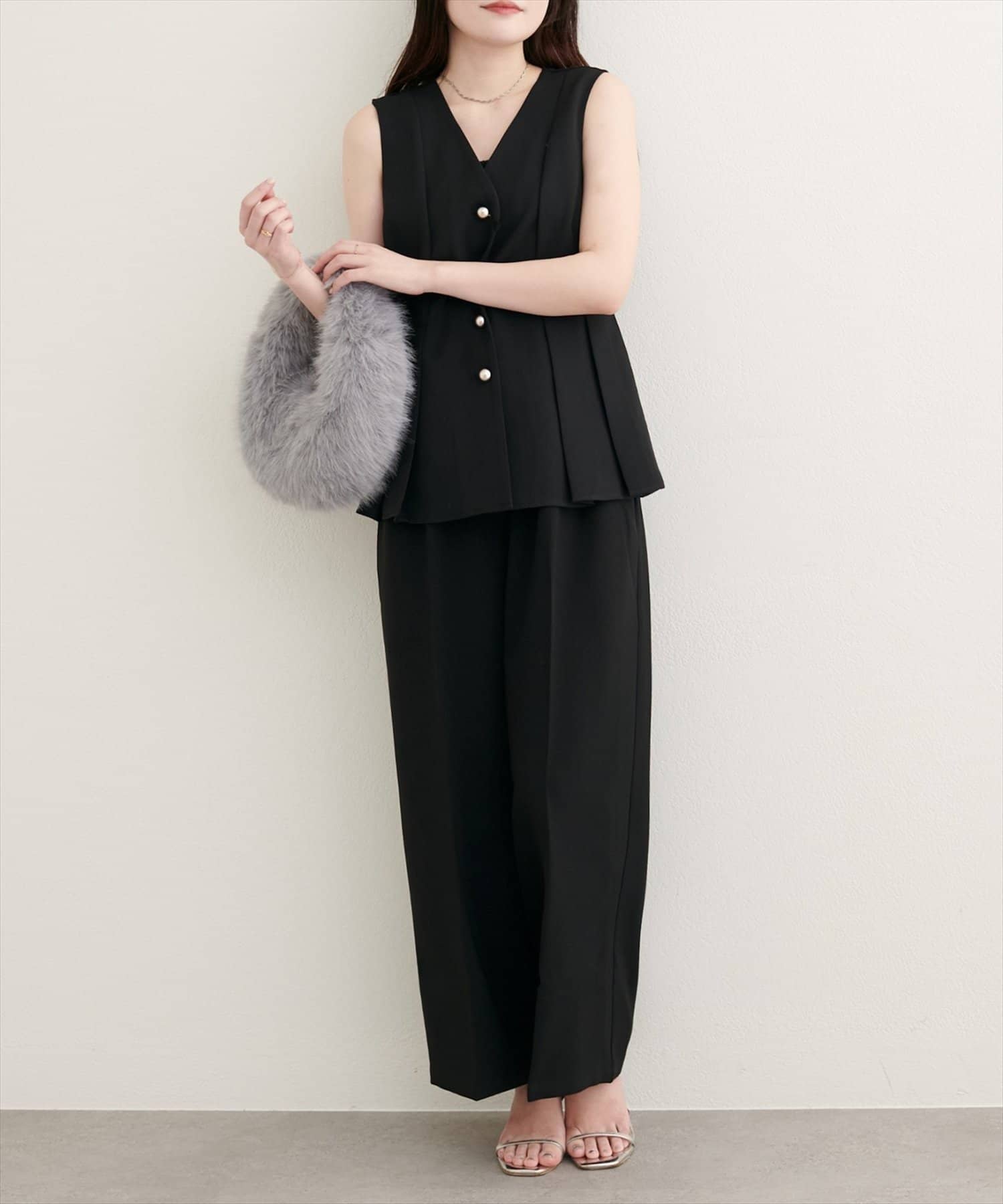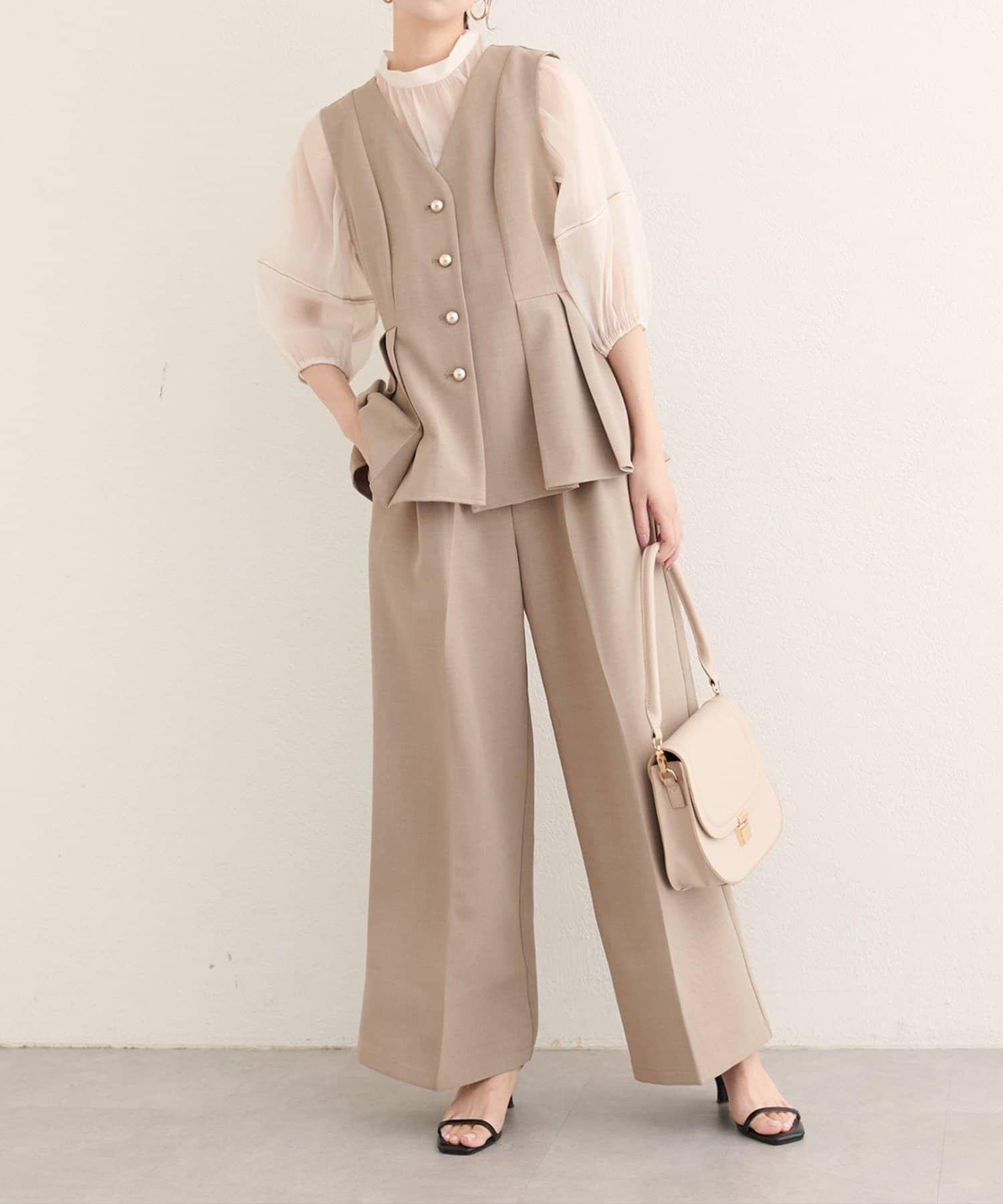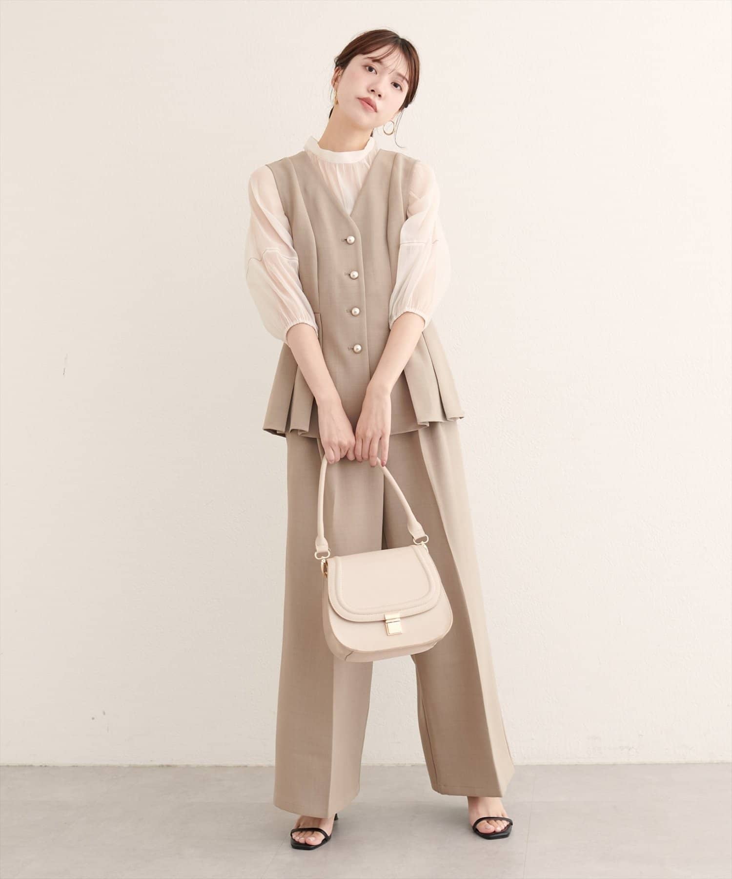 コーディネート全体を上品に引き締めます。リラックス感のあるワイドシルエットは、トレンド感たっぷり。