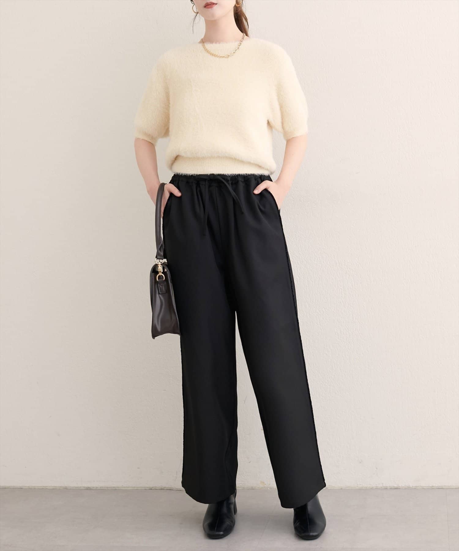 おうちでのリラックスタイムはもちろん、オフィスやちょっとしたお出かけにも対応できる、汎用性の高い一本です。ウエストはゴム仕様で着脱も簡単。