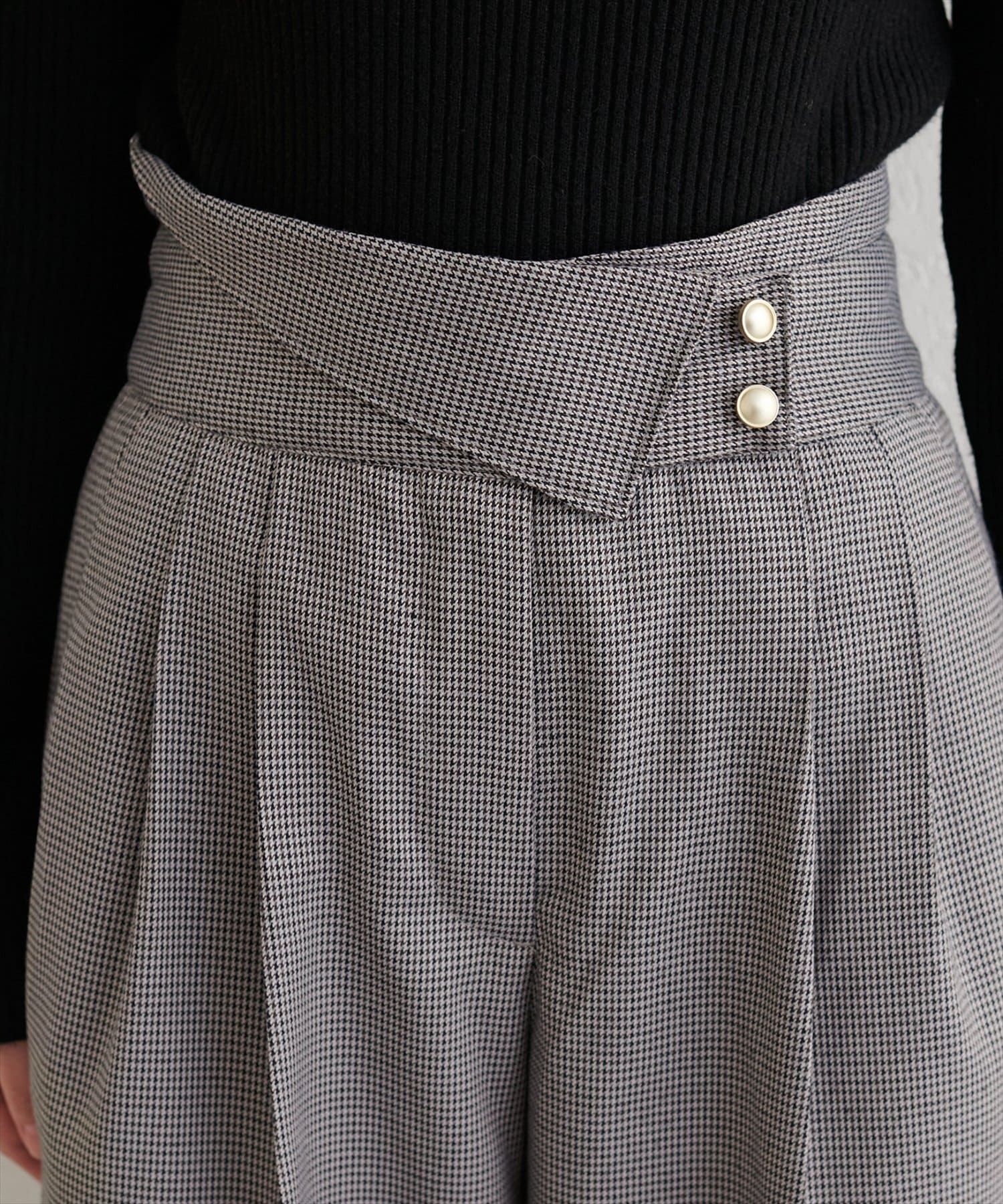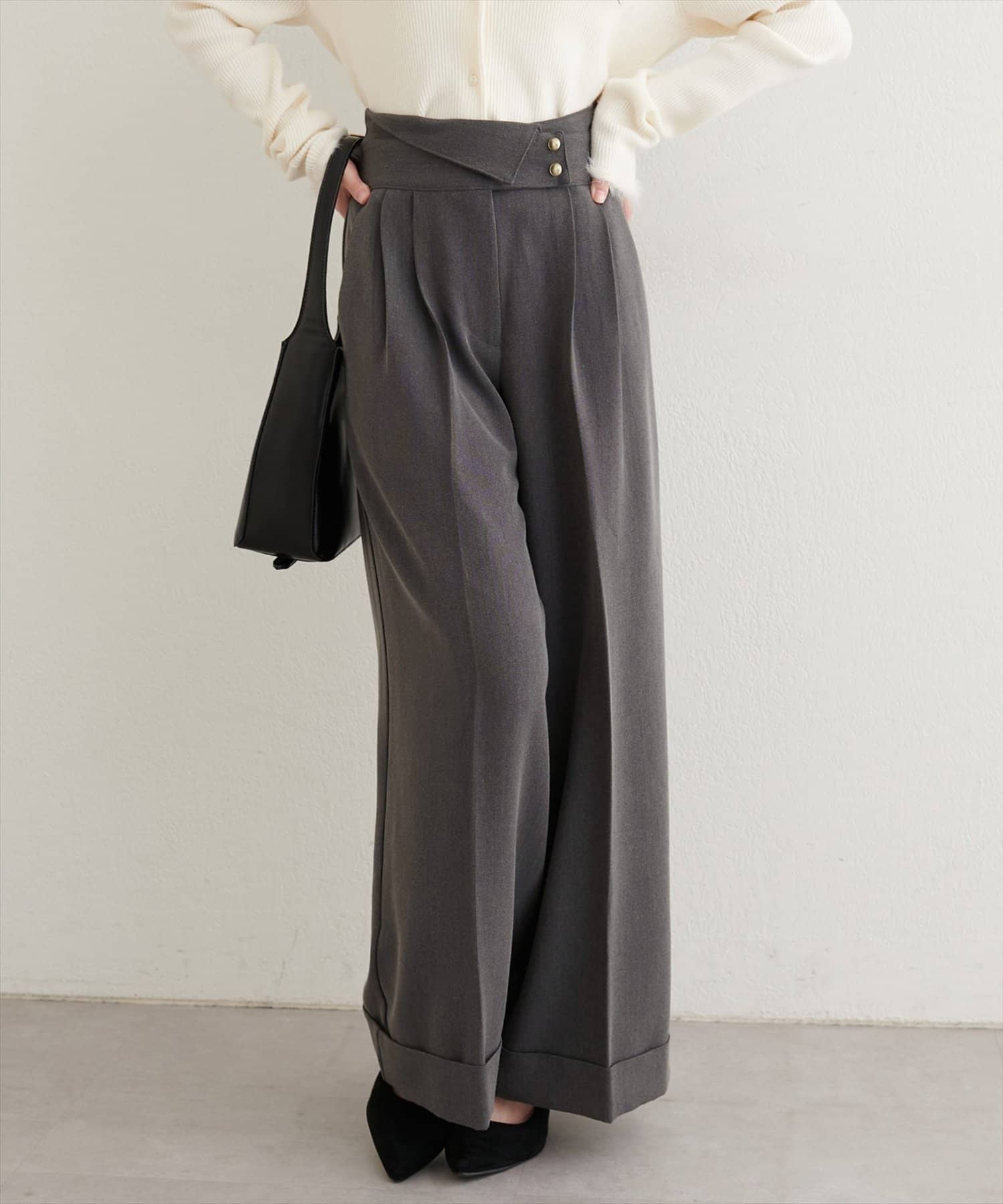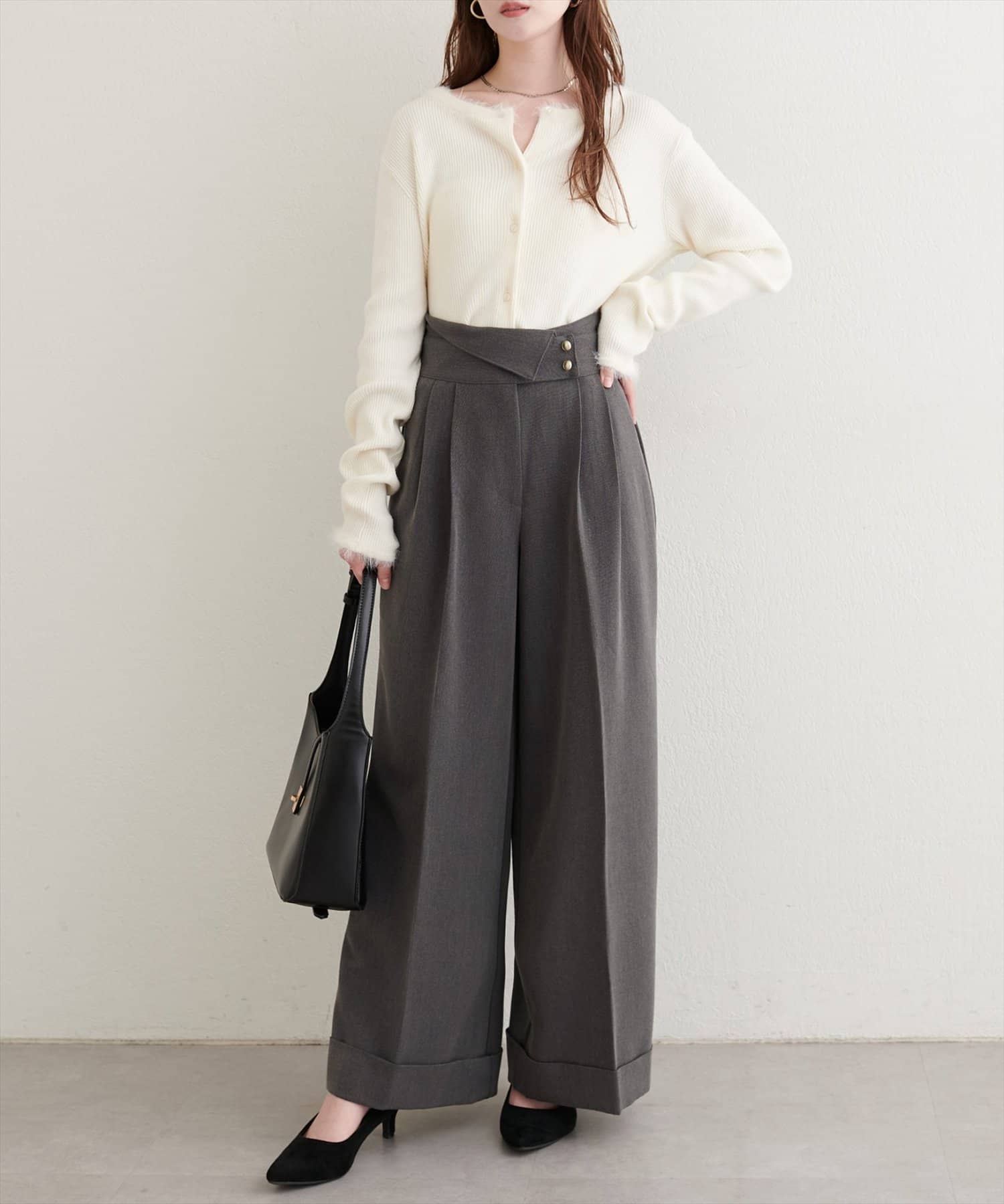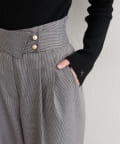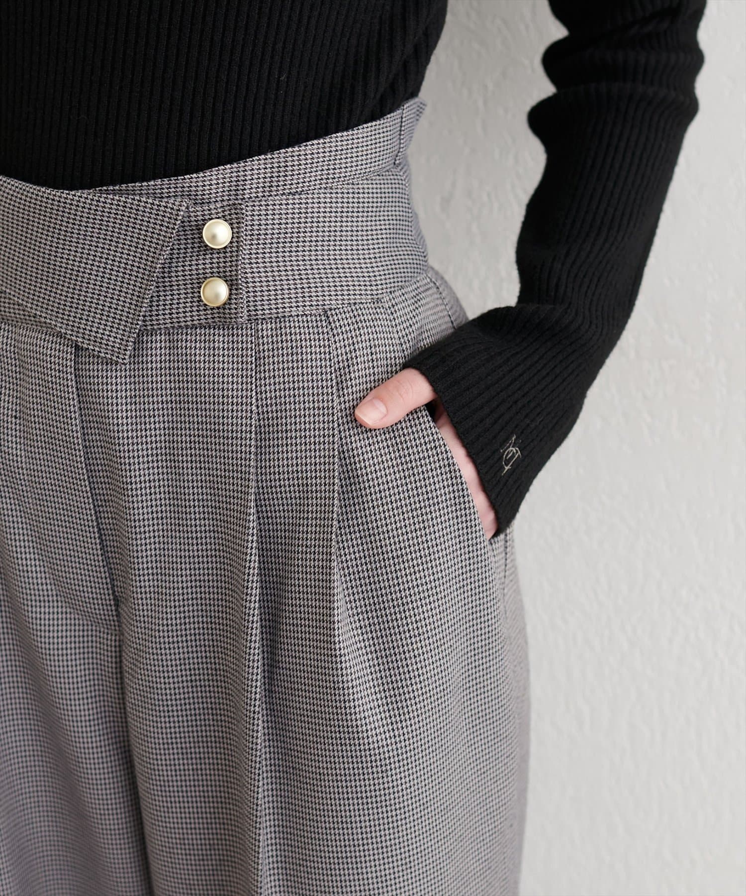 ウエスト部分にあしらわれたボタンが、さりげないアクセントとなり、トップスをインした際にもスタイリッシュに決まります。