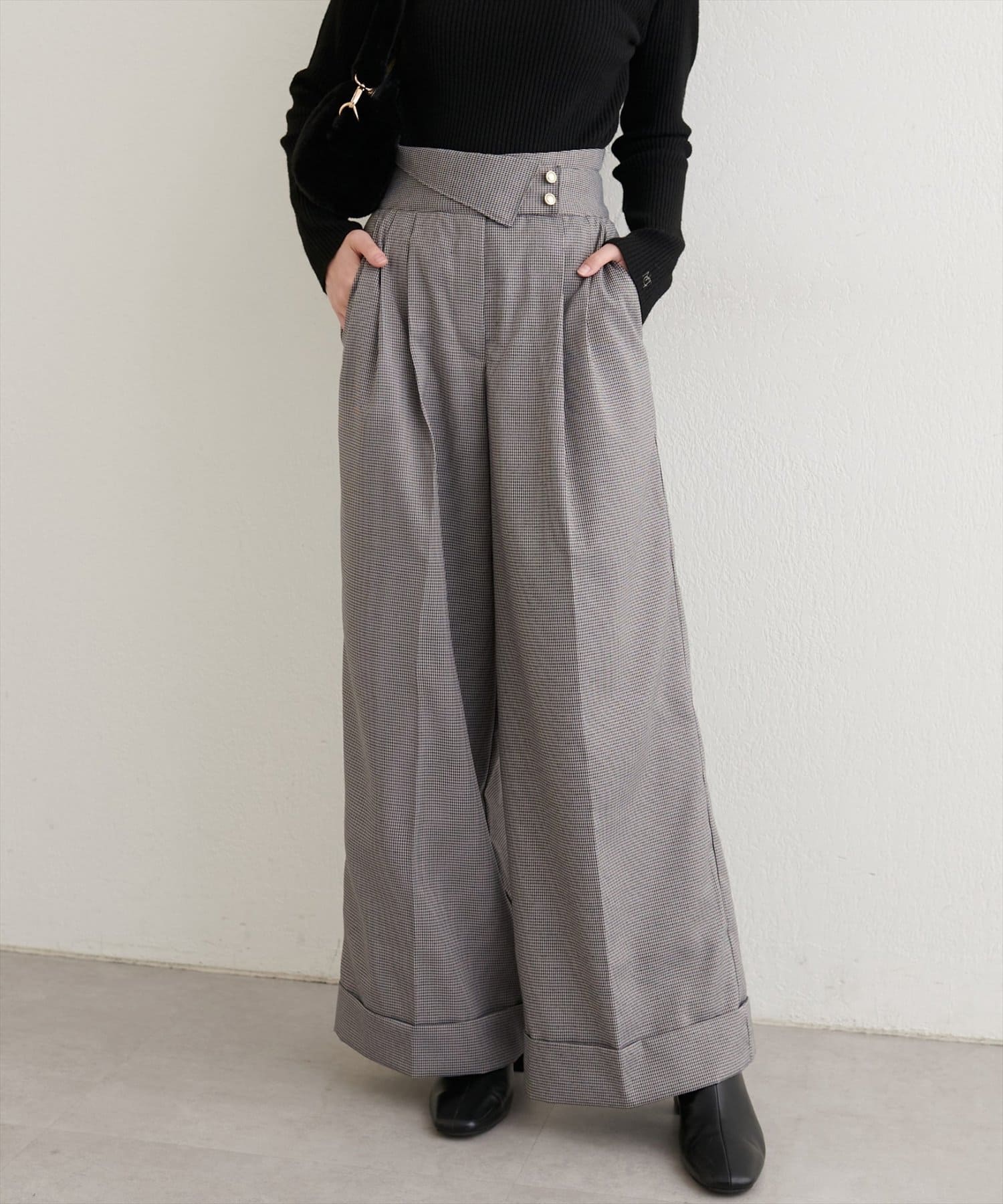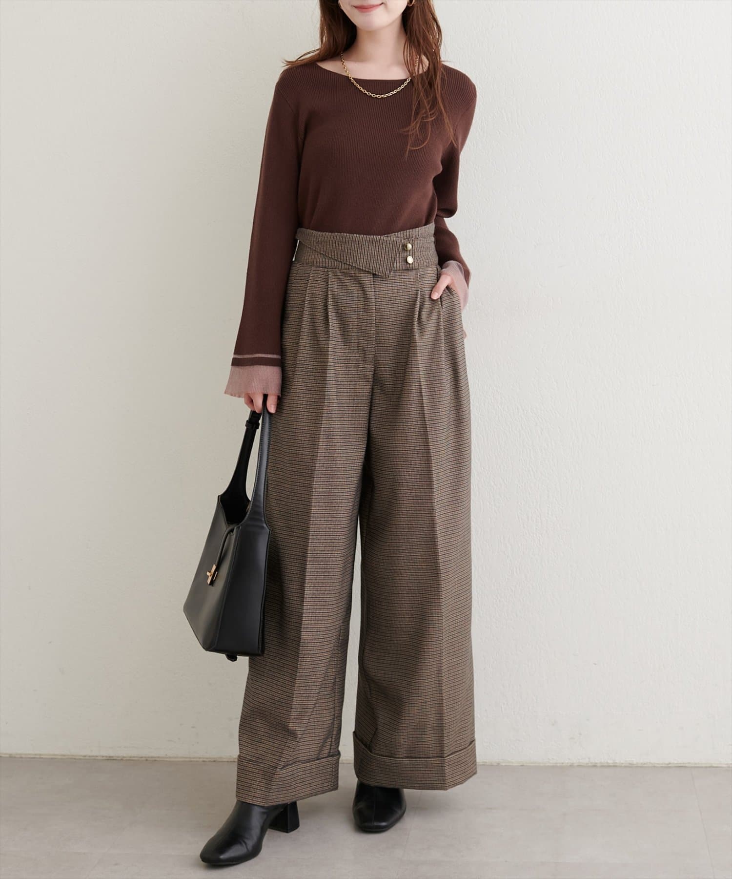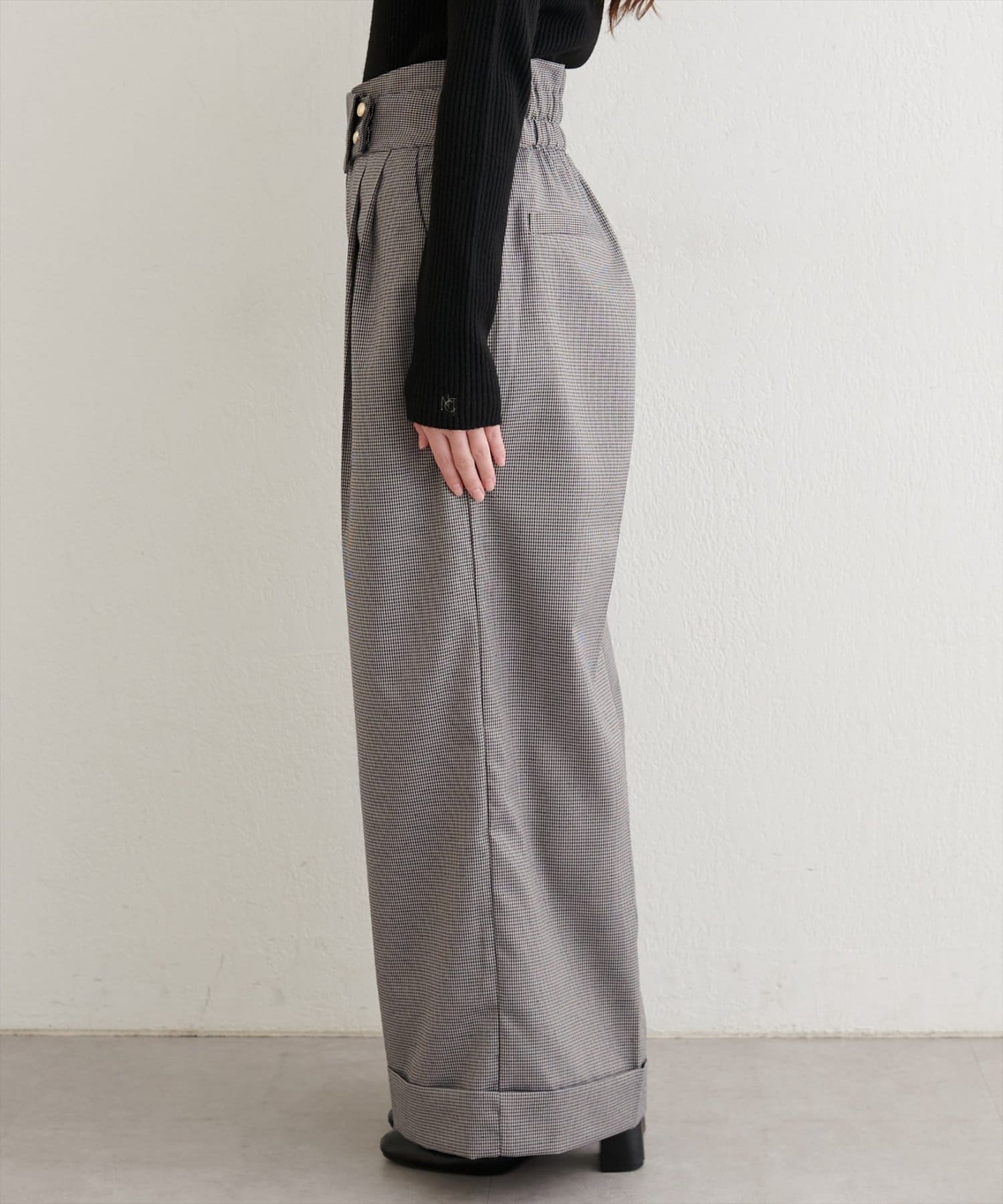 ウエスト部分にあしらわれたボタンが、さりげないアクセントとなり、トップスをインした際にもスタイリッシュに決まります。