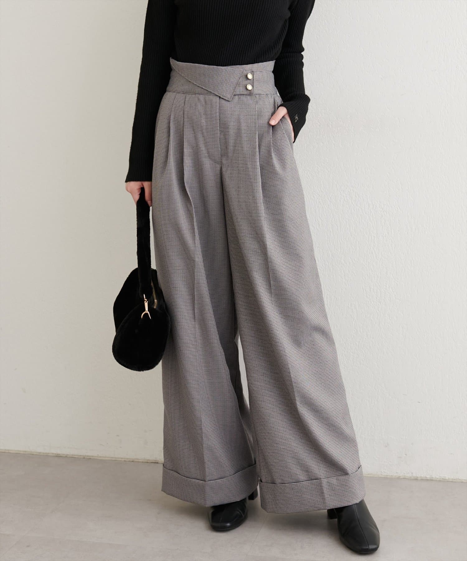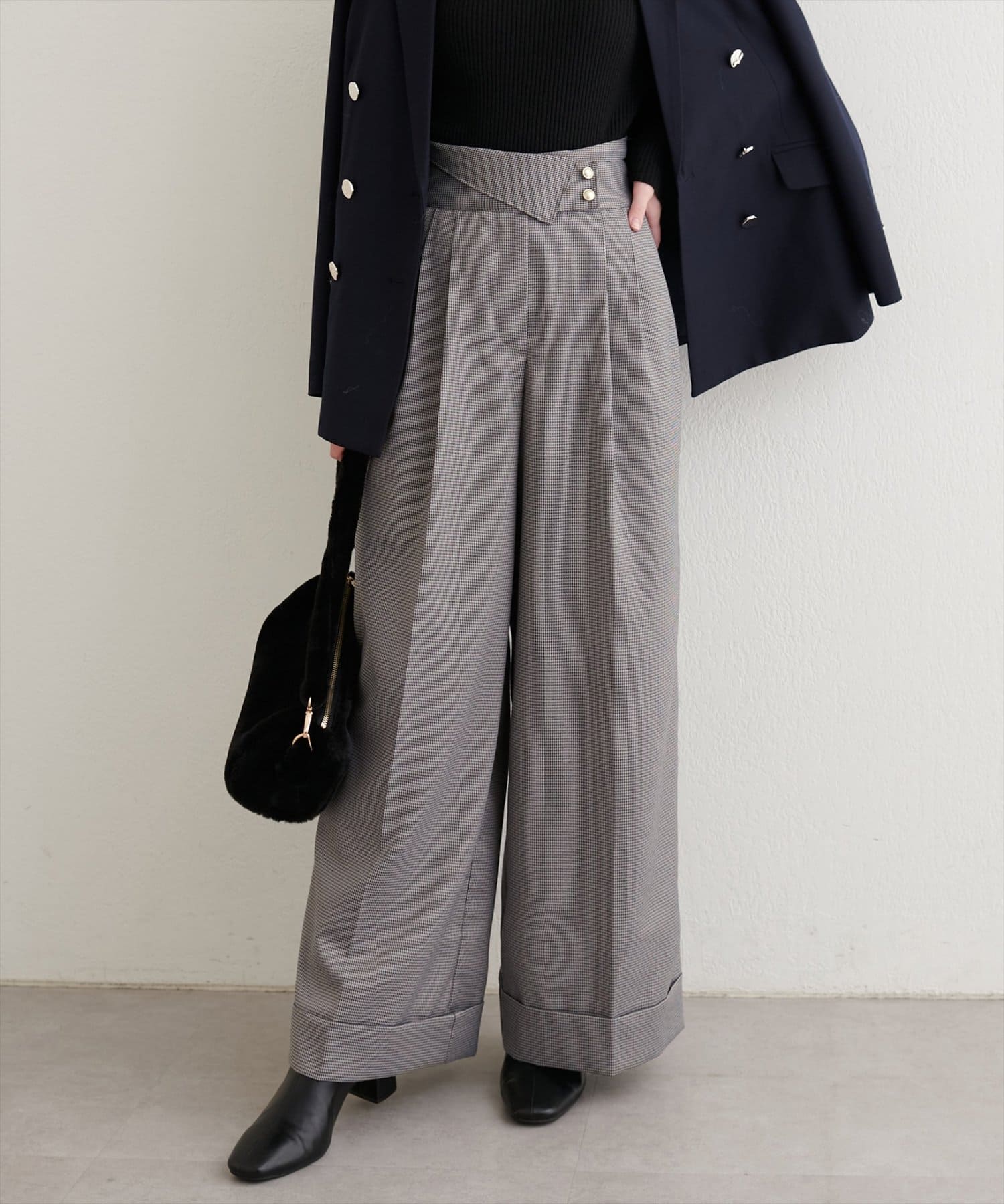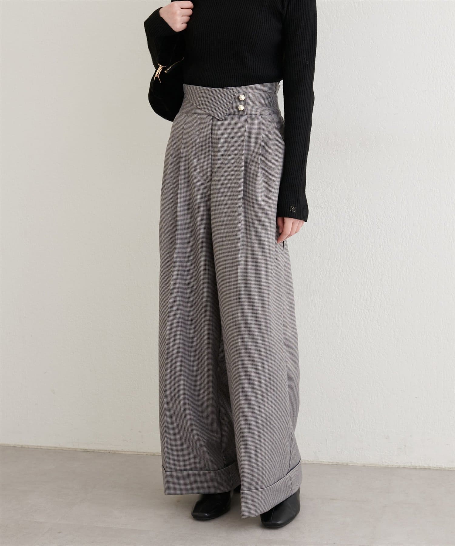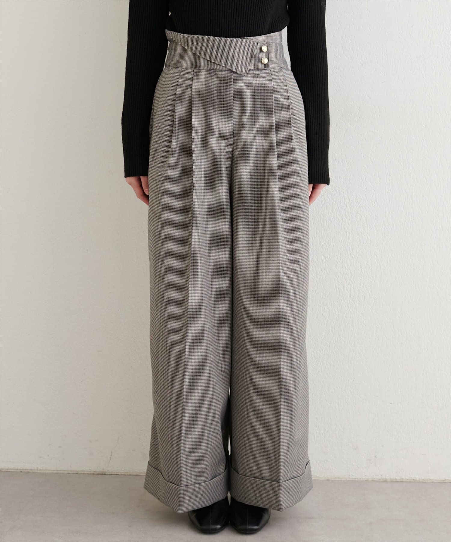 ウエスト部分にあしらわれたボタンが、さりげないアクセントとなり、トップスをインした際にもスタイリッシュに決まります。