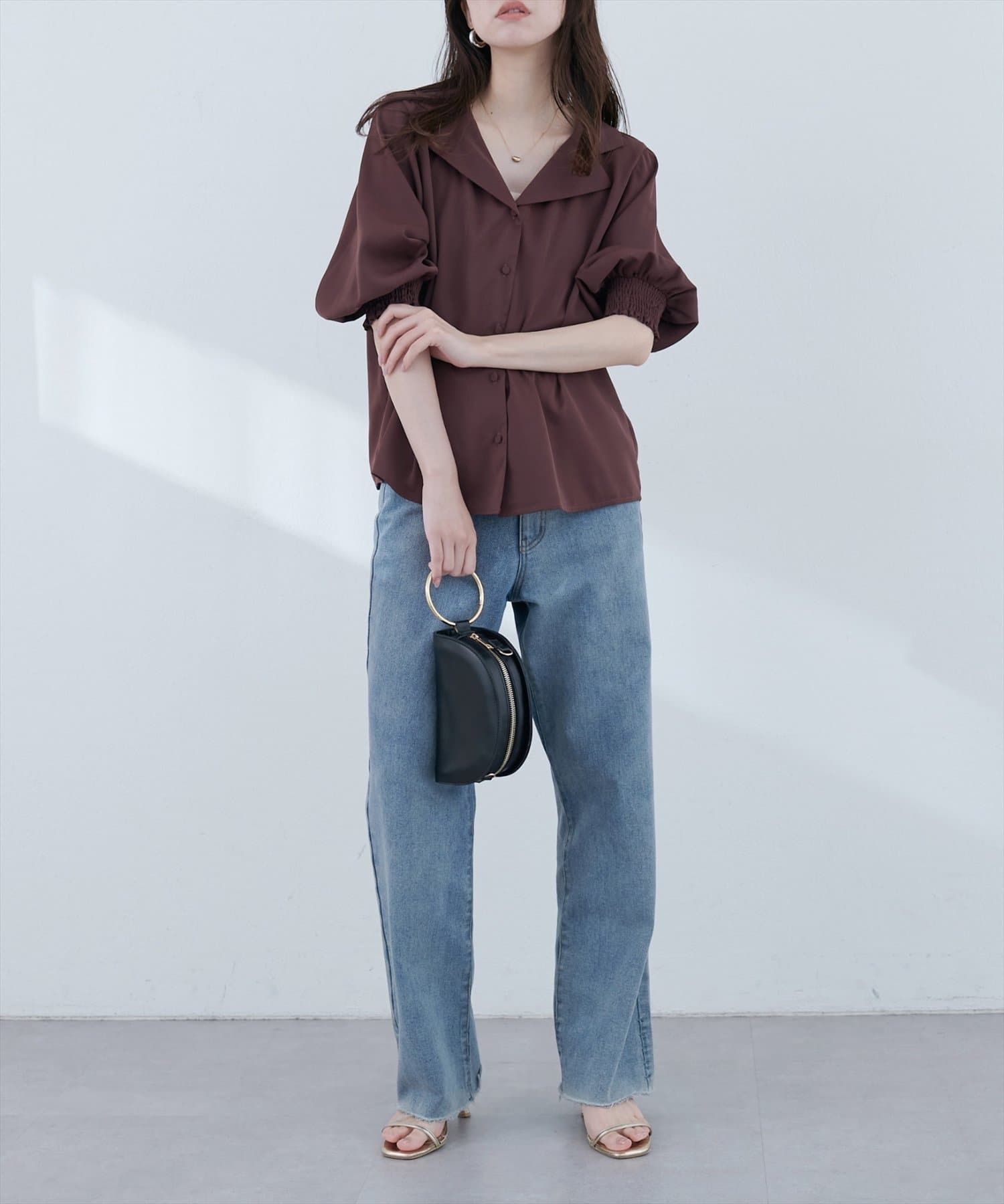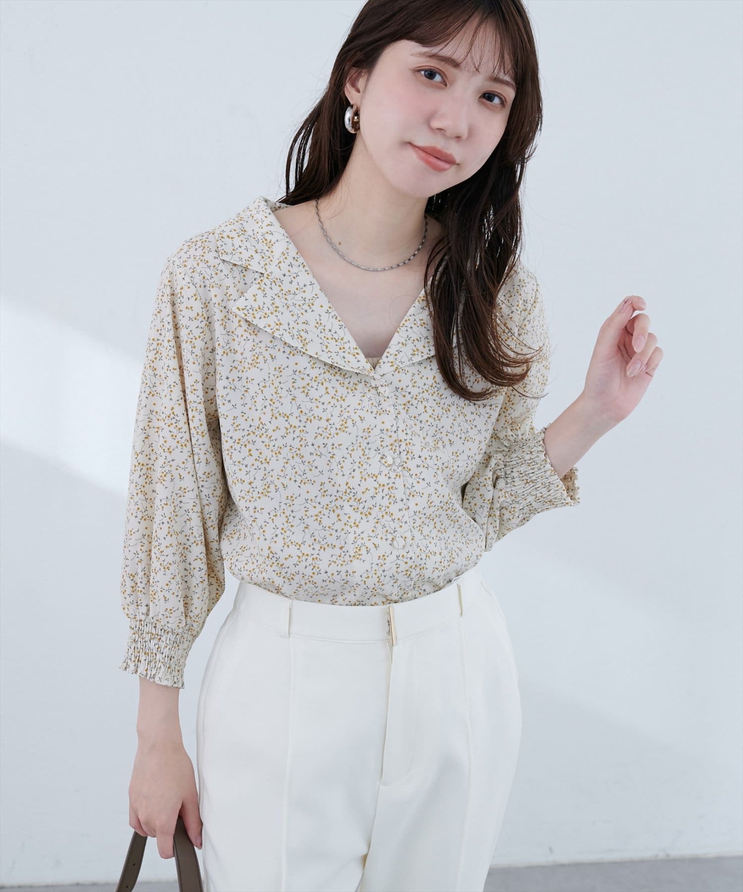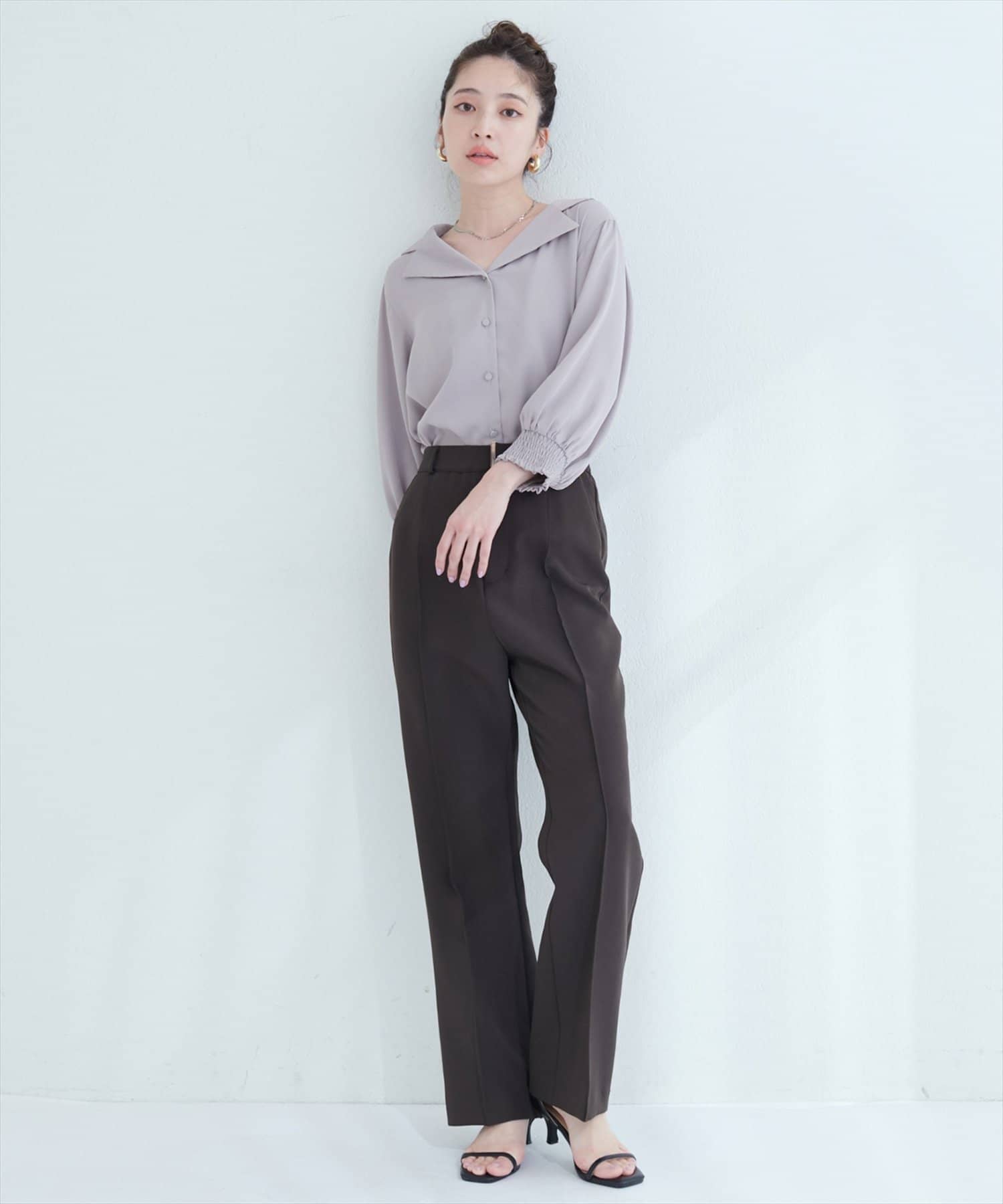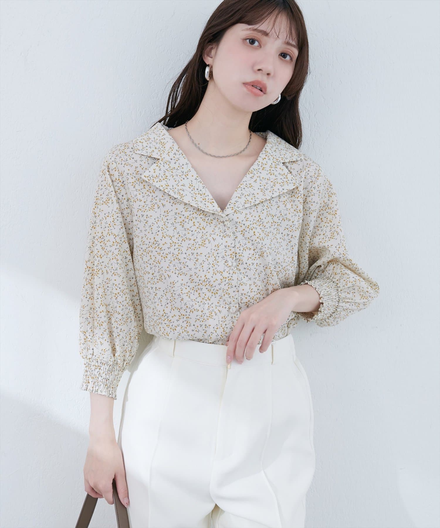 【WEB限定】オープンカラー袖口シャーリングブラウス