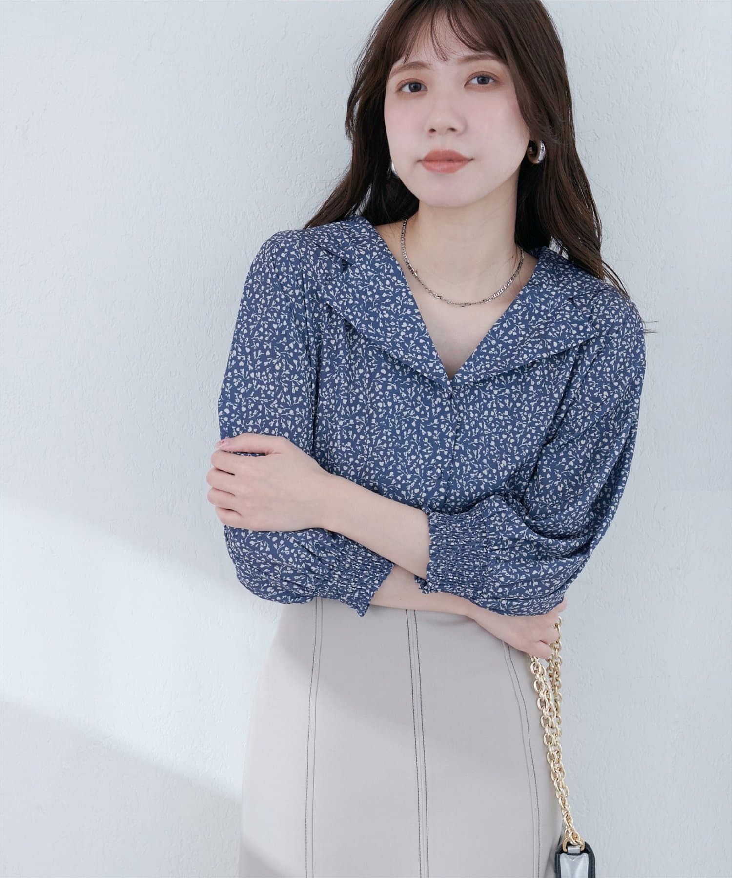 首元をすっきりと見せ、抜け感をプラス。ネックレスとの相性も抜群です。