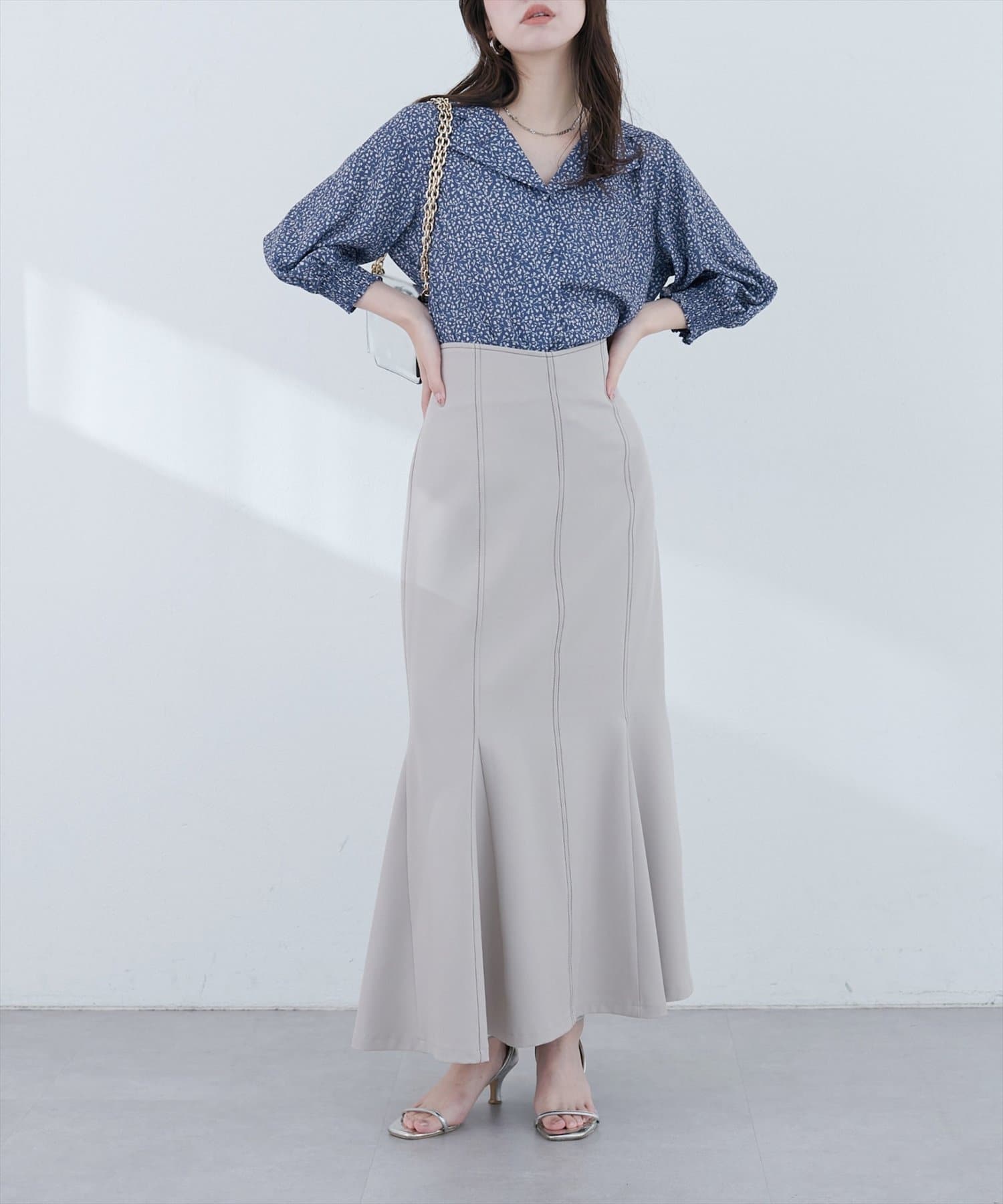 ブラウスにフレアスカートを合わせて、フェミニンな印象に。足元はヒールのあるサンダルで、女性らしさをプラス。