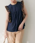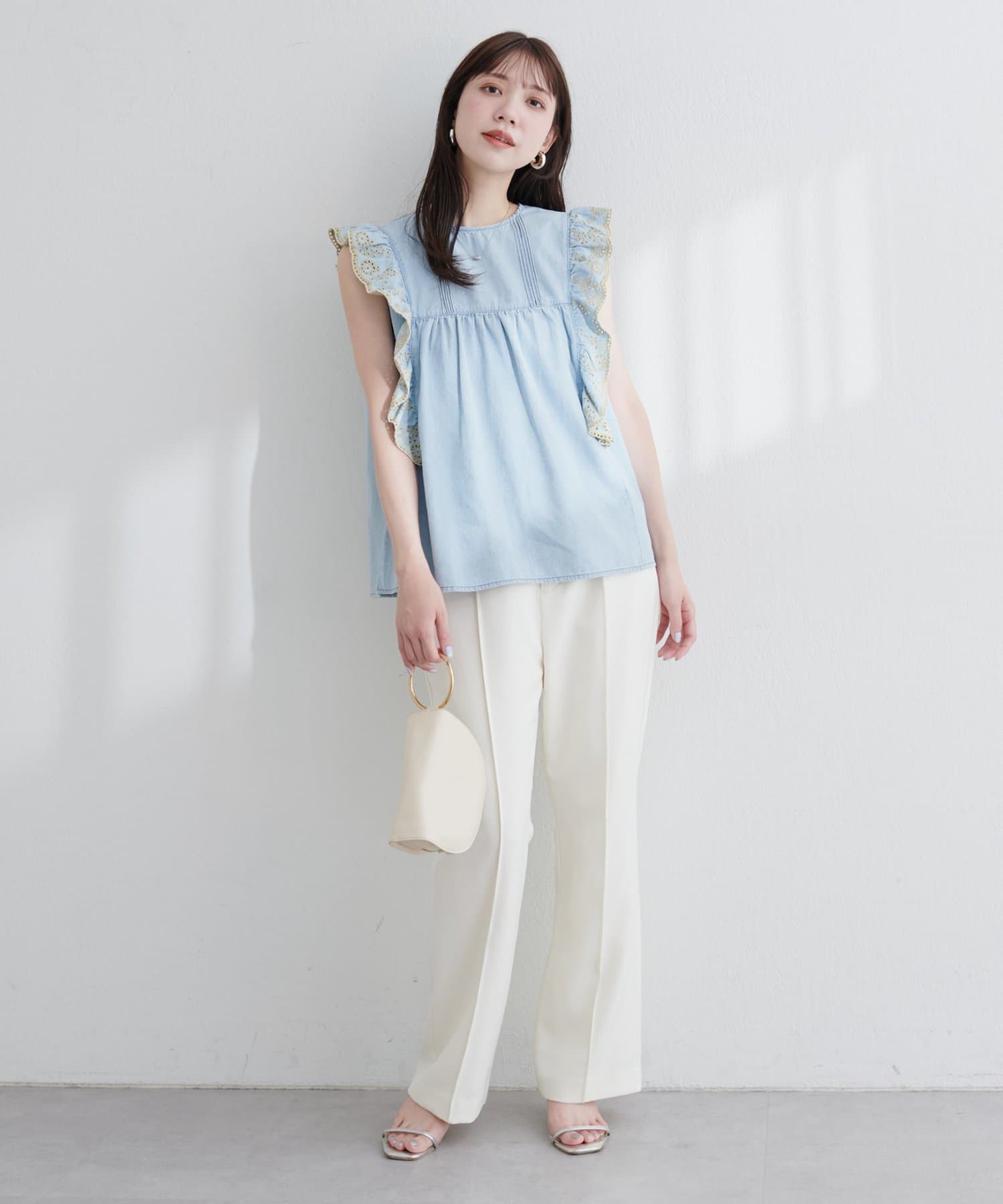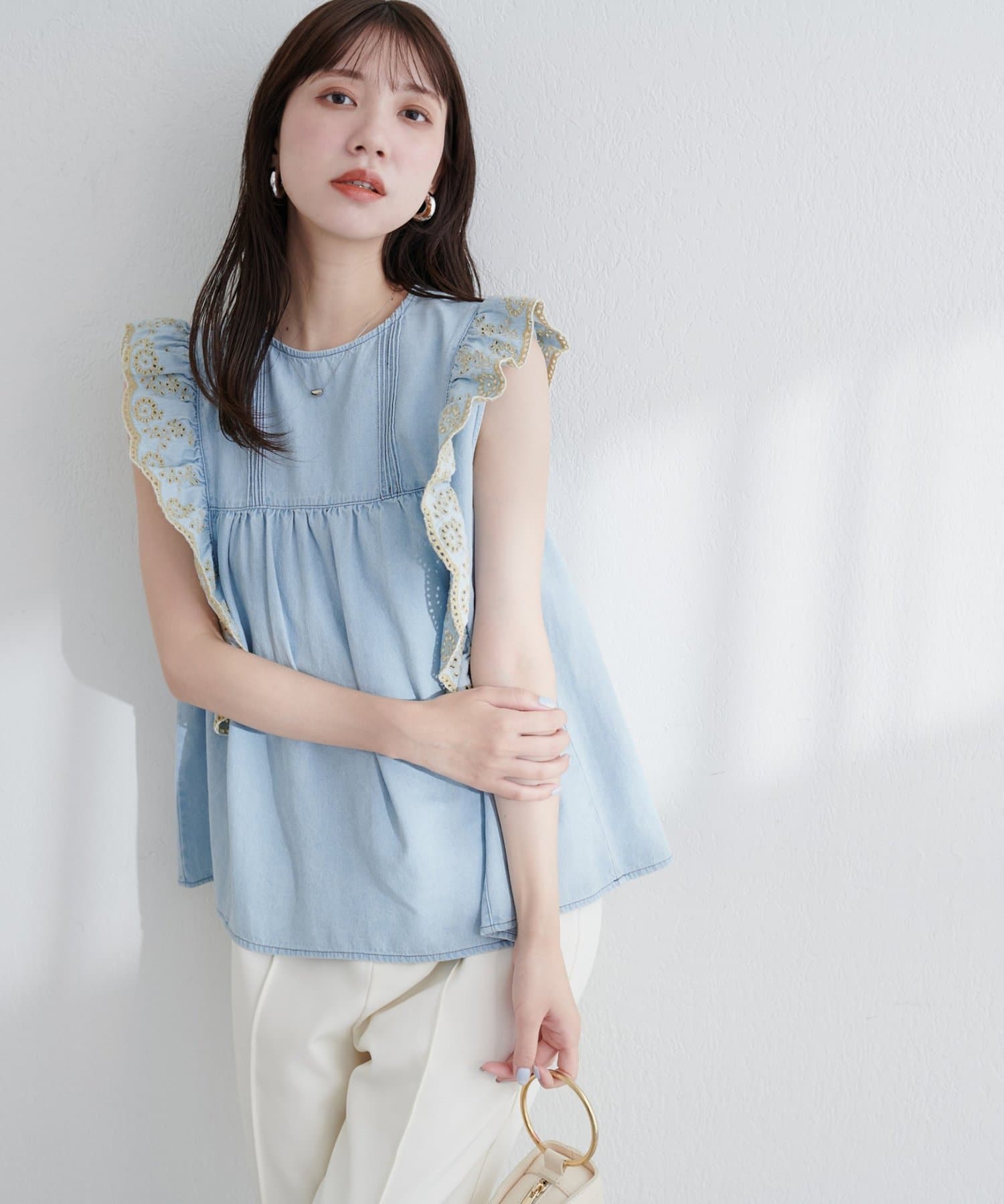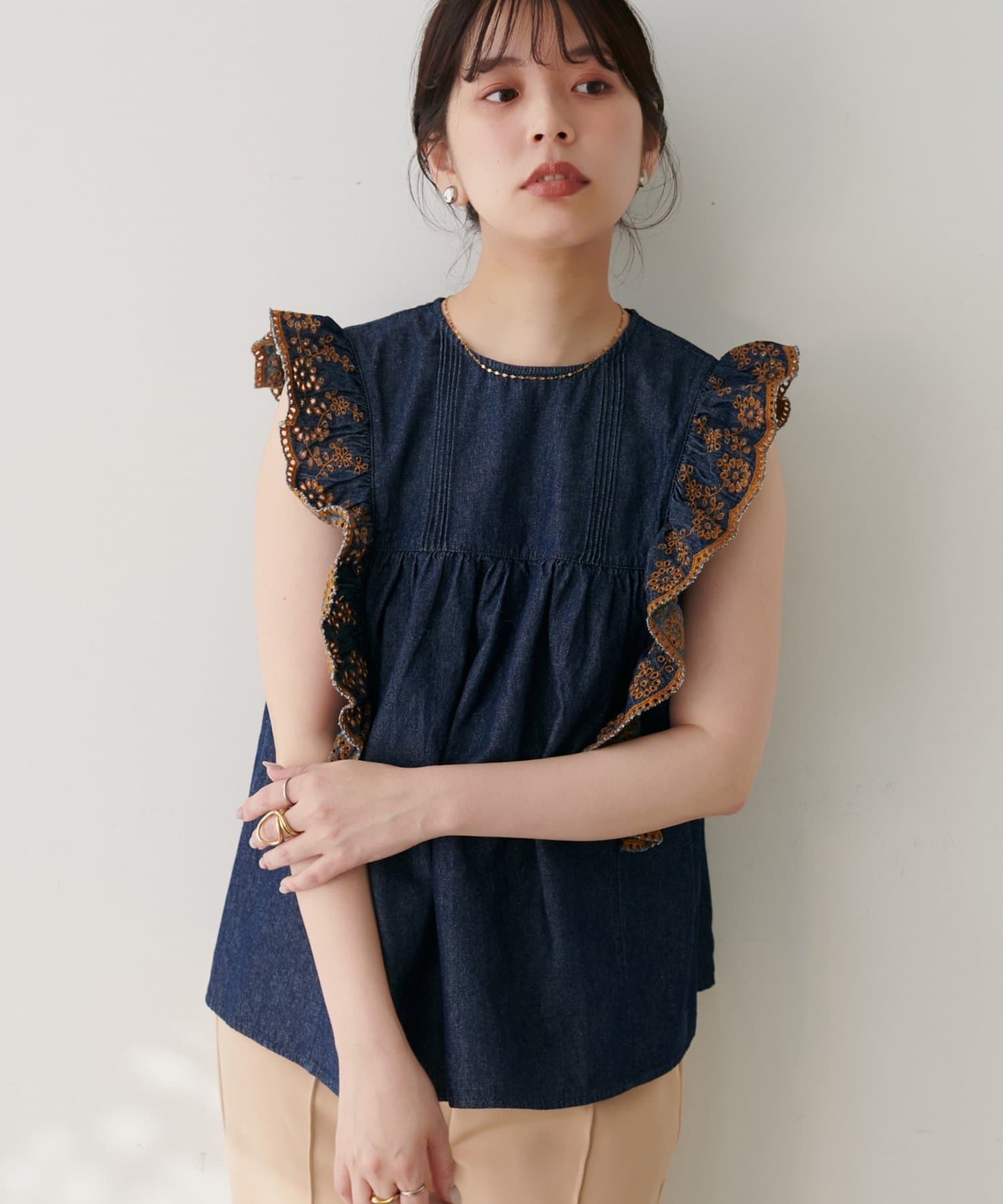 一見カジュアルなデニム素材に、繊細な刺繍とフリルをあしらった、甘辛MIXが魅力のブラウス。