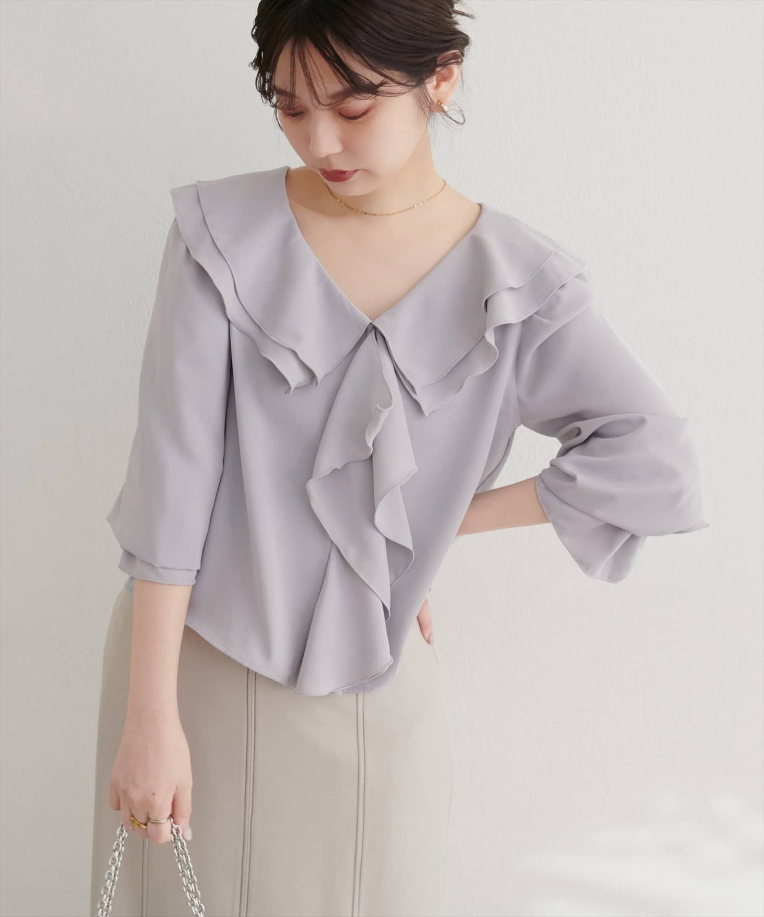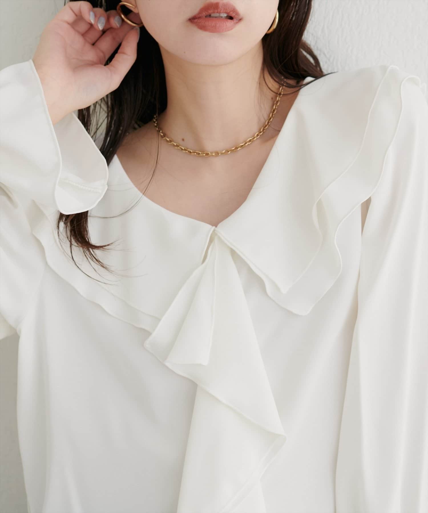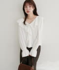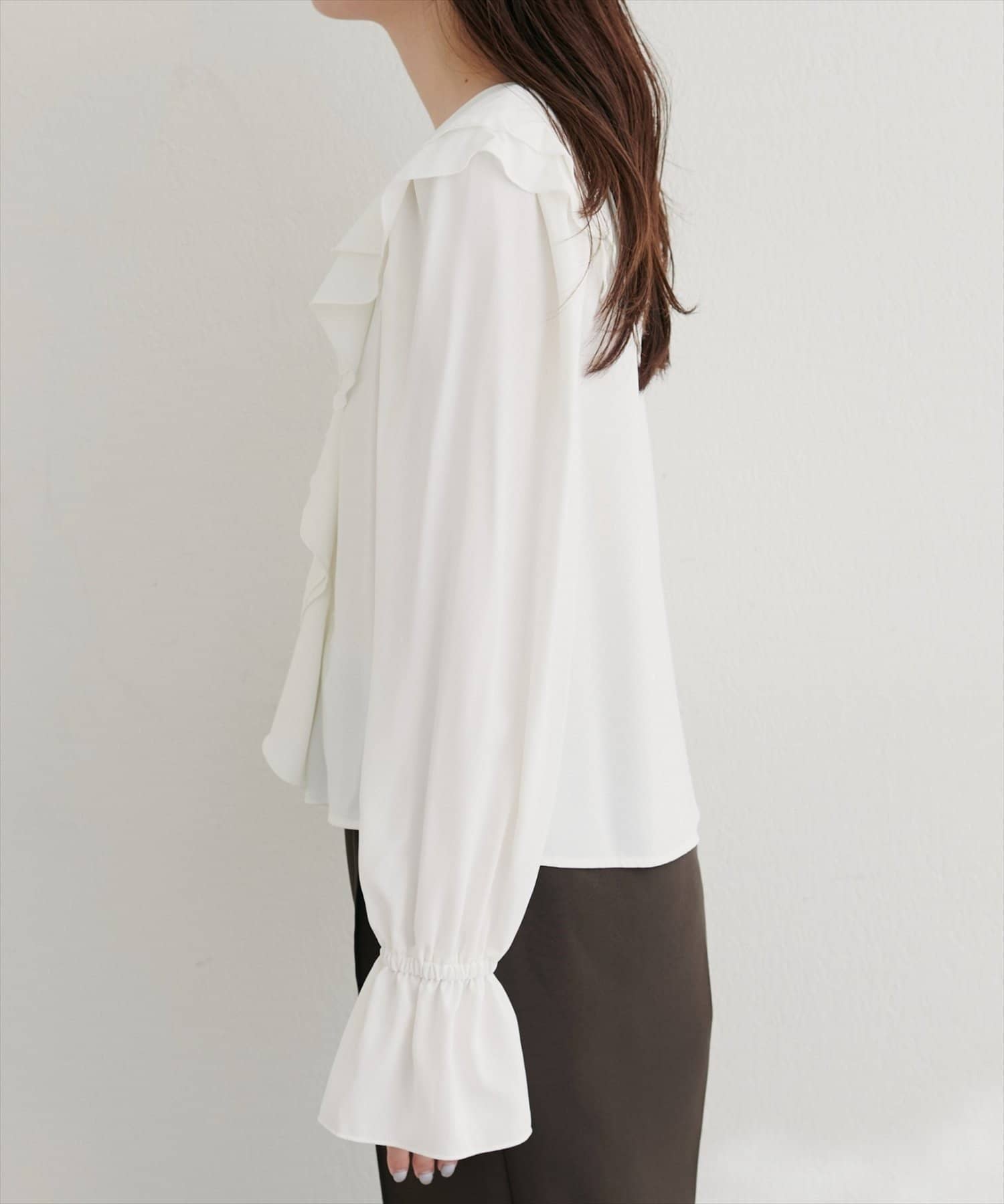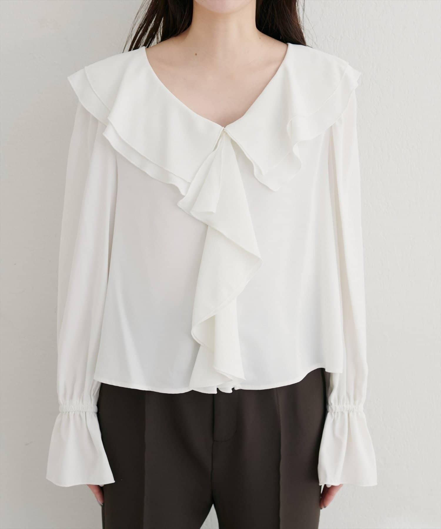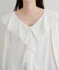 ふんわりと波打つフリルが、顔周りを華やかに彩るブラウス。