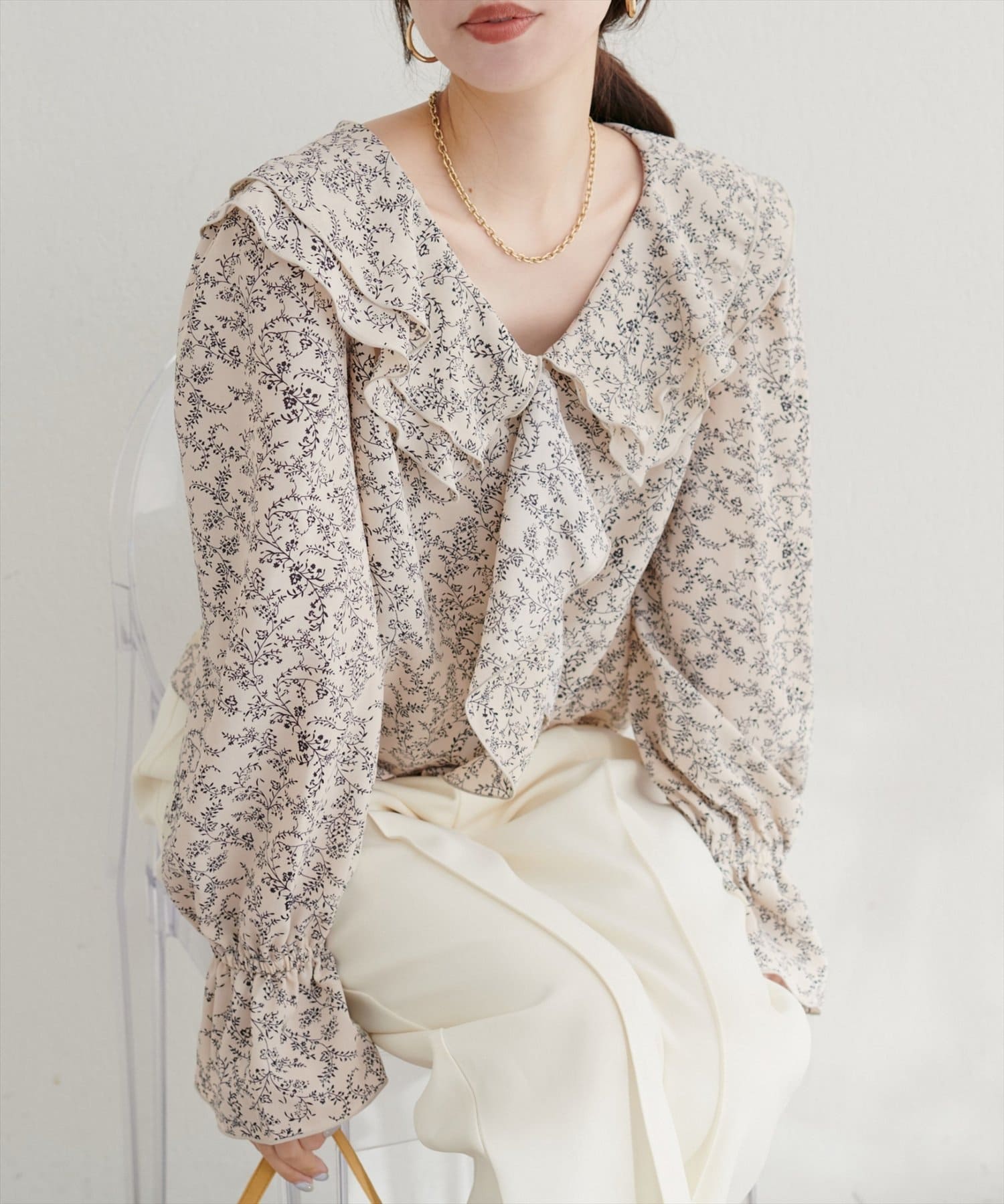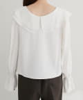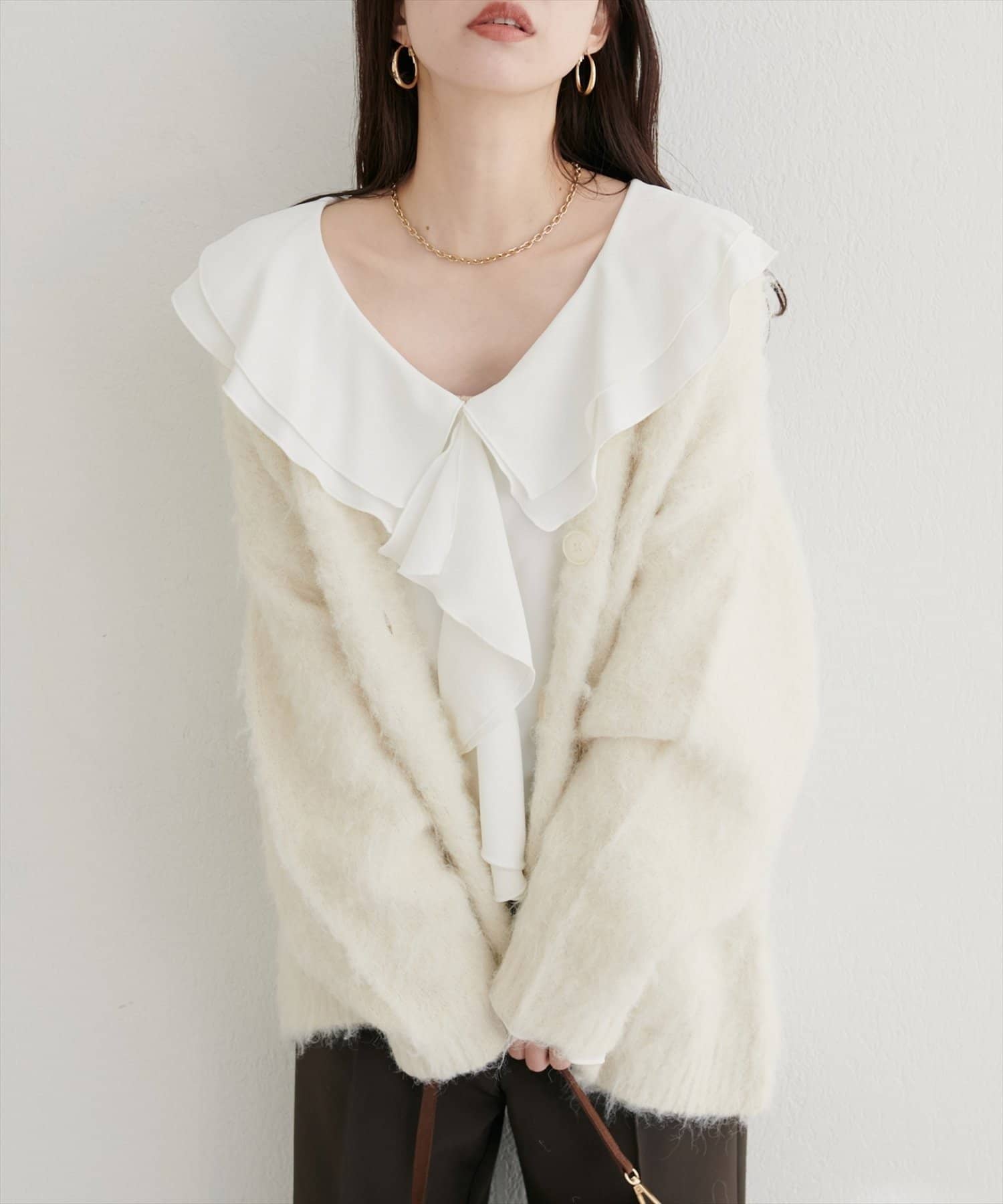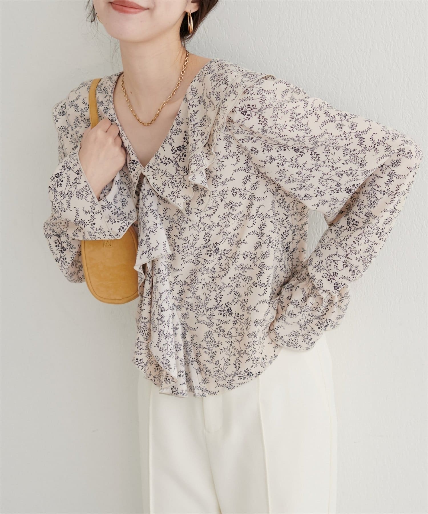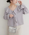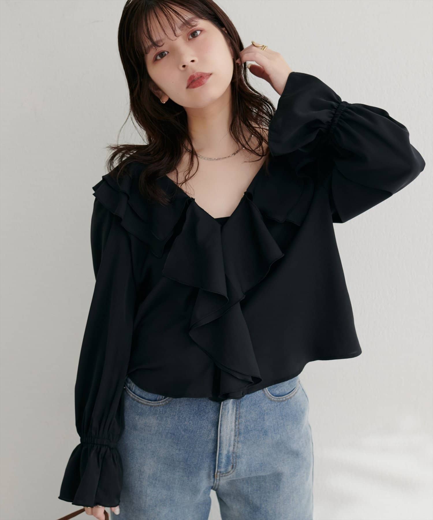 ふんわりと波打つフリルが、顔周りを華やかに彩るブラウス。