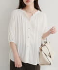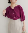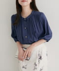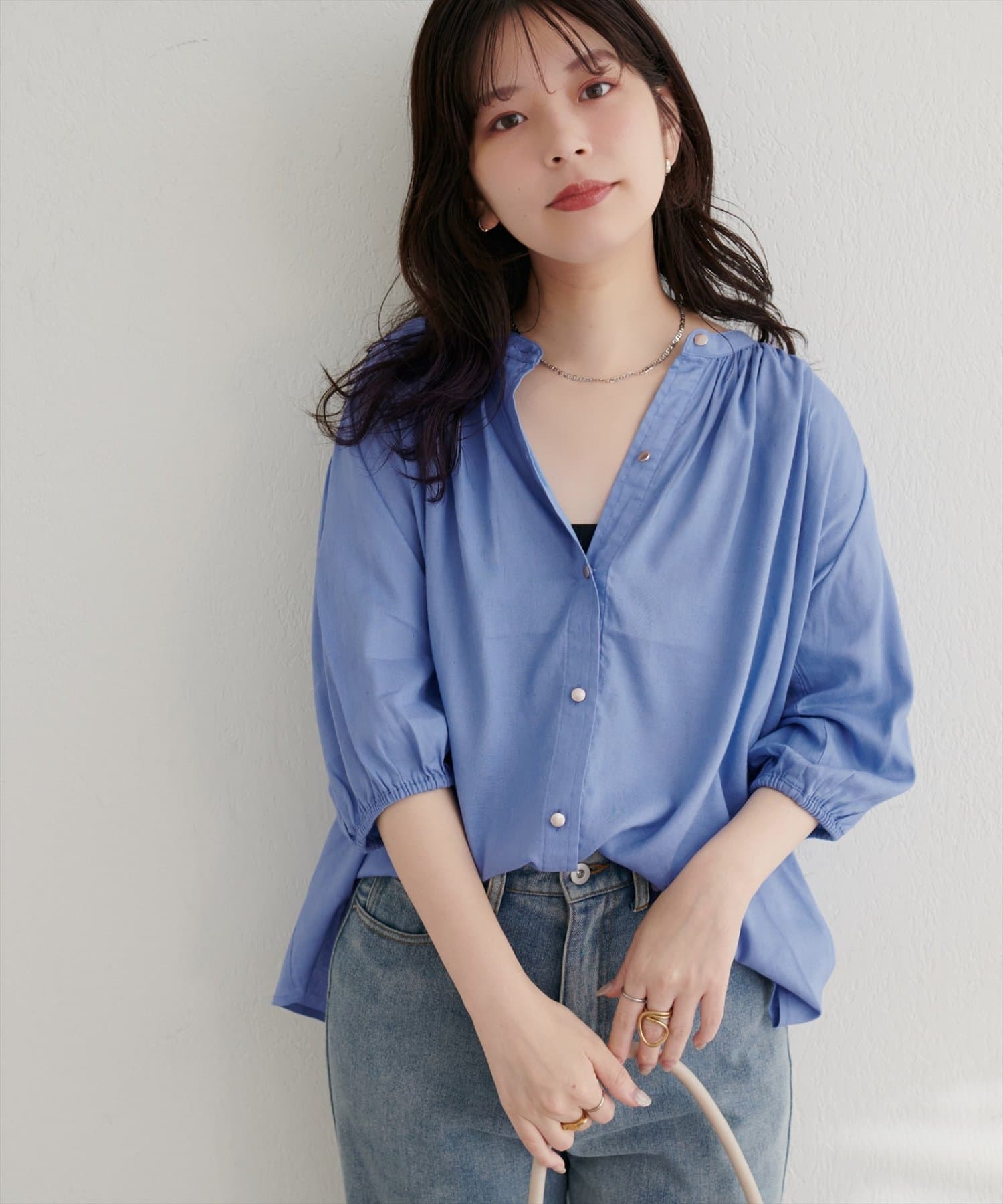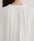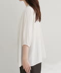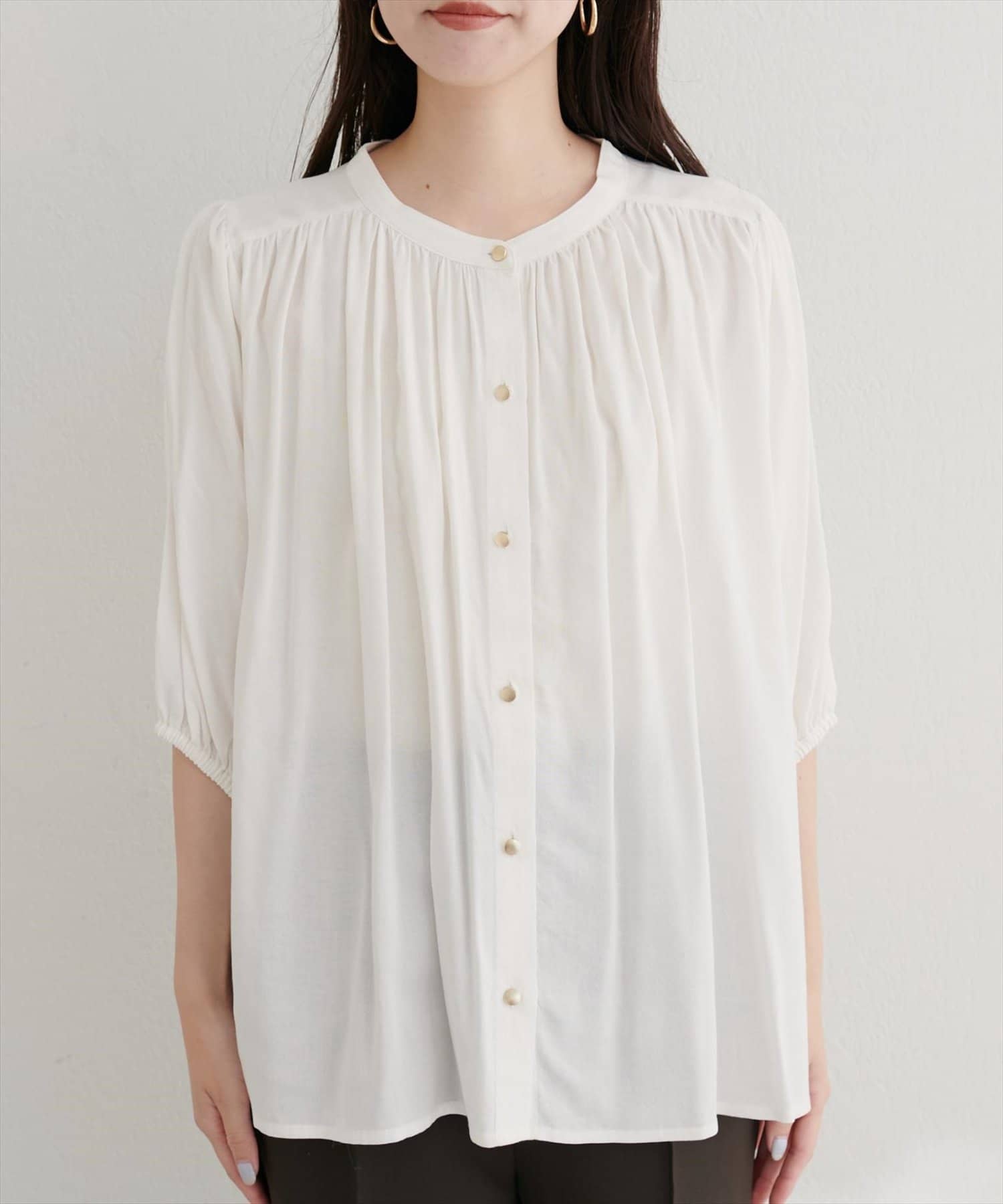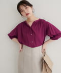 ふんわりとしたシルエットと、麻混素材ならではのナチュラルな風合いが魅力のギャザーブラウス。
