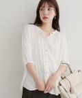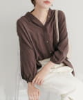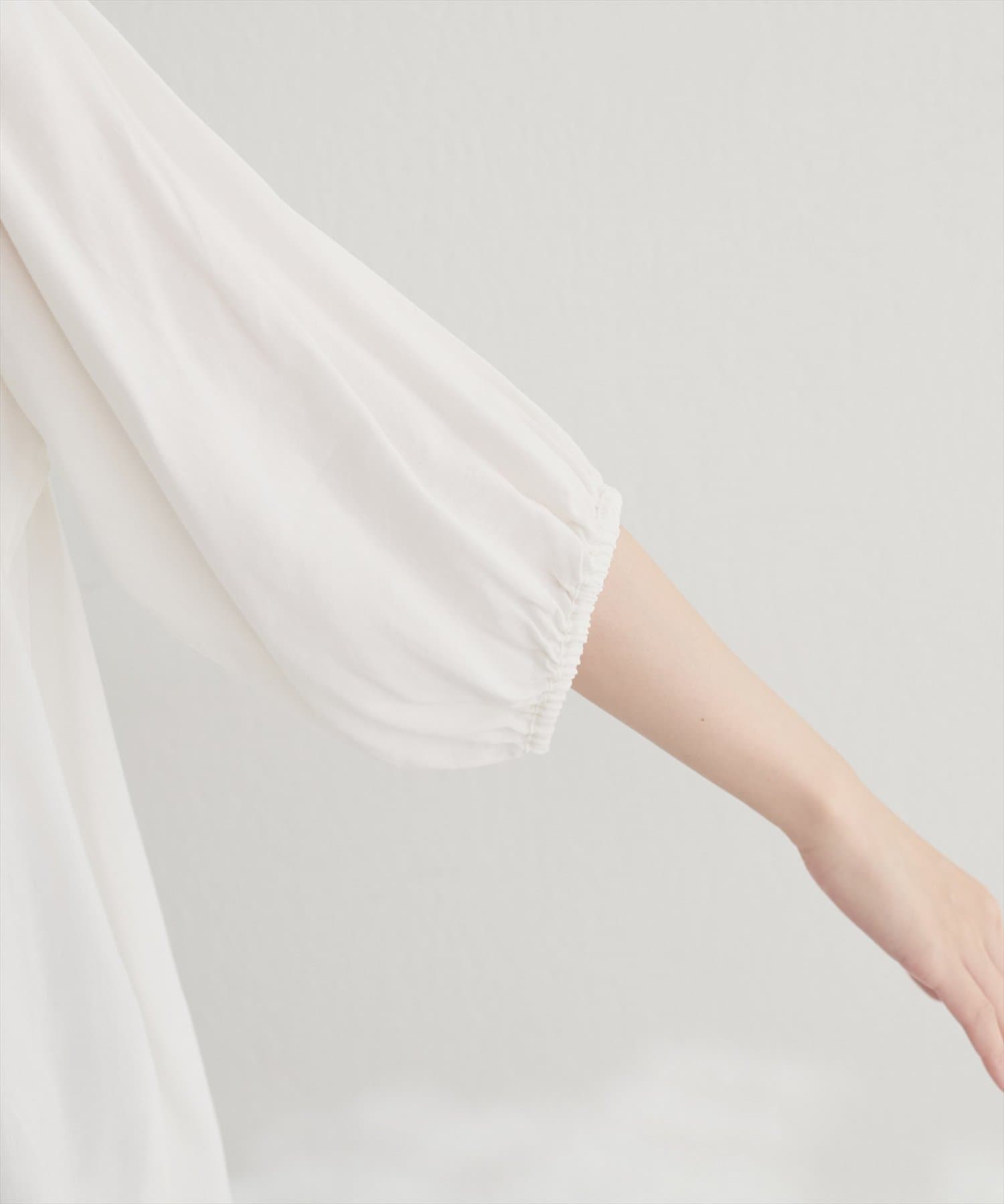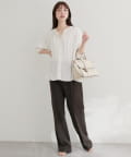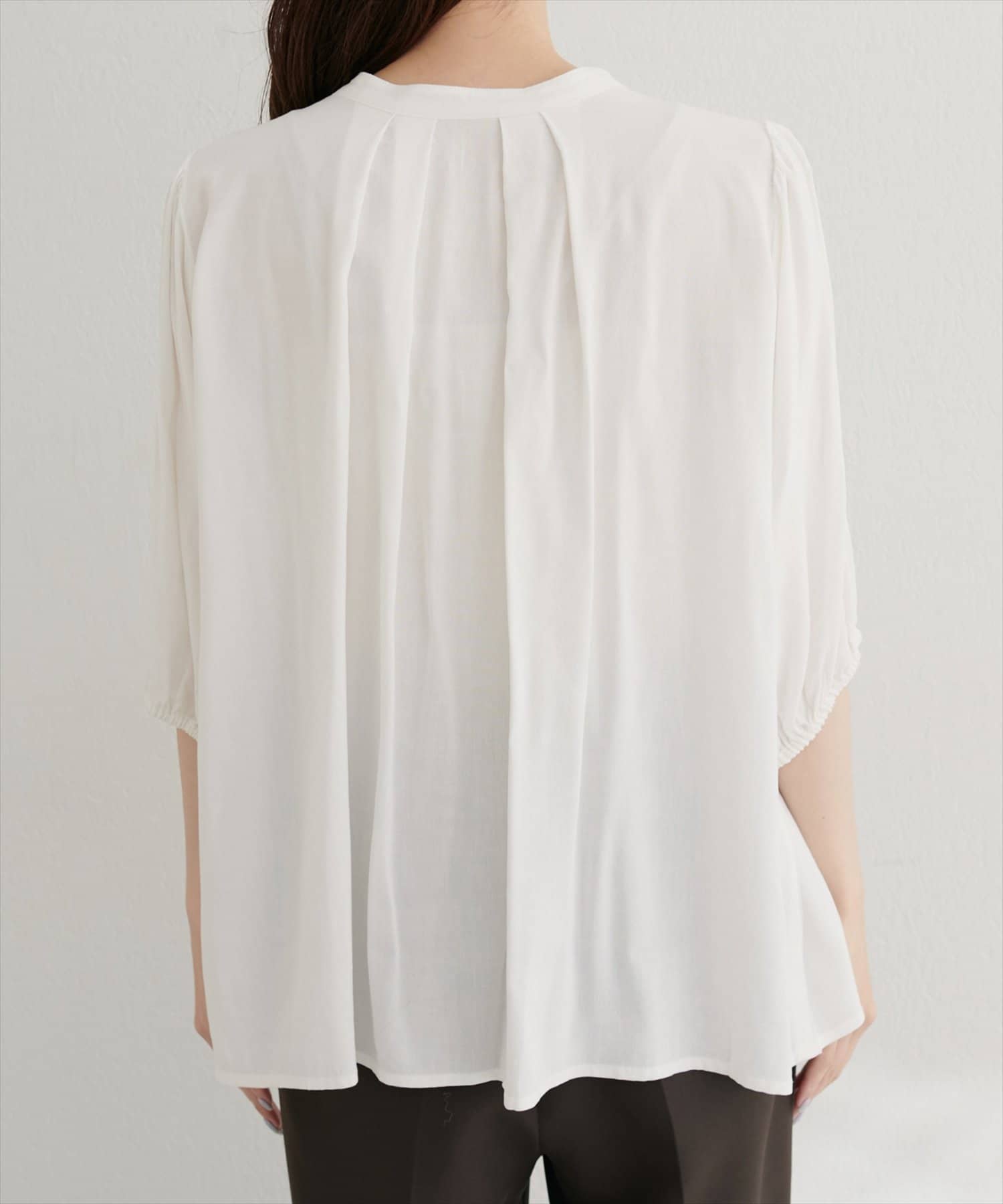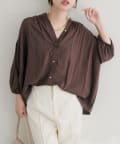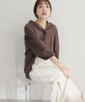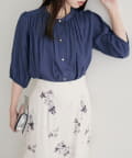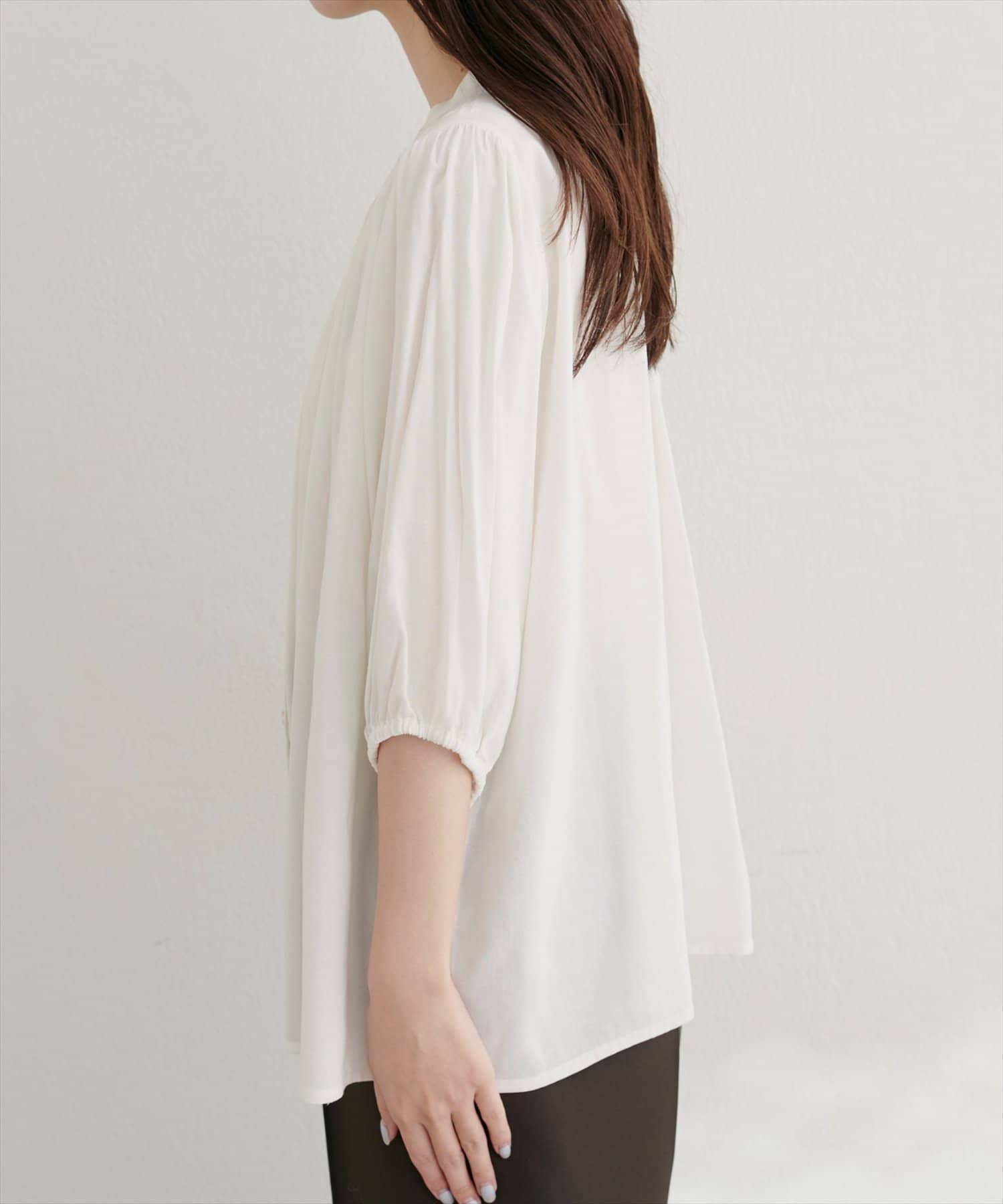 ふんわりとしたシルエットと、麻混素材ならではのナチュラルな風合いが魅力のギャザーブラウス。
