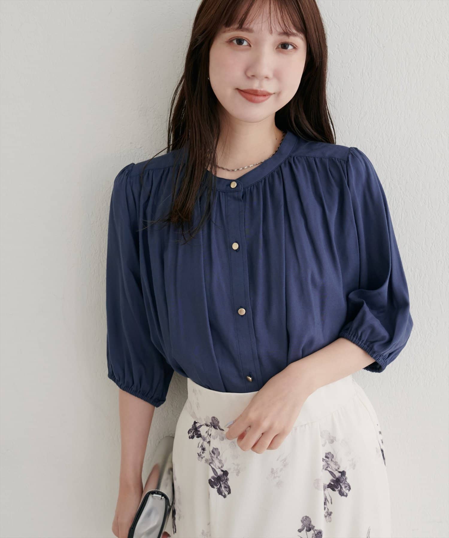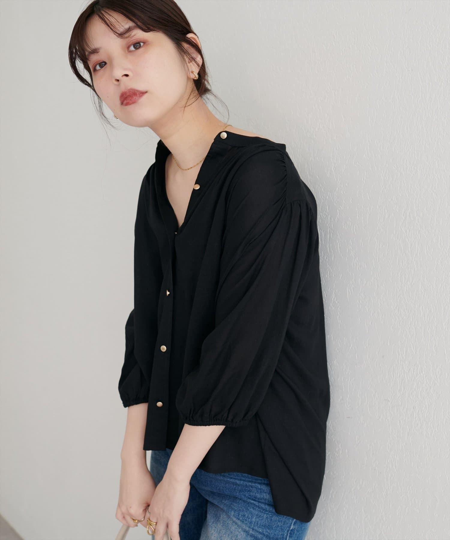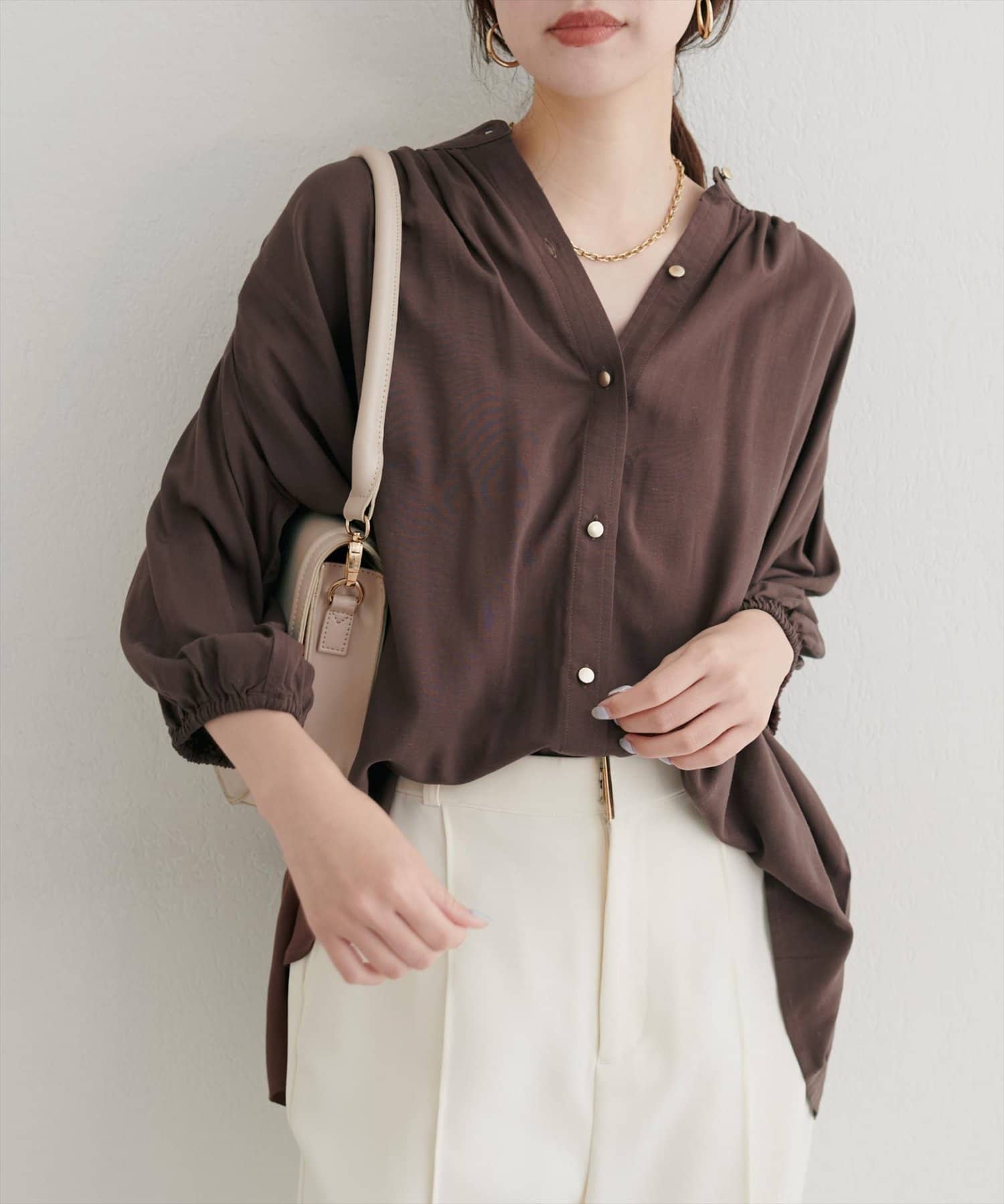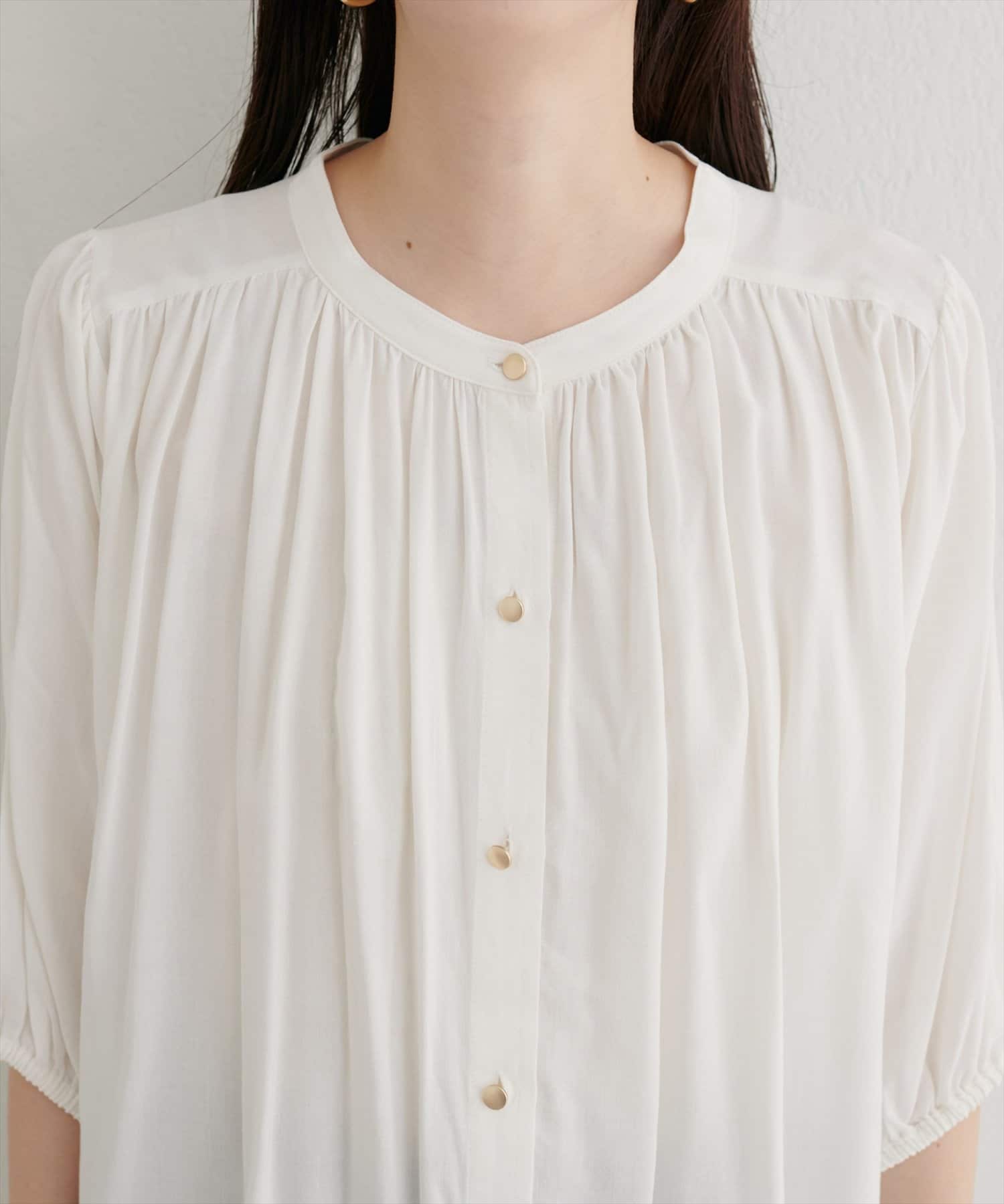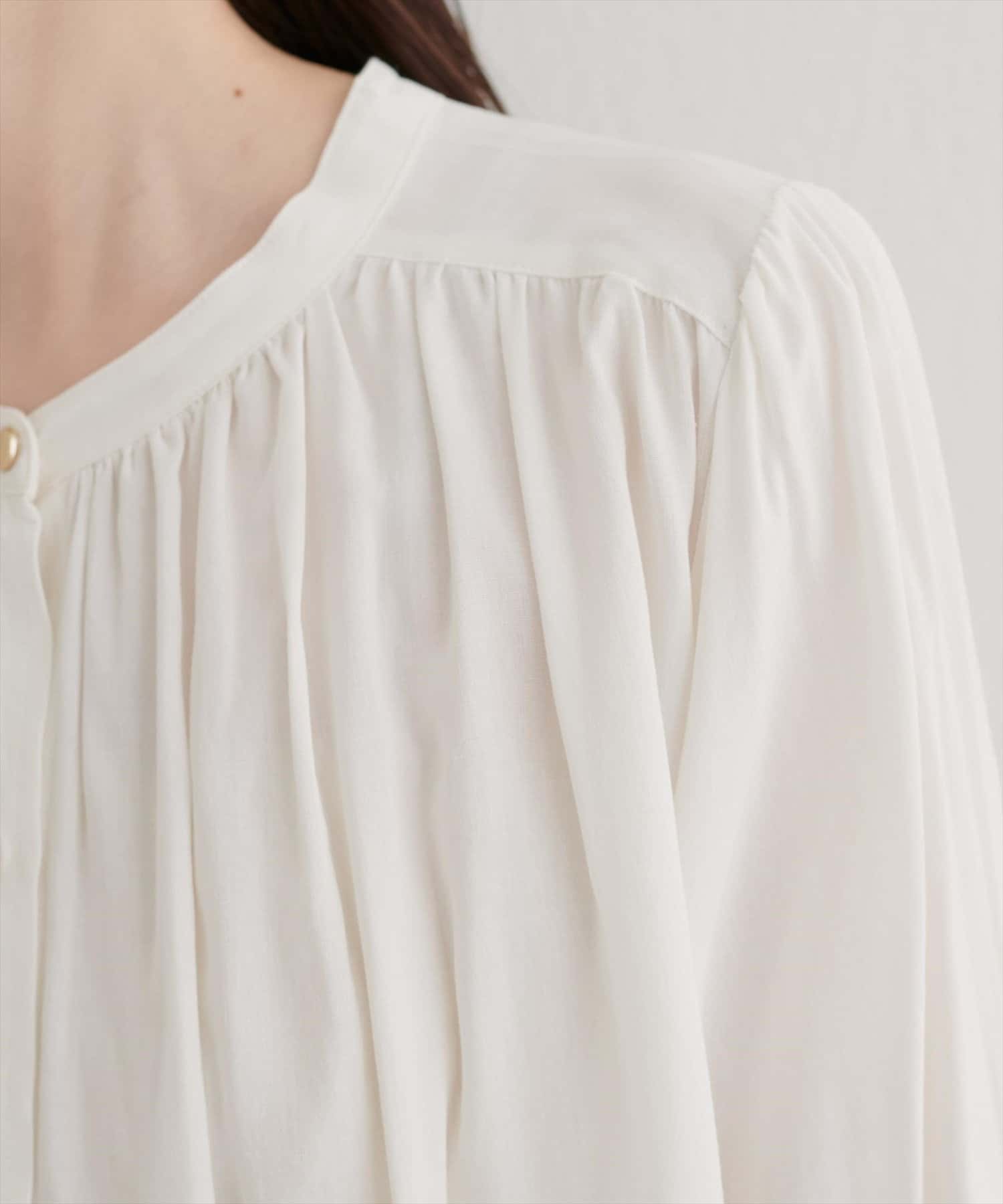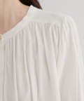 首元のギャザーと薄金ボタンが、さりげない華やかさをプラス。