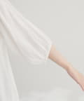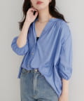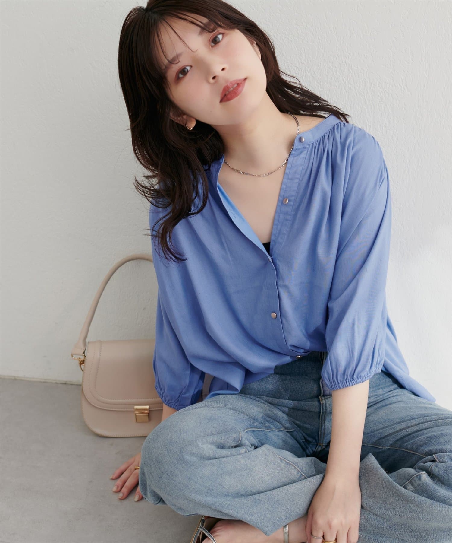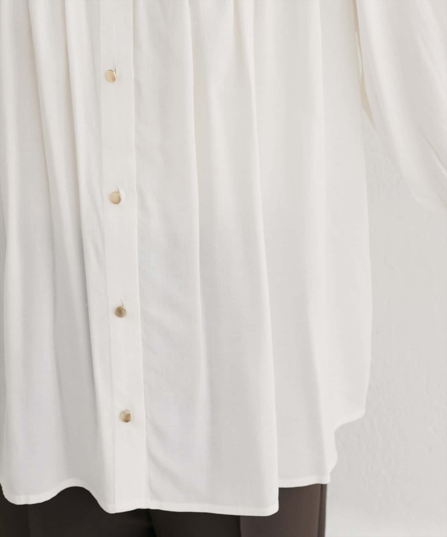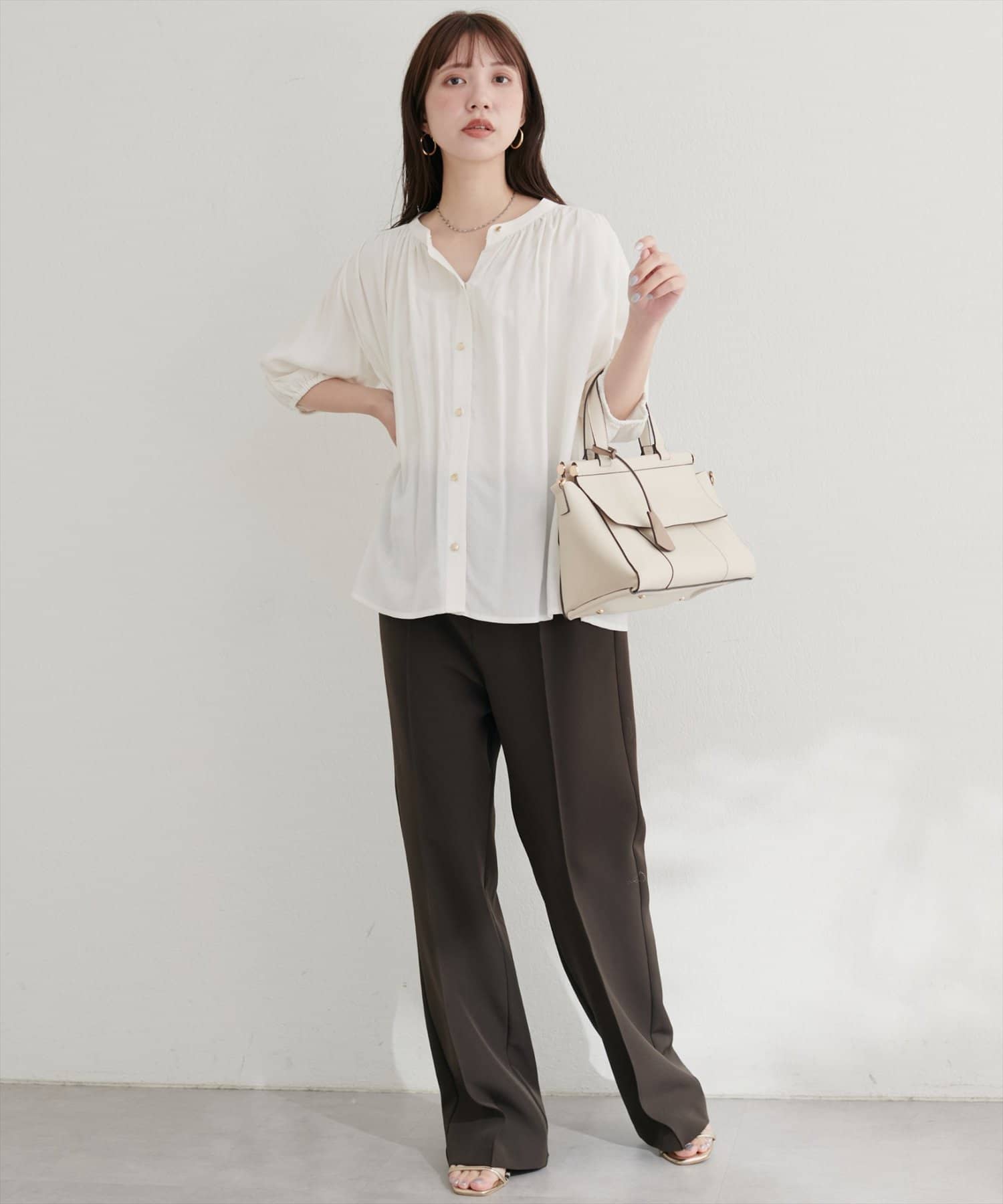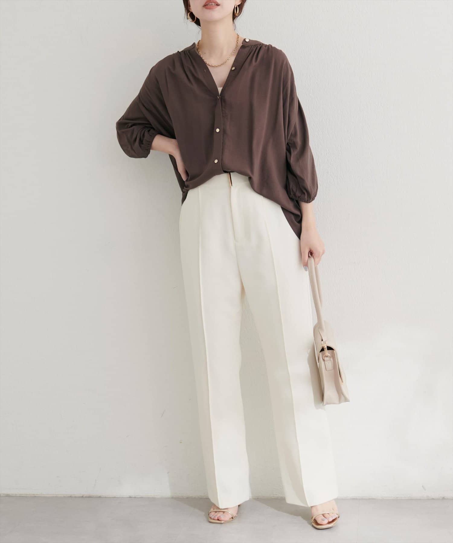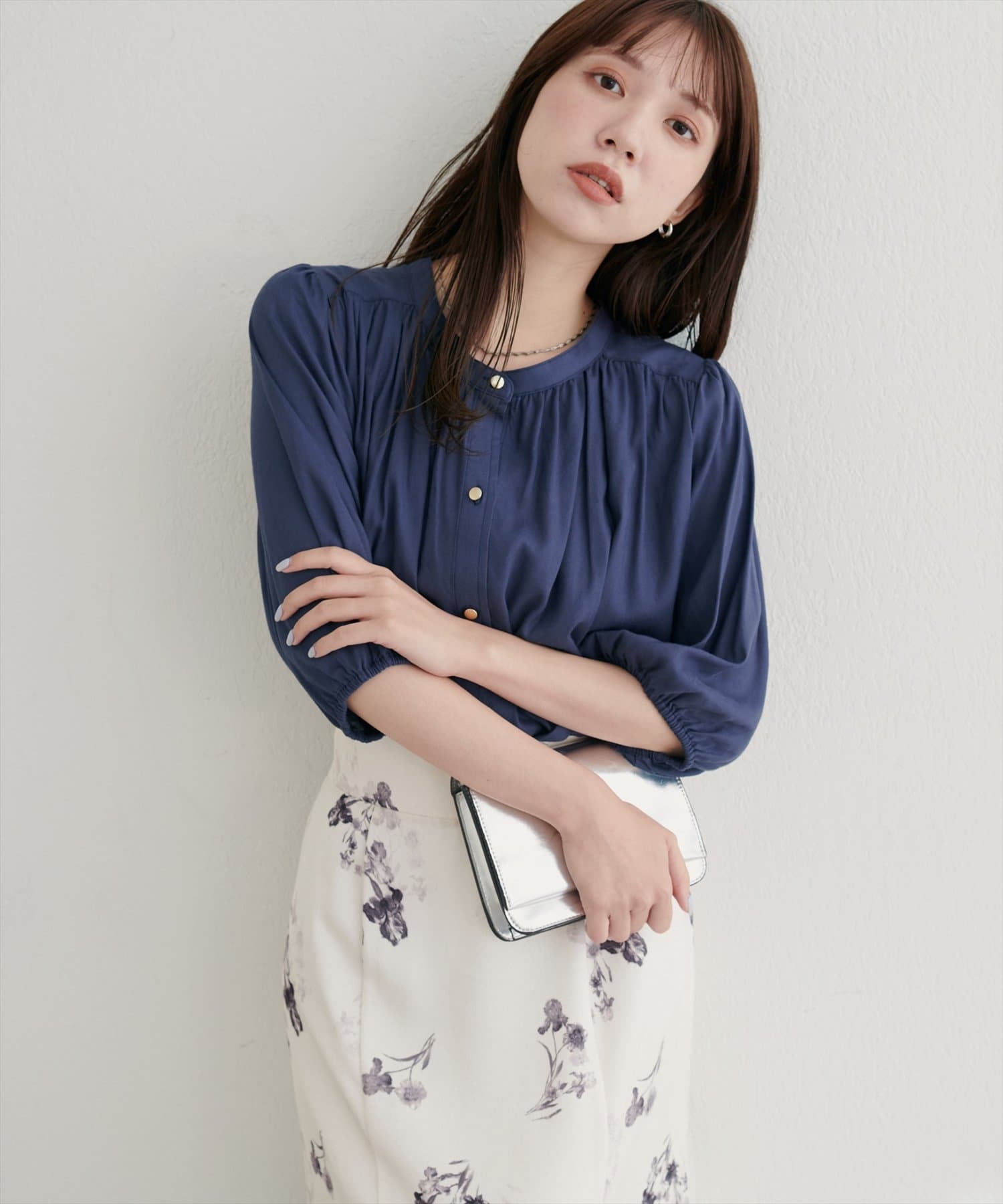首元のギャザーと薄金ボタンが、さりげない華やかさをプラス。