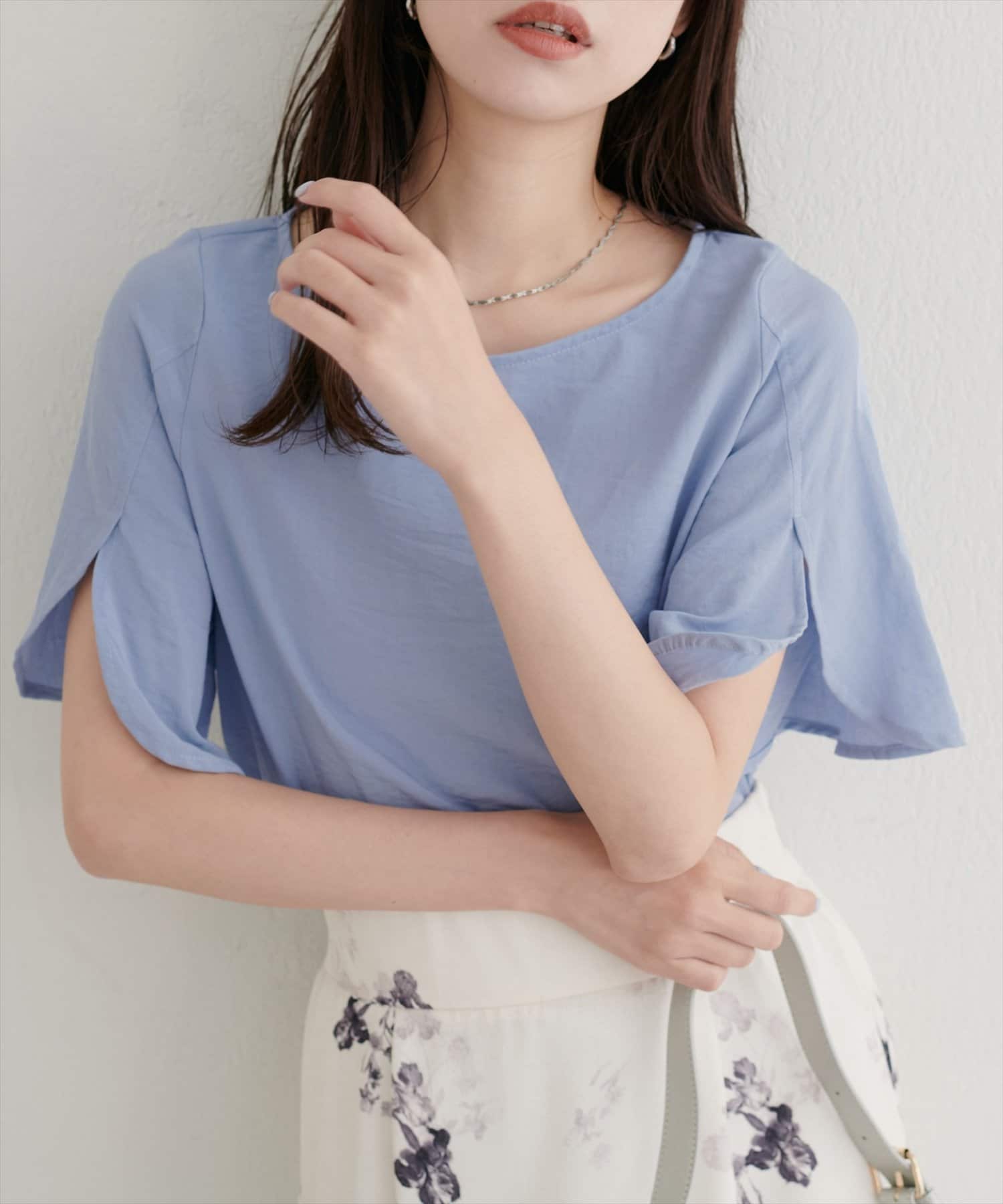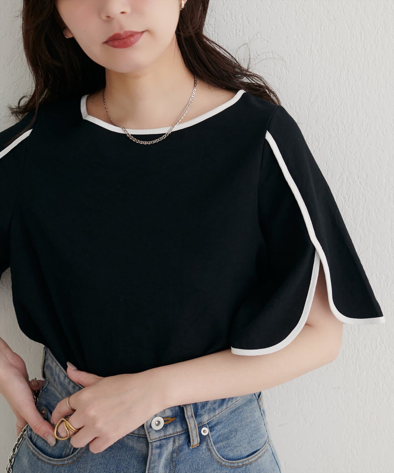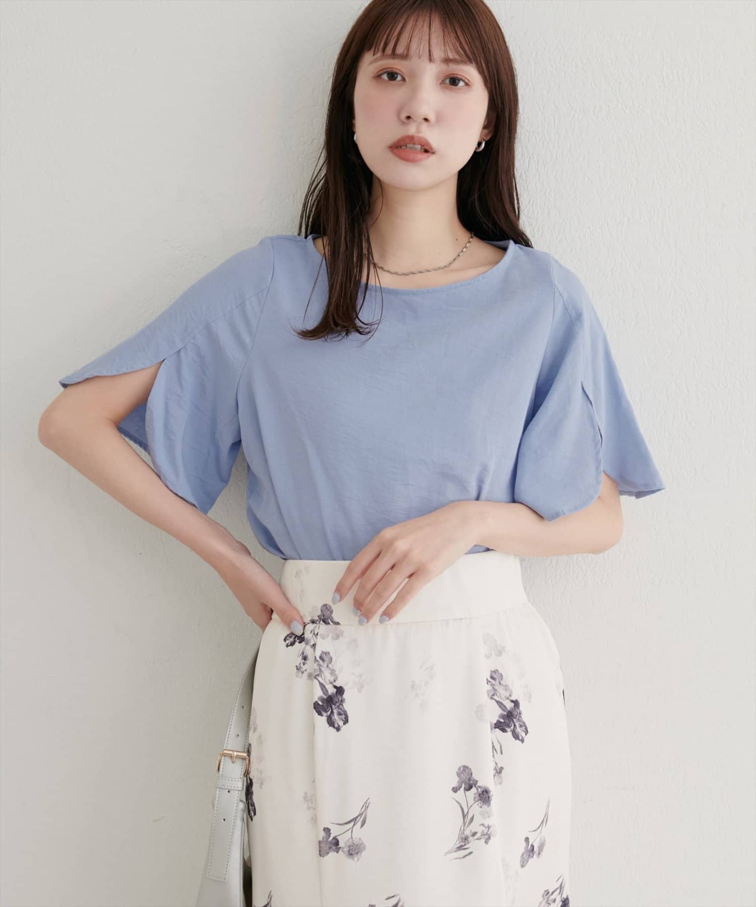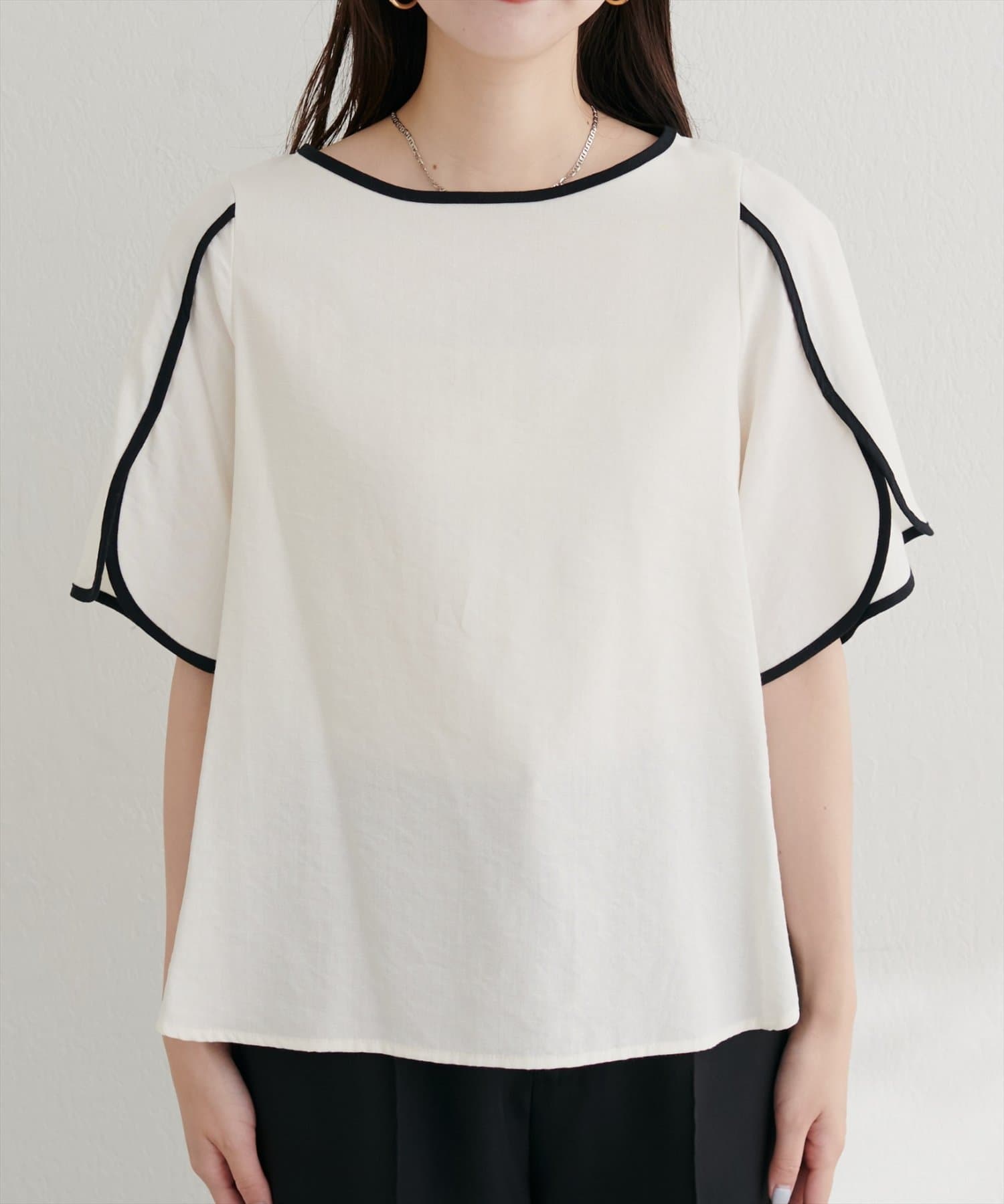 袖にハチワレのようなスリットを施した遊び心のある半袖ブラウス。