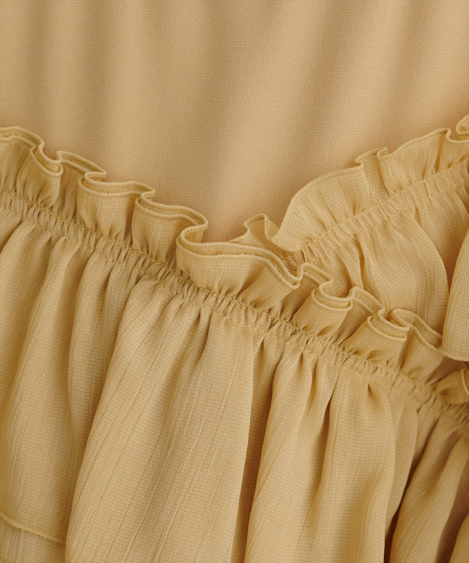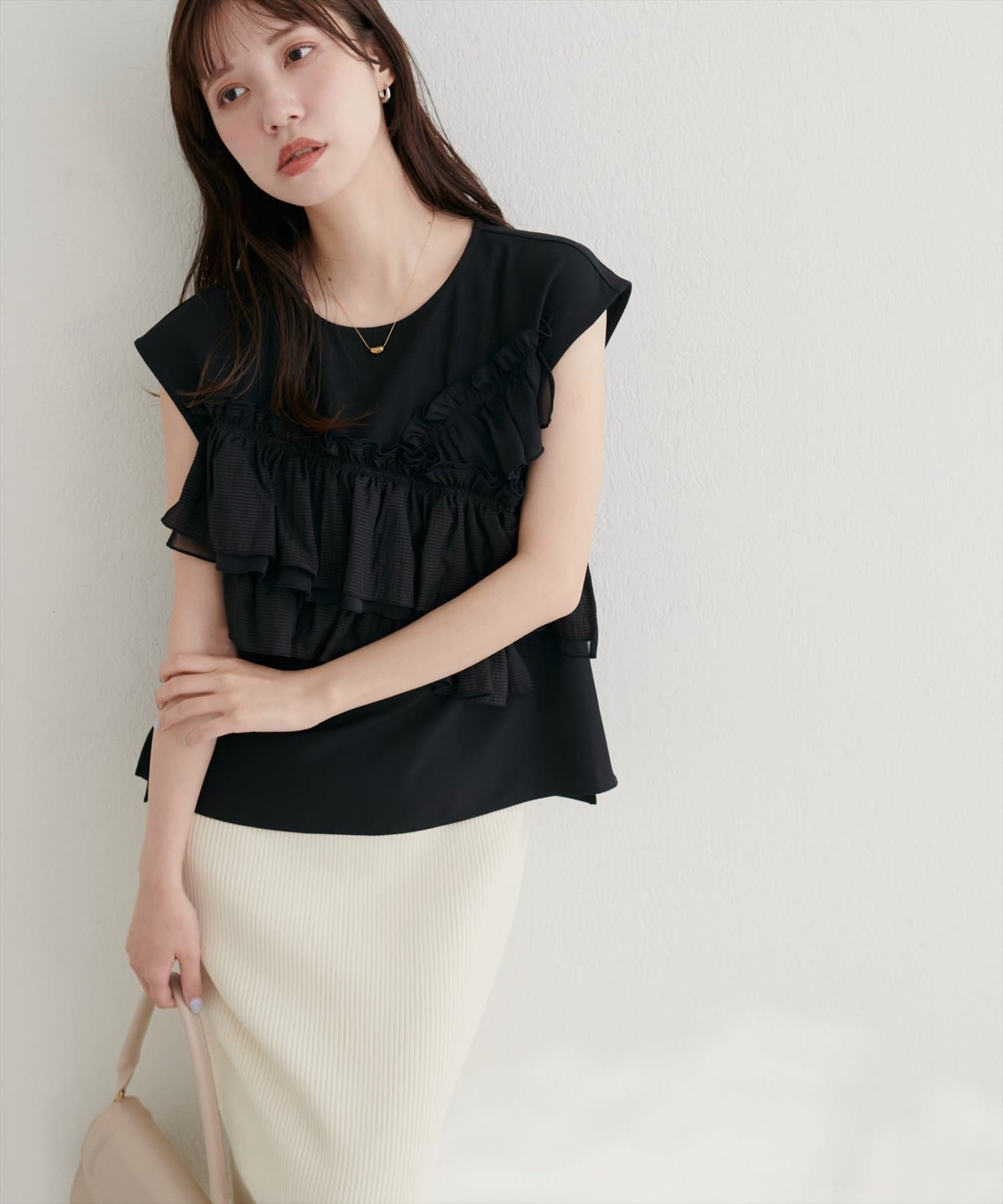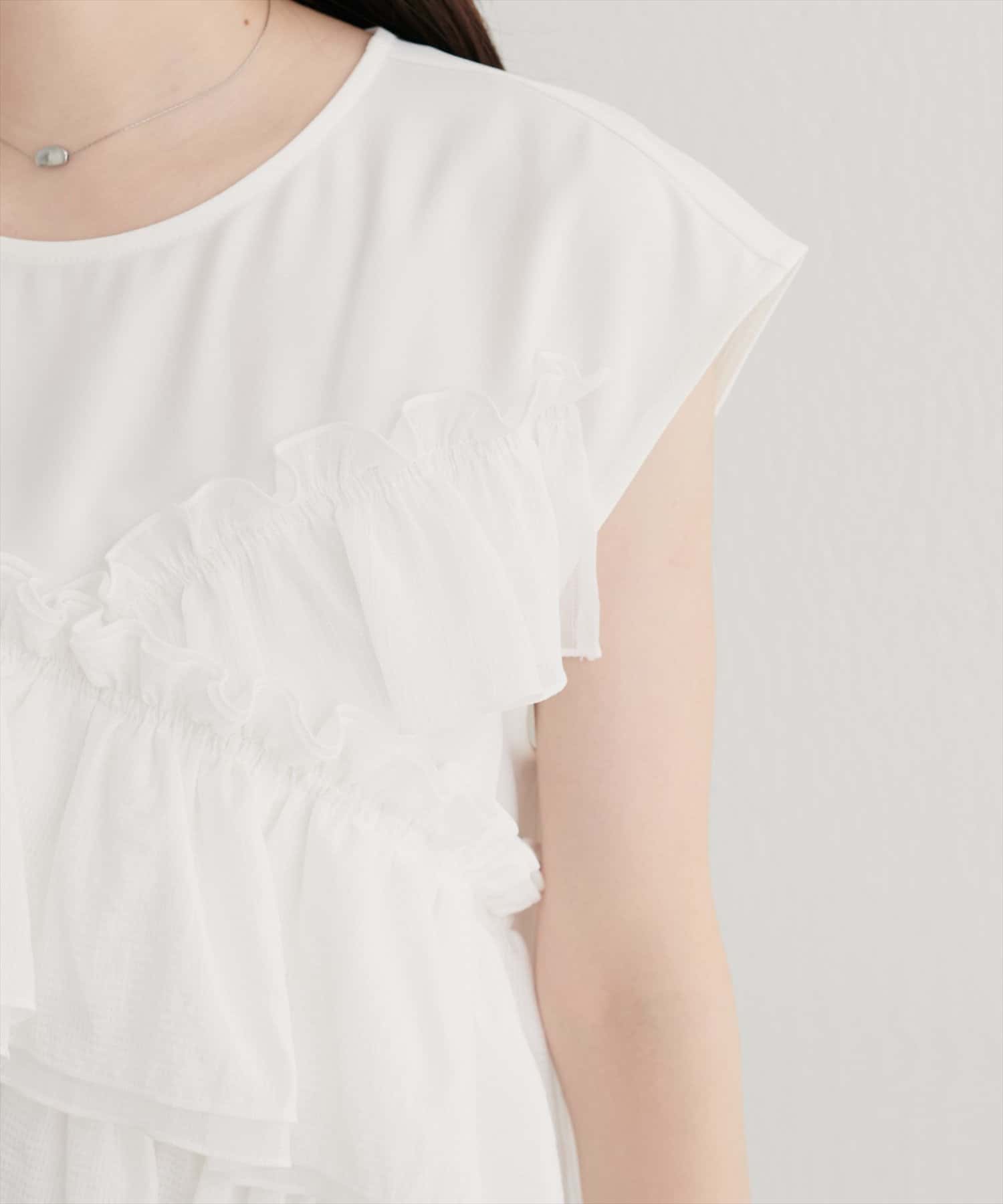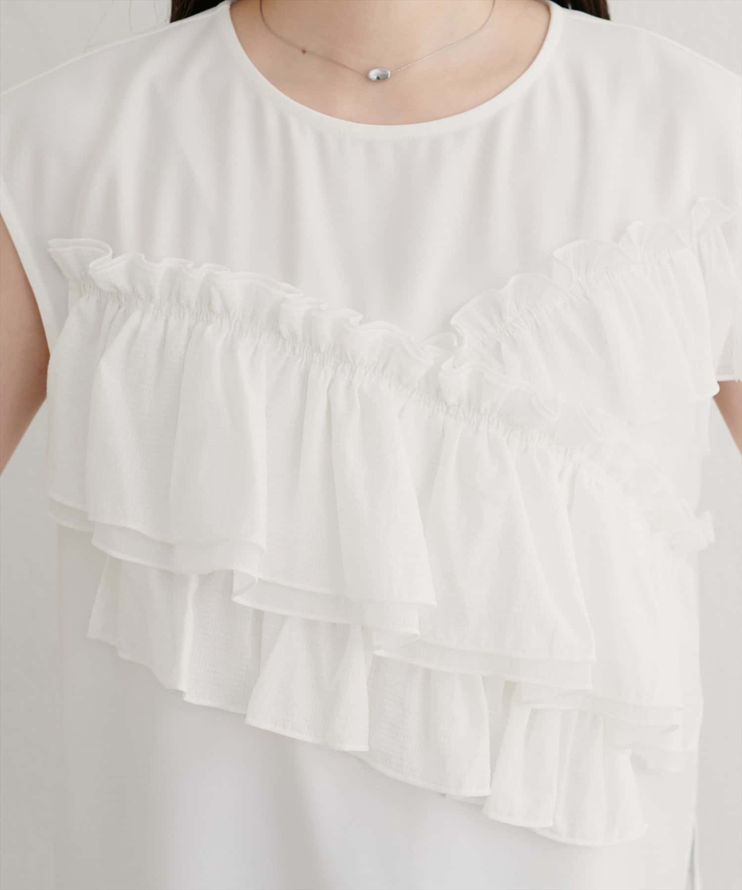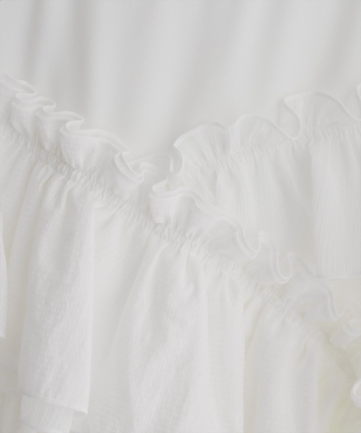 アシンメトリーに大胆にあしらわれたフリルが、動くたびにふわりと揺れ
