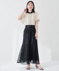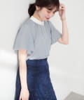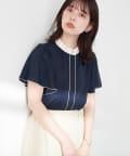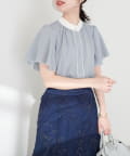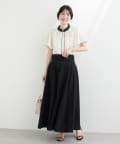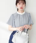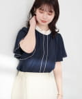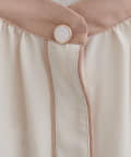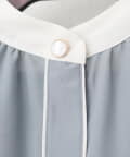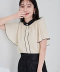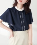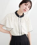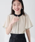 華やかで女性らしい雰囲気と配色のトリミングをアクセントにメリハリをつけたフェミニンブラウス。