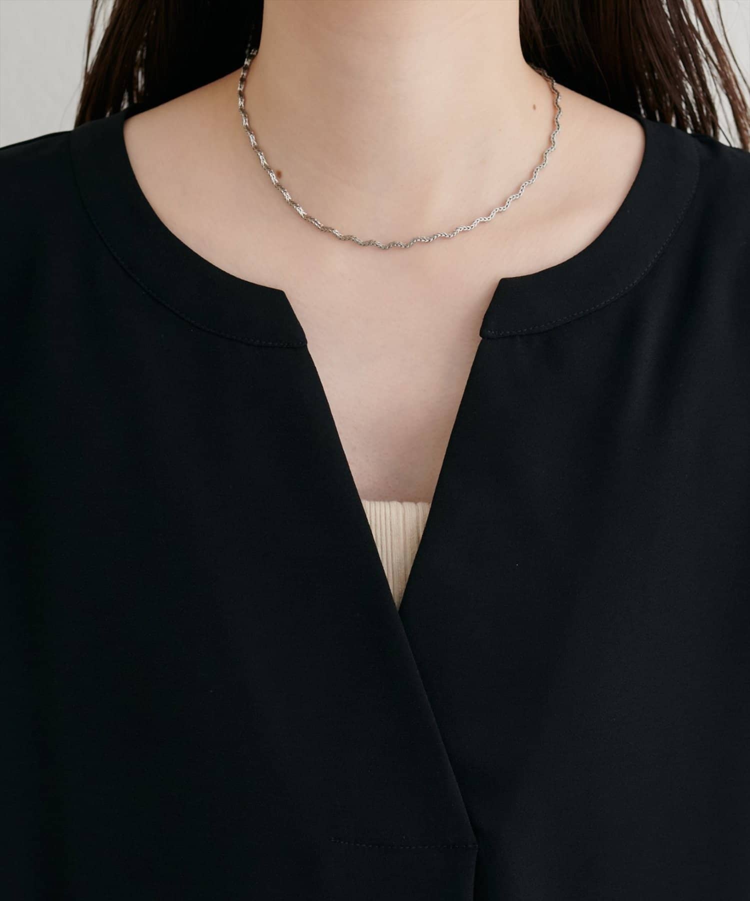 深すぎないVネックは、デコルテを美しく見せつつ、上品さをキープ。