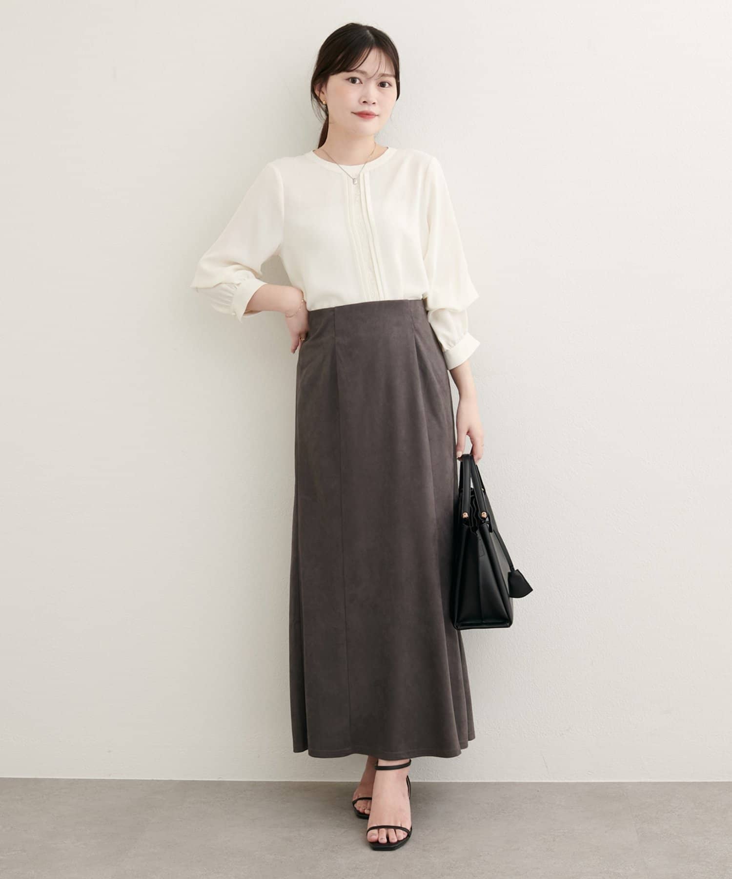 ボトムスはテーパードパンツやタイトスカートで、きちんと感を演出。