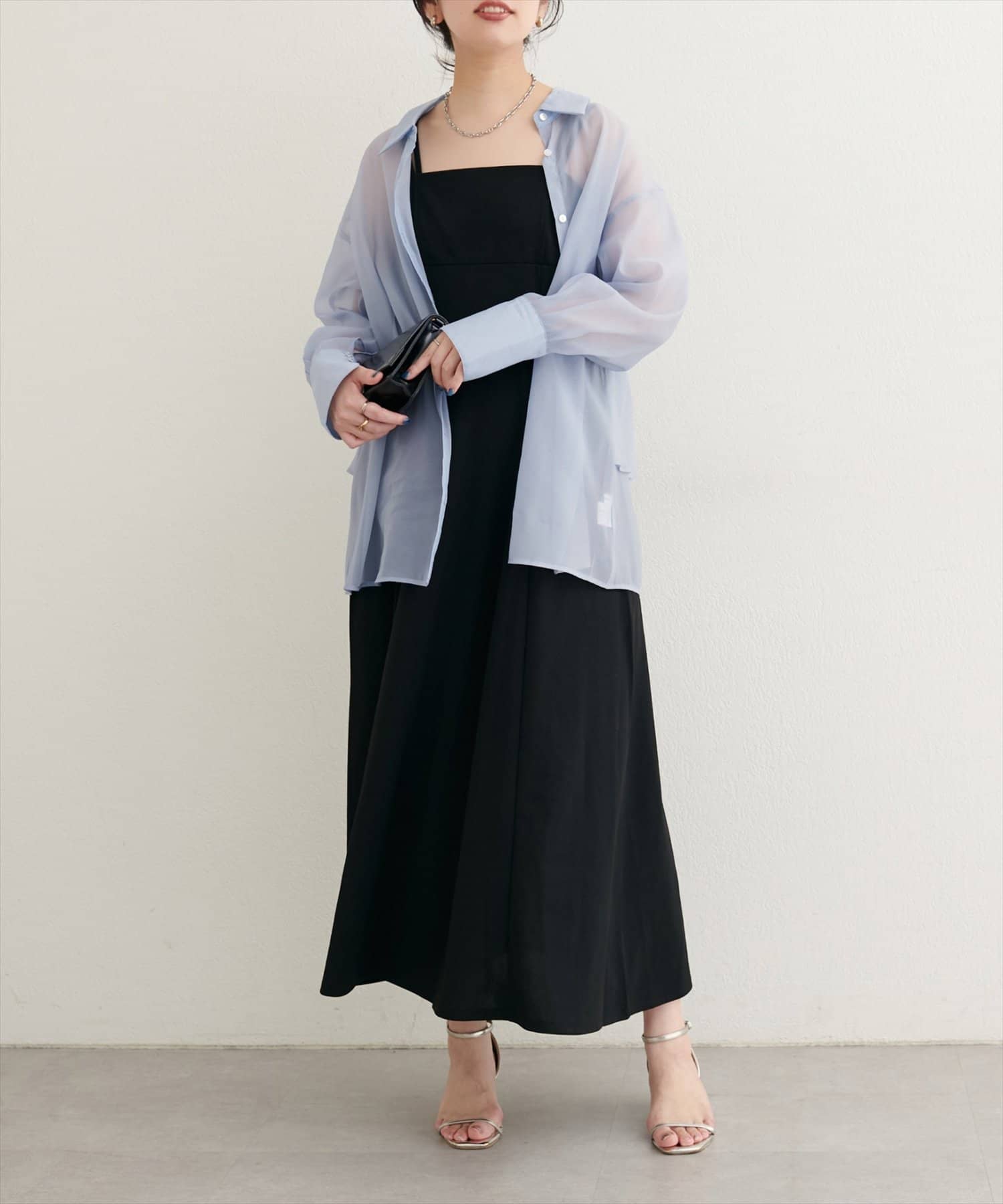 キャミワンピースや華奢見えするインナーなどとレイヤードするのがおすすめ。