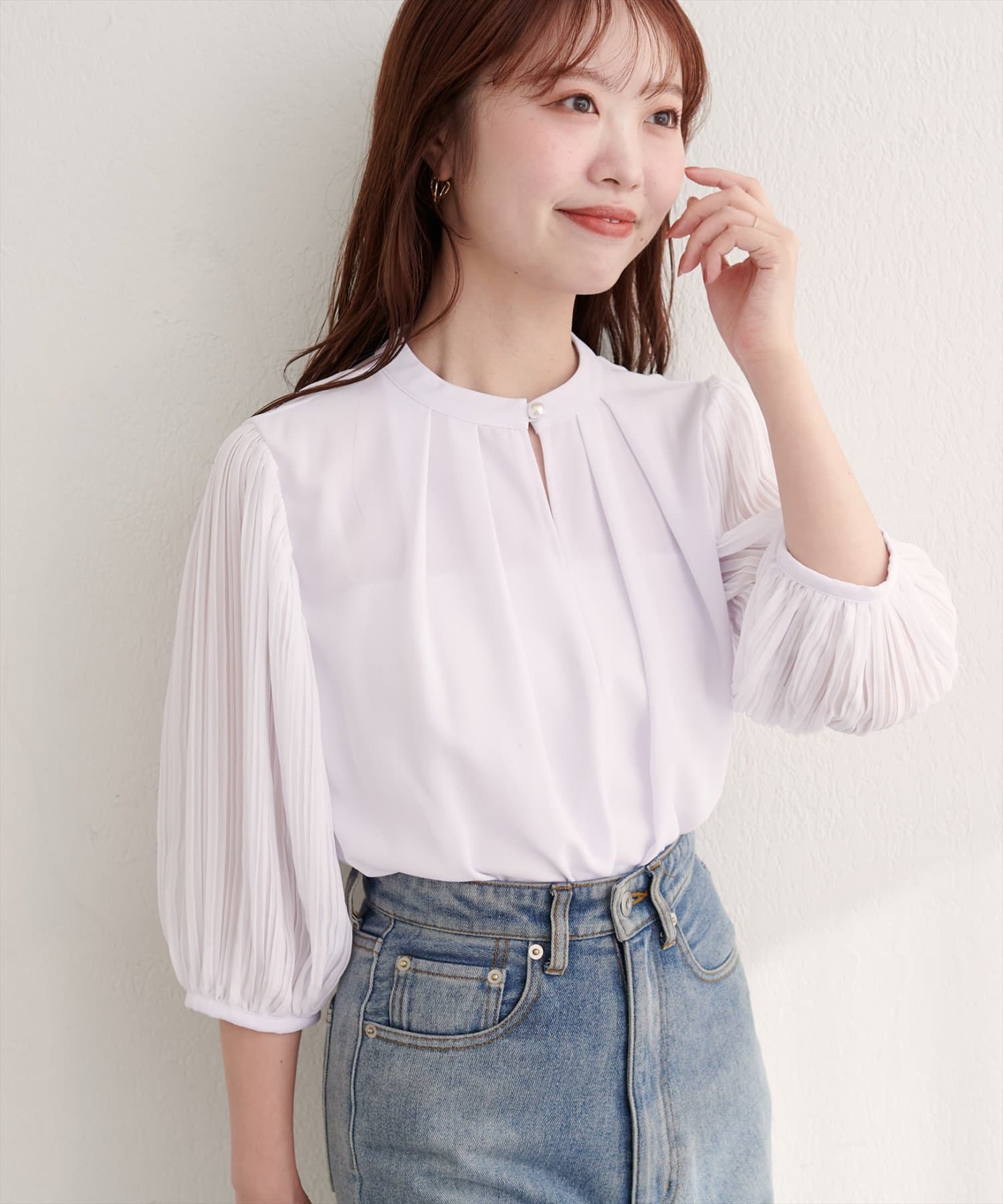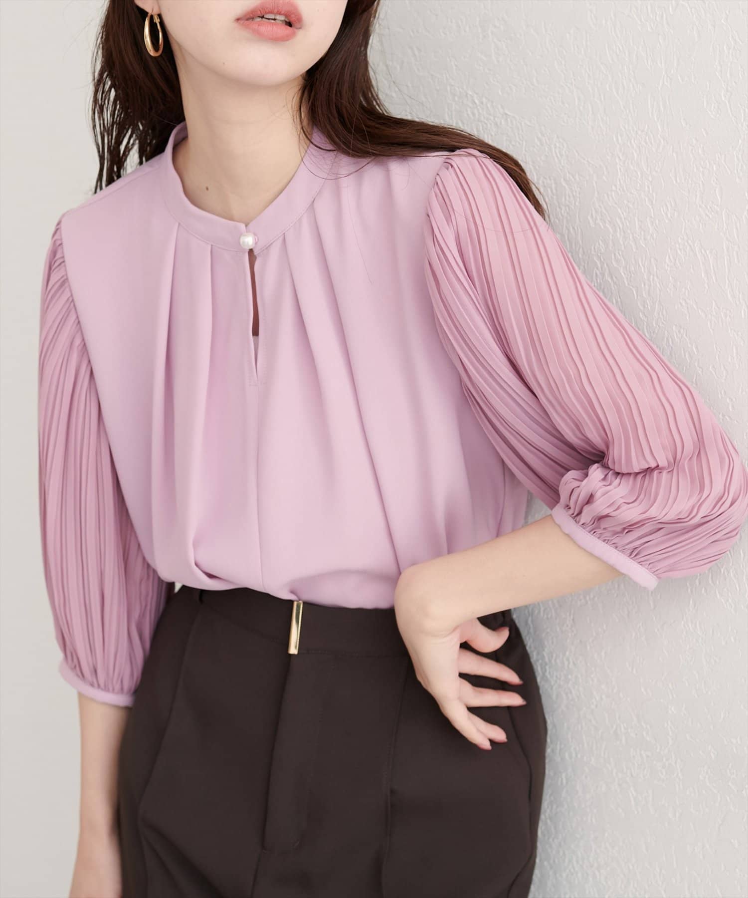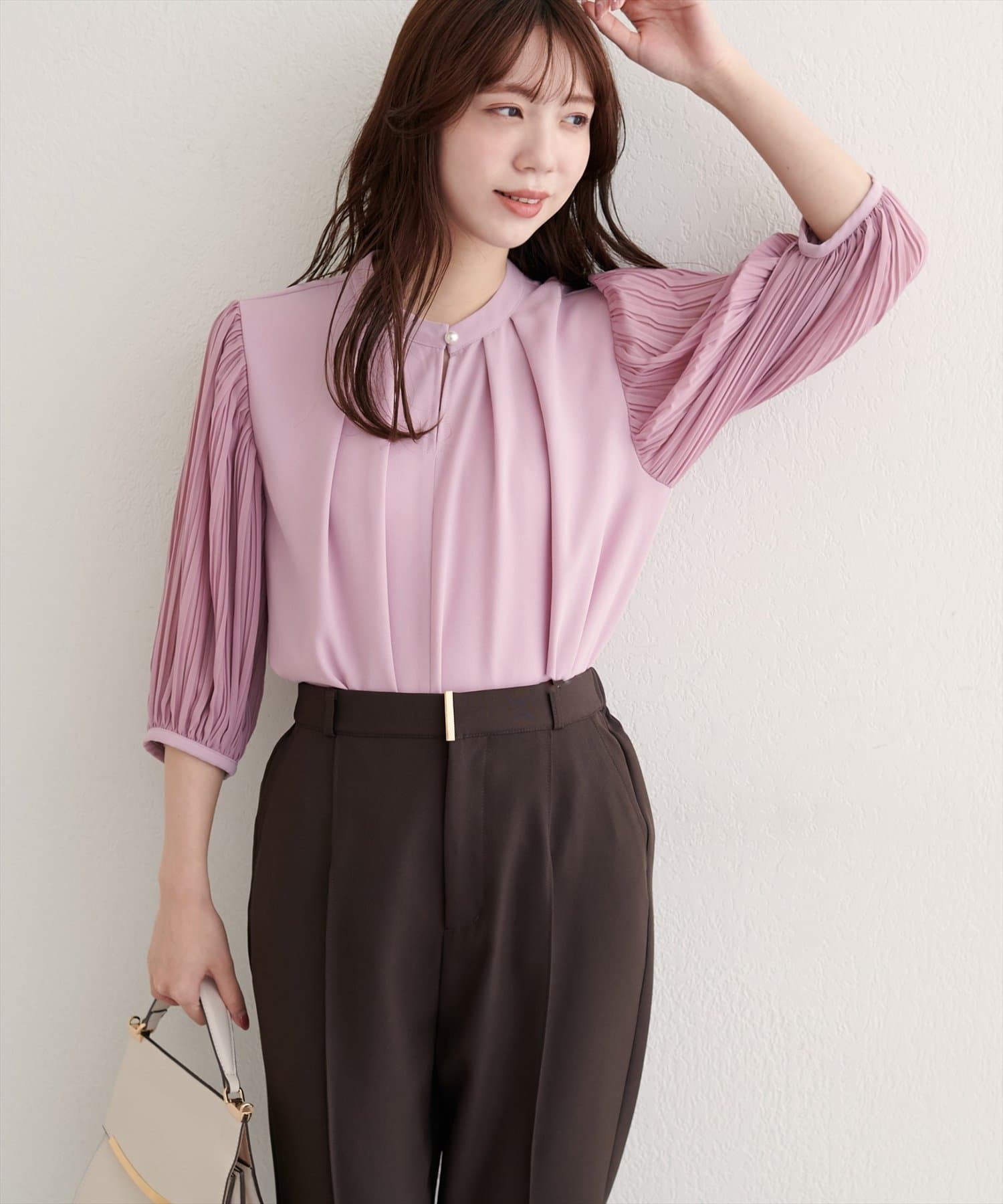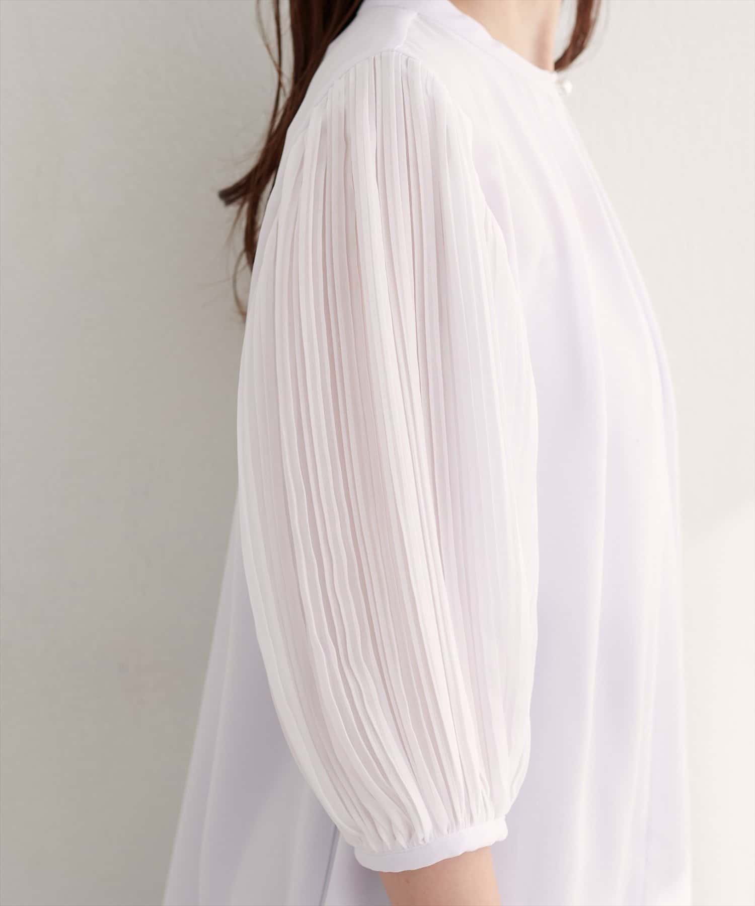 ふんわりと優しい印象のブラウスに、目を奪われるプリーツスリーブをあしらった、フェミニンな1枚。