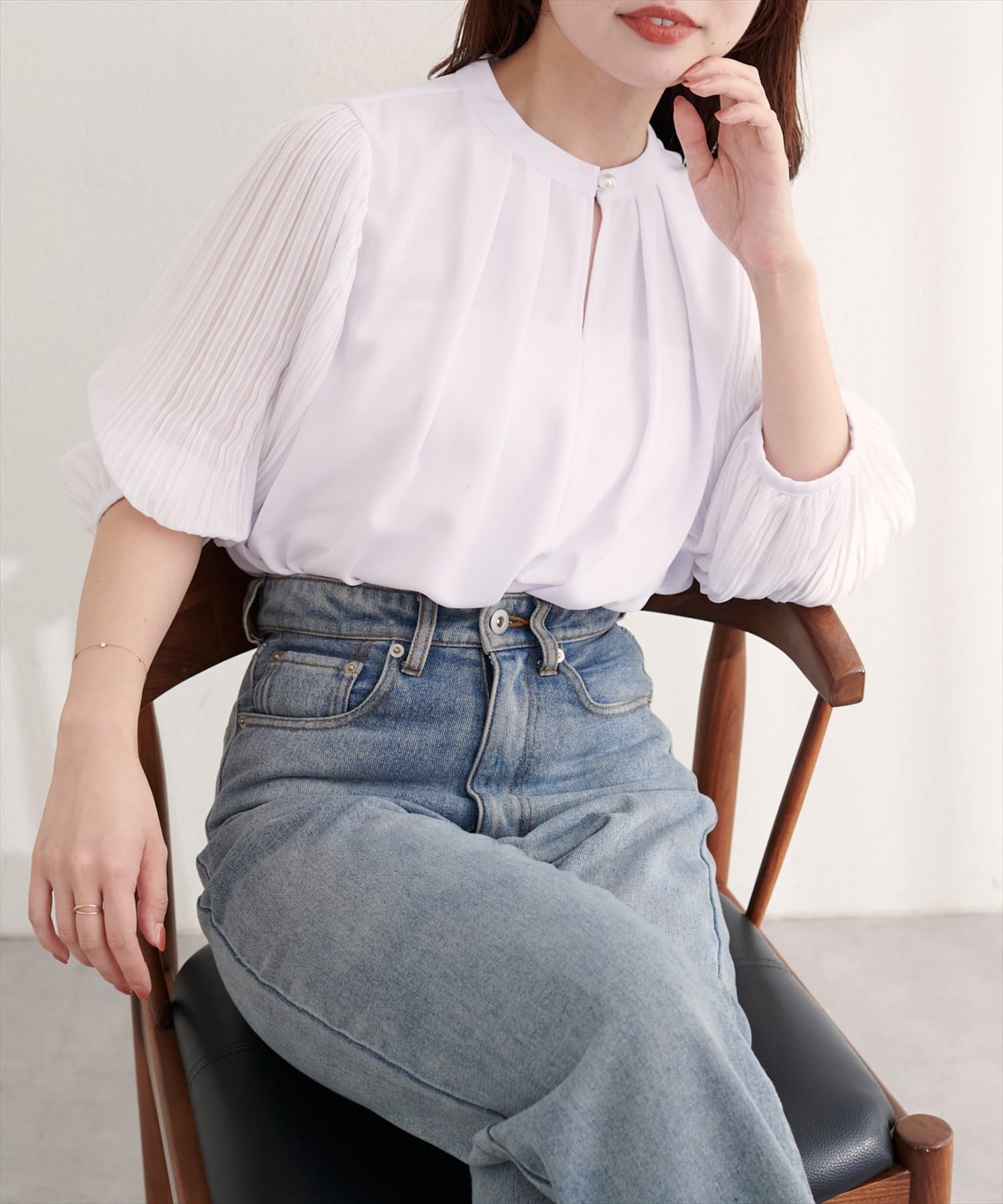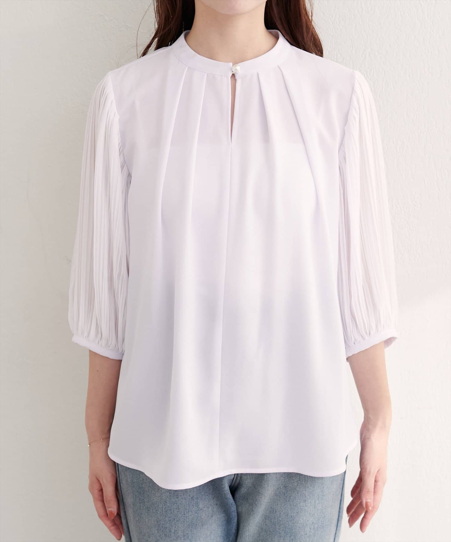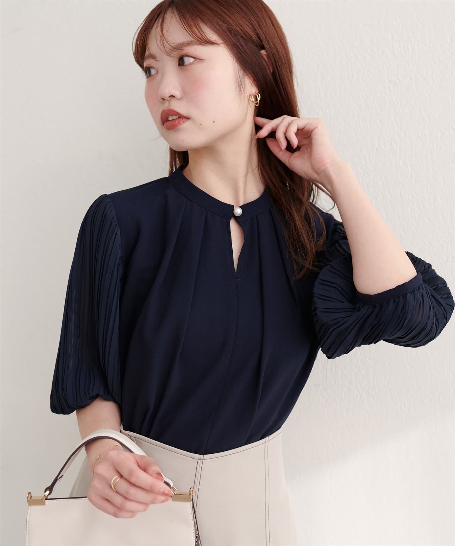 ふんわりと優しい印象のブラウスに、目を奪われるプリーツスリーブをあしらった、フェミニンな1枚。