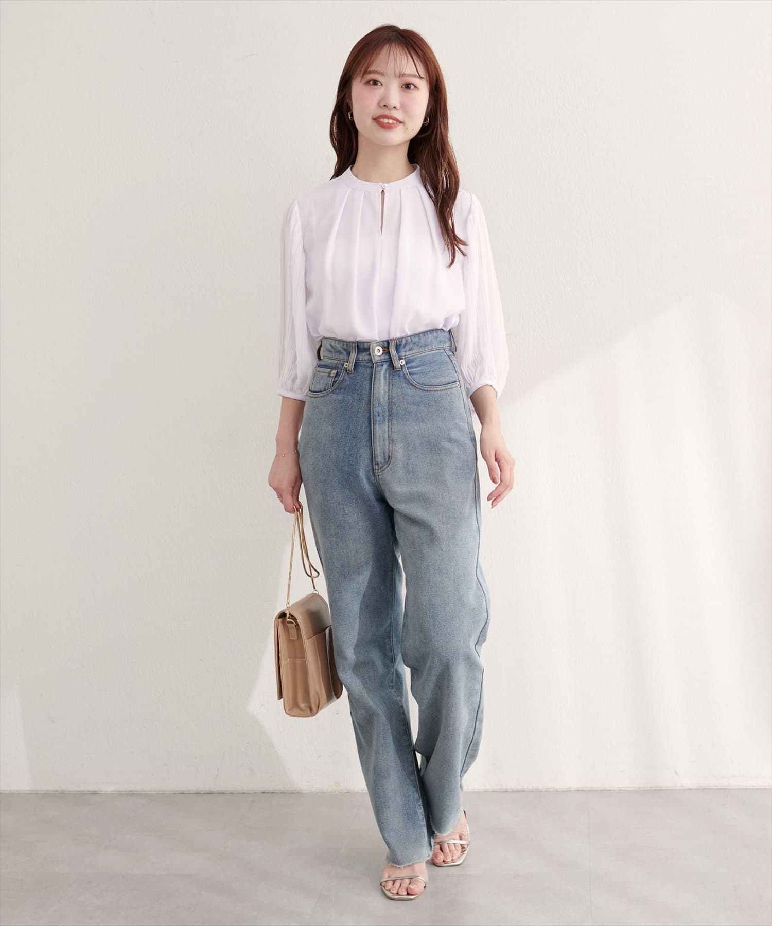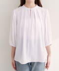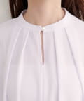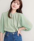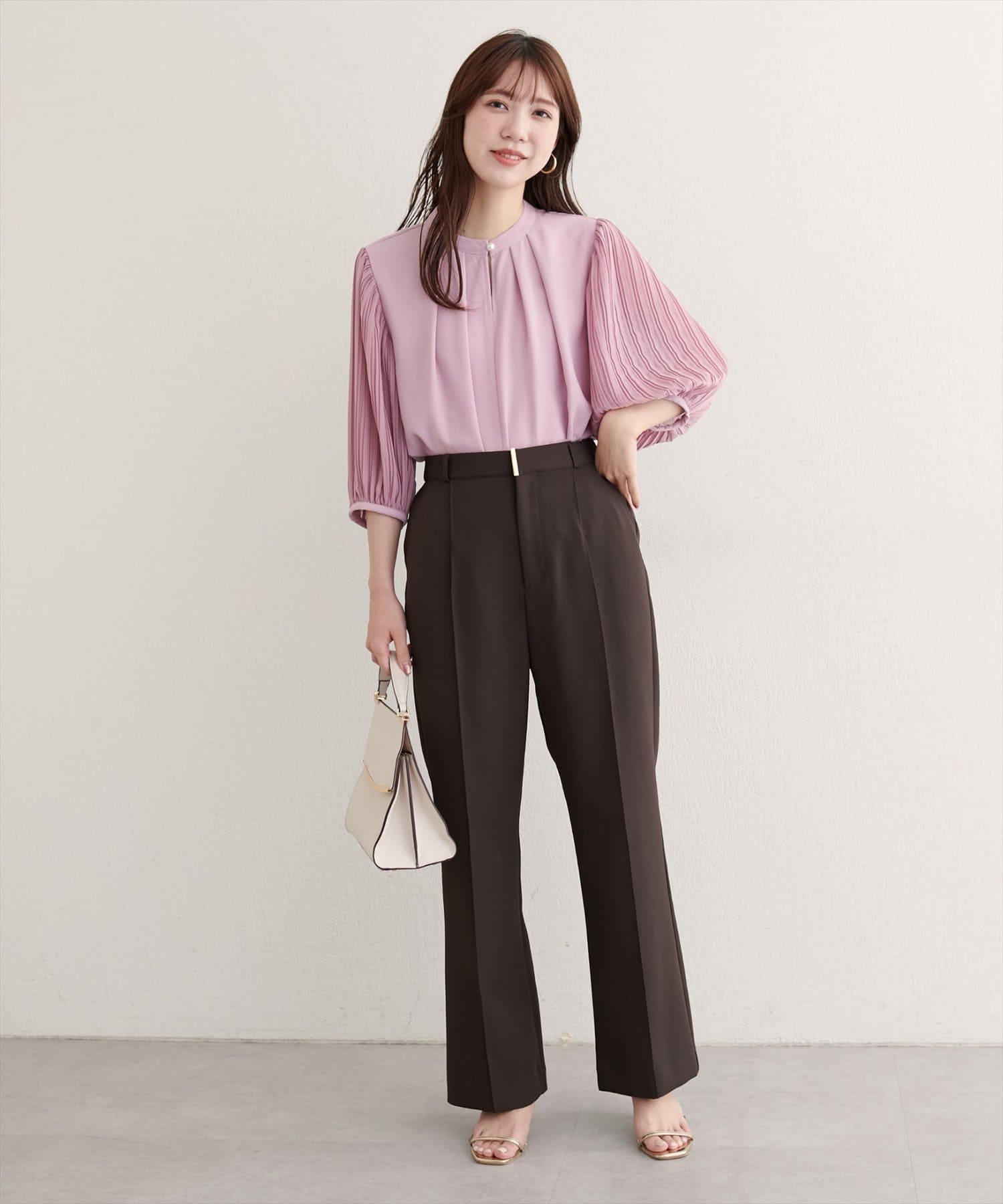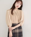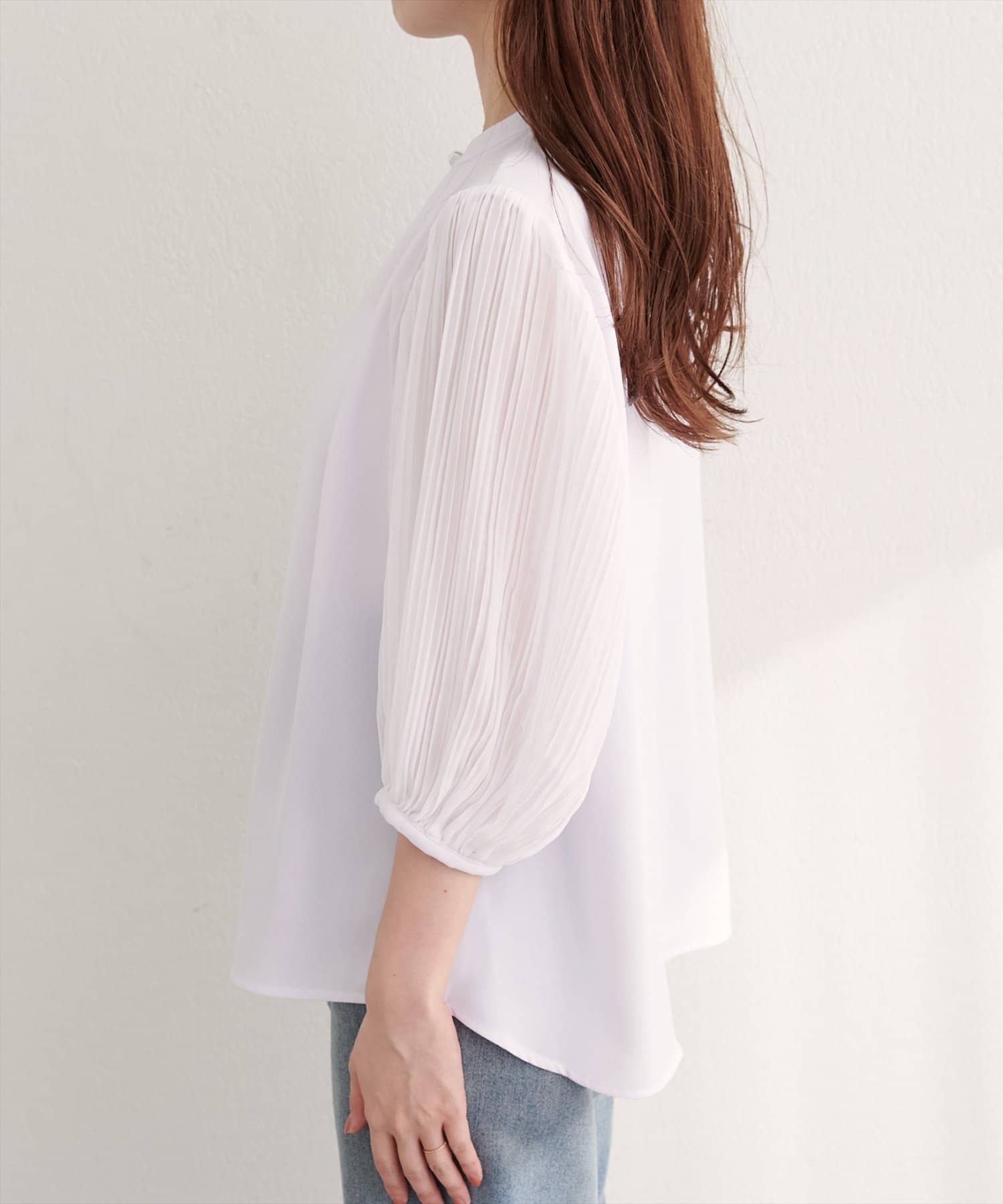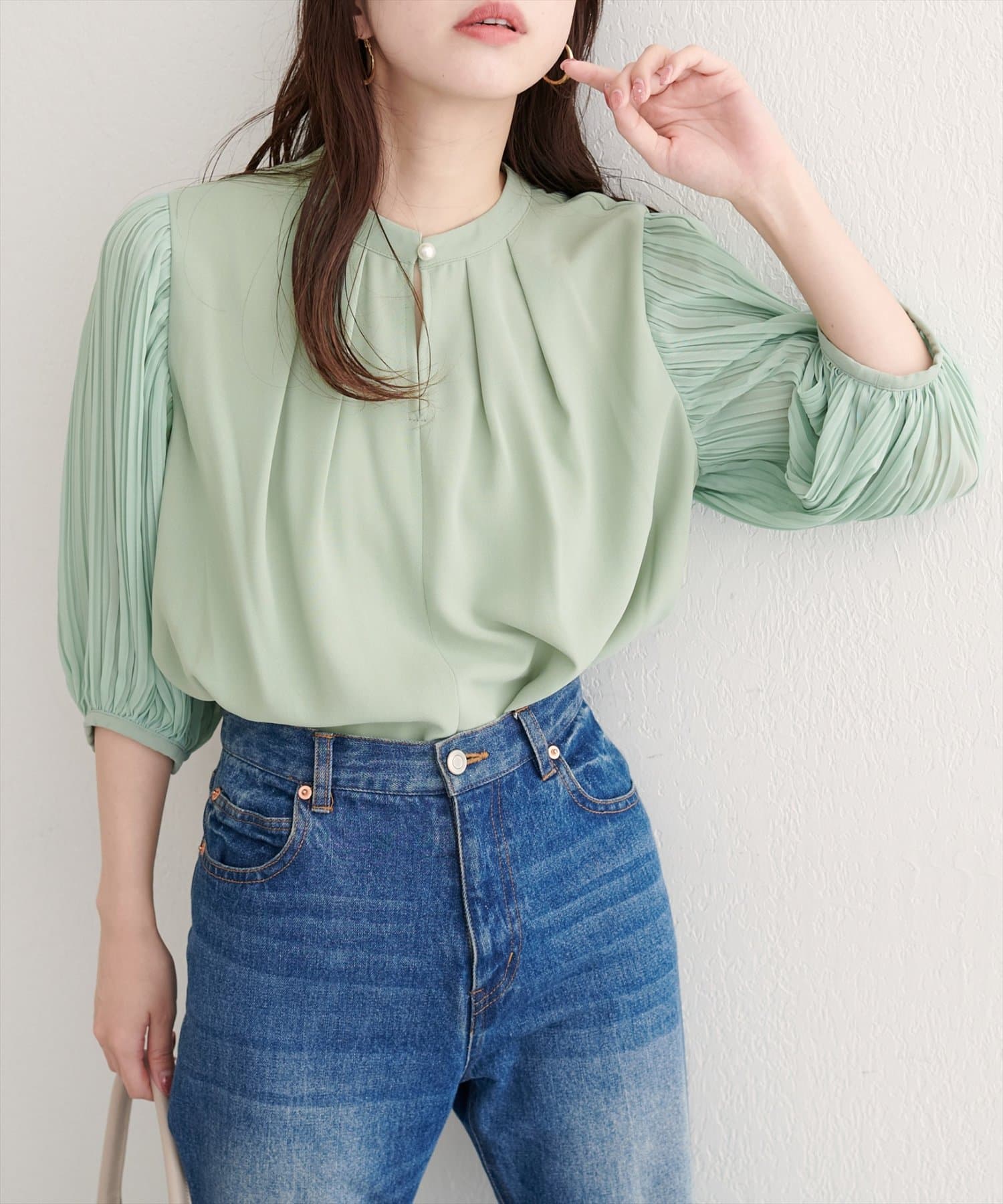 ふんわりと優しい印象のブラウスに、目を奪われるプリーツスリーブをあしらった、フェミニンな1枚。