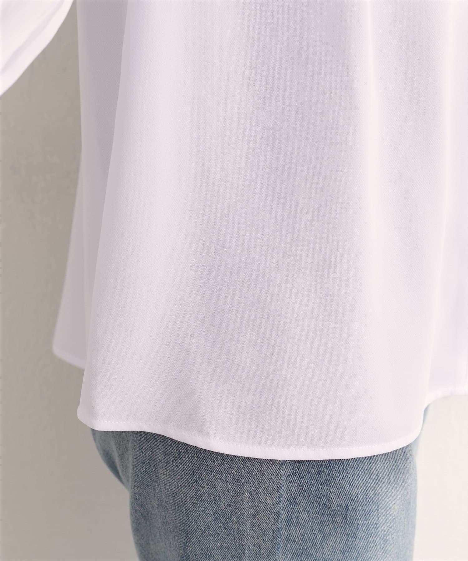 首元にあしらわれたパール調のボタンが、さりげないアクセント。