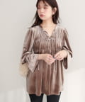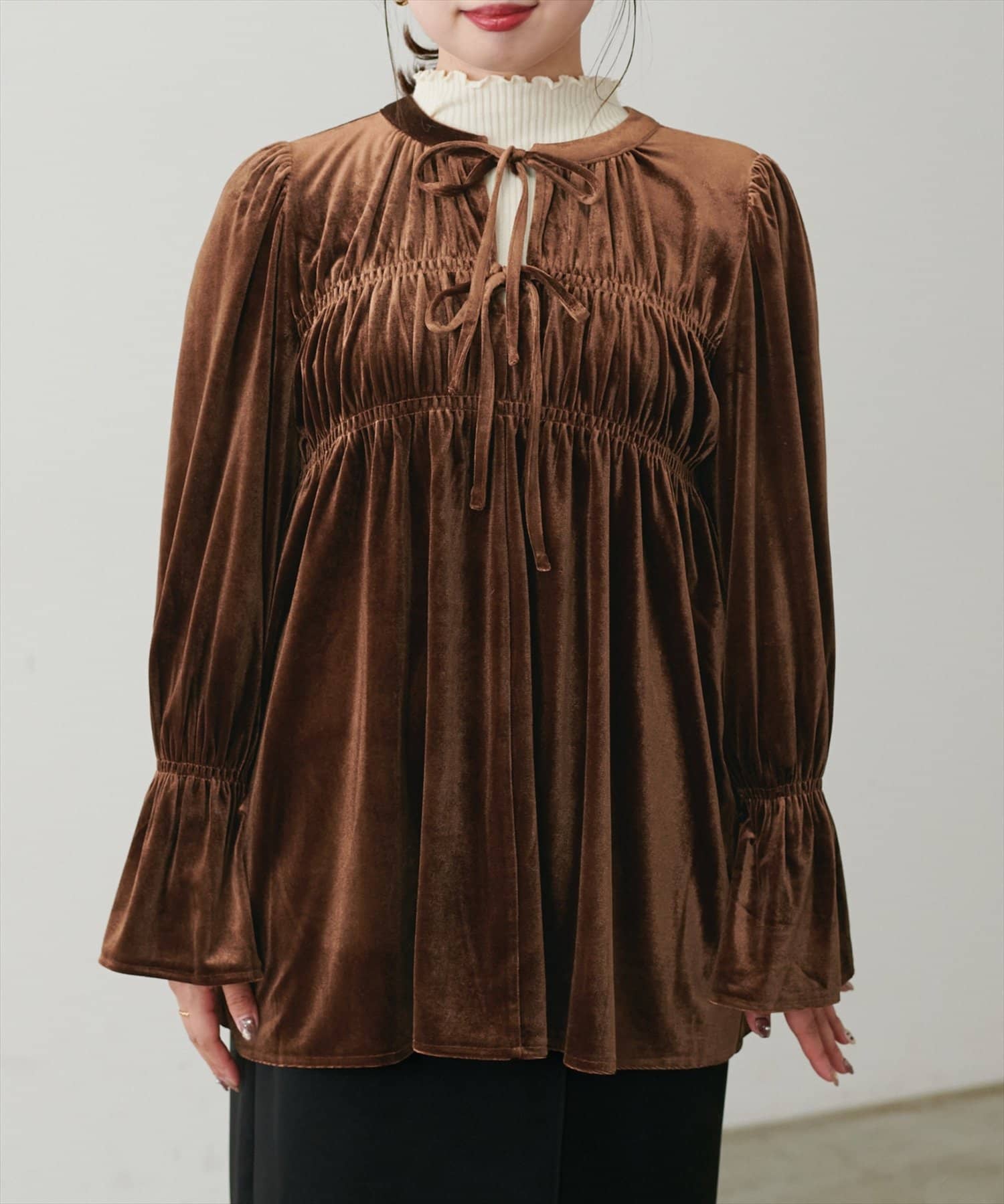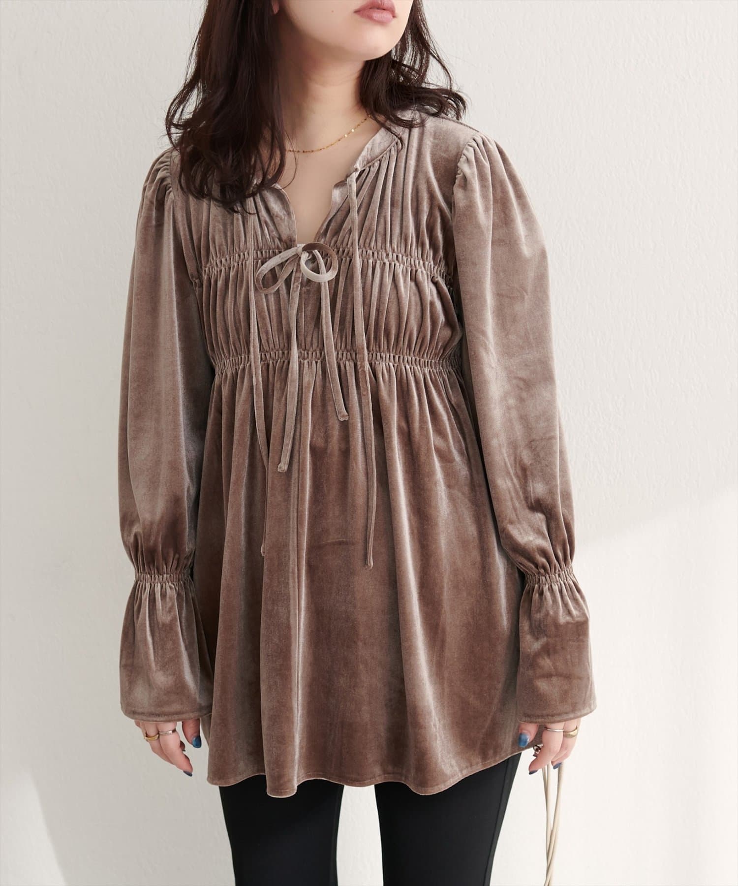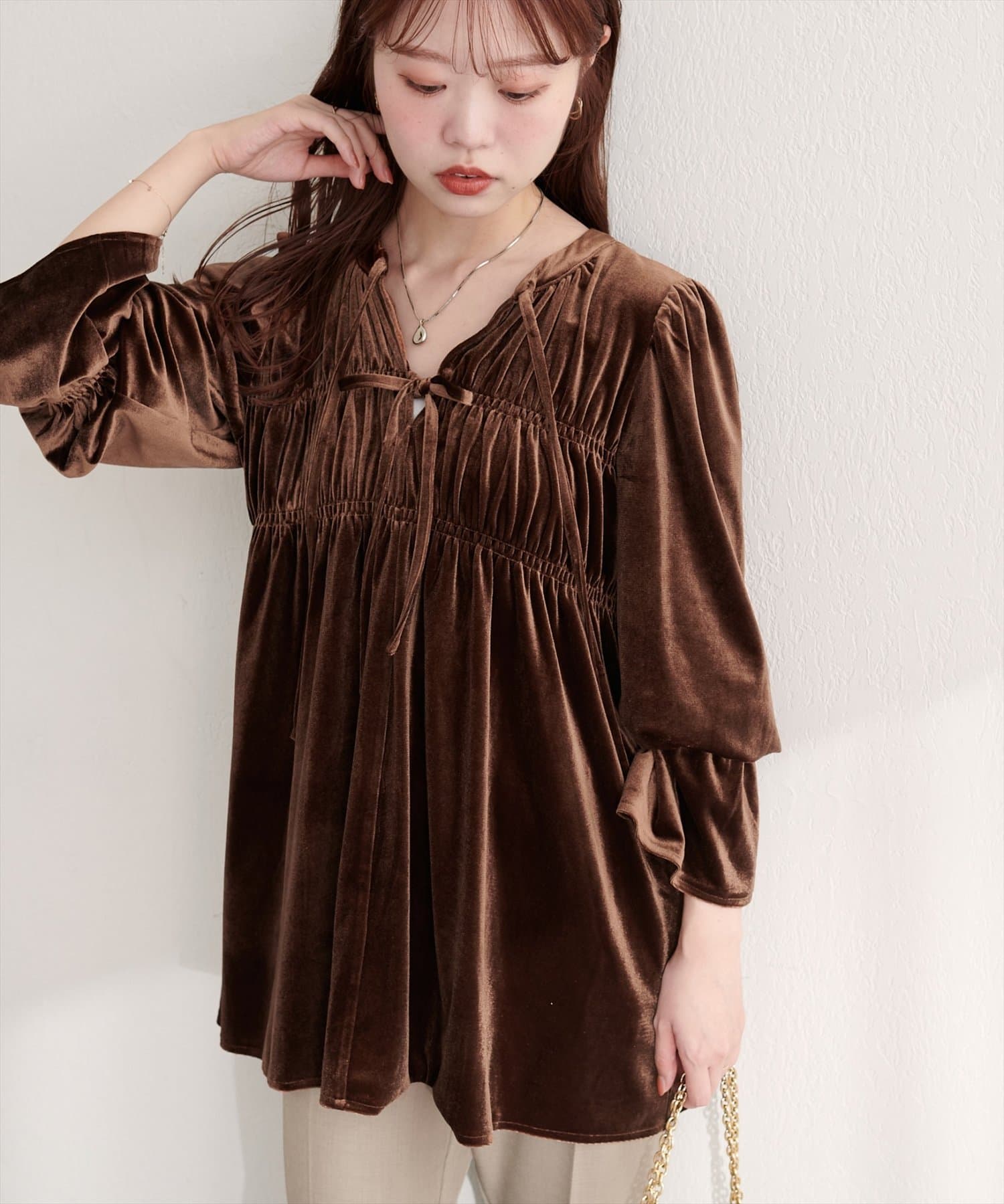 シャーリングデザインとフロントのリボンがポイントのベロアトップス。